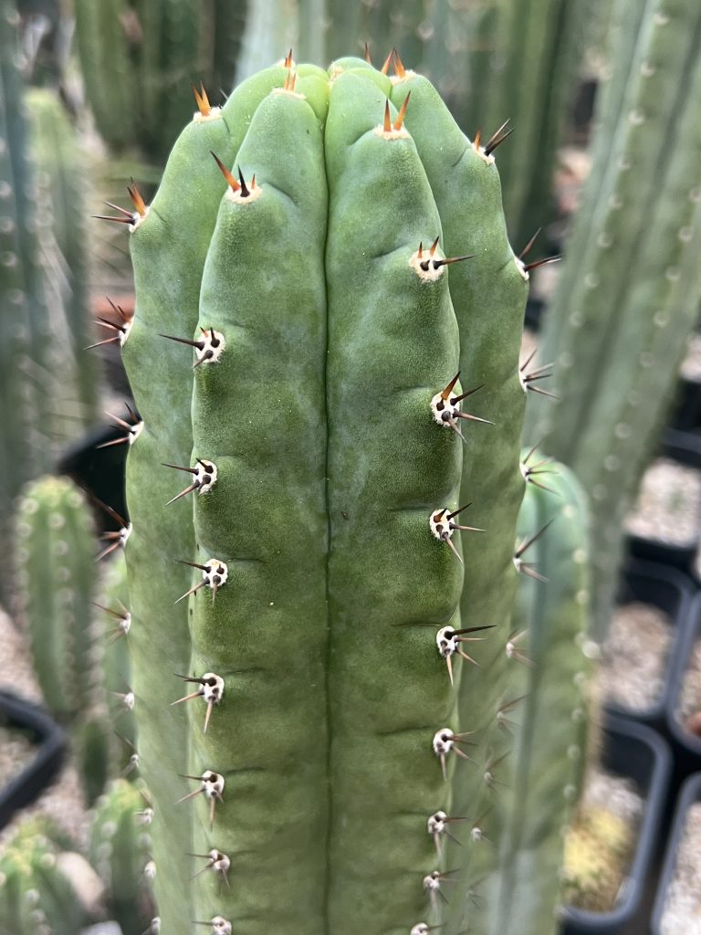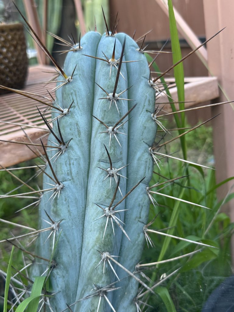 Geebee blue T. peruvianus clone named after The Grateful Dead song. a well known clone for its deep powdery blue glaucous coating, while also surprisingly growing a single spined look to it. The radial spines are still evident, but they seem to stay fairly short. In some shaded gardens the central spines are almost not evident causing some folks to think of it as being a short spined peruvianus. Give it direct sun more regularly and the spines can still be 2-3 inches long.