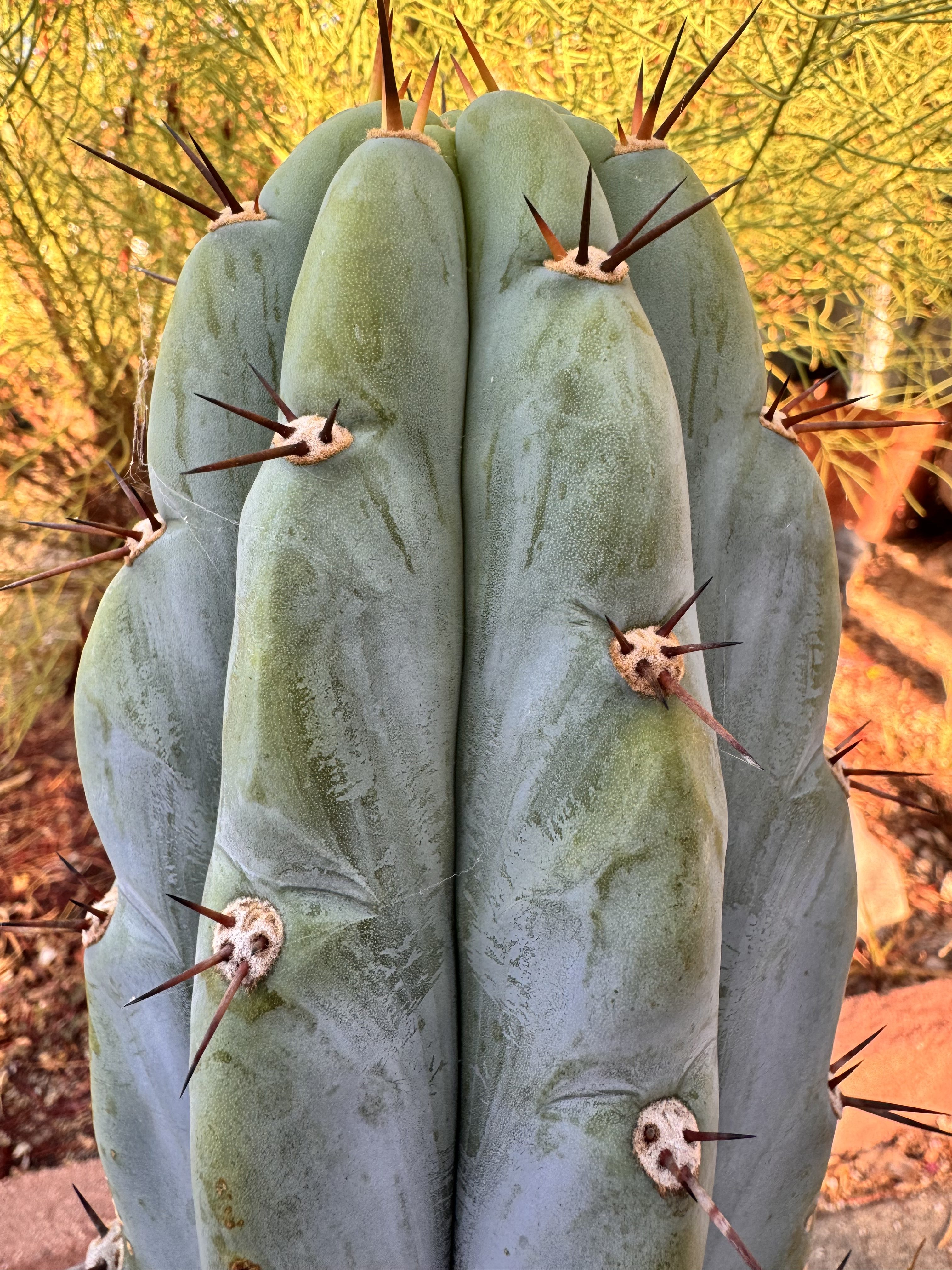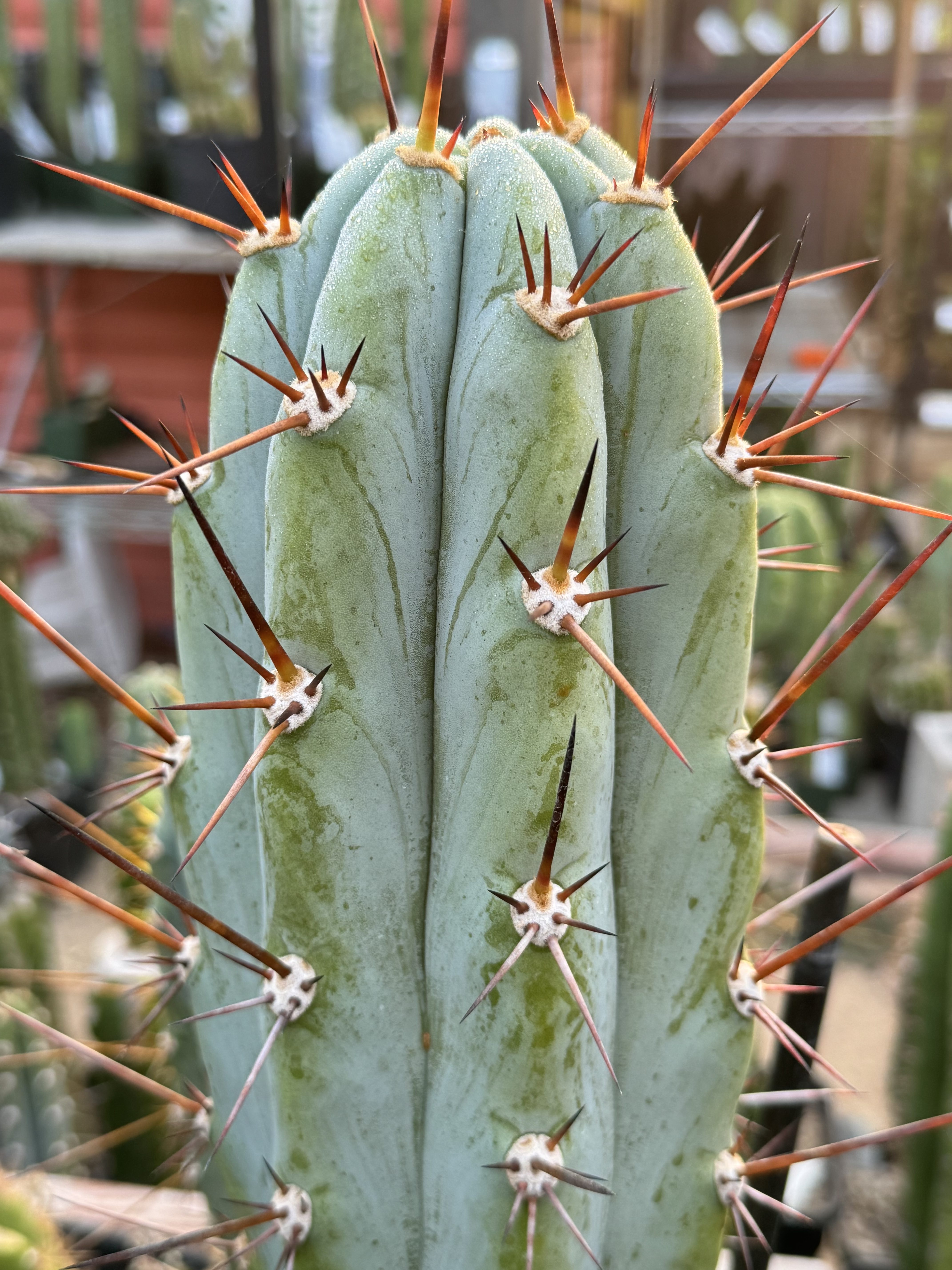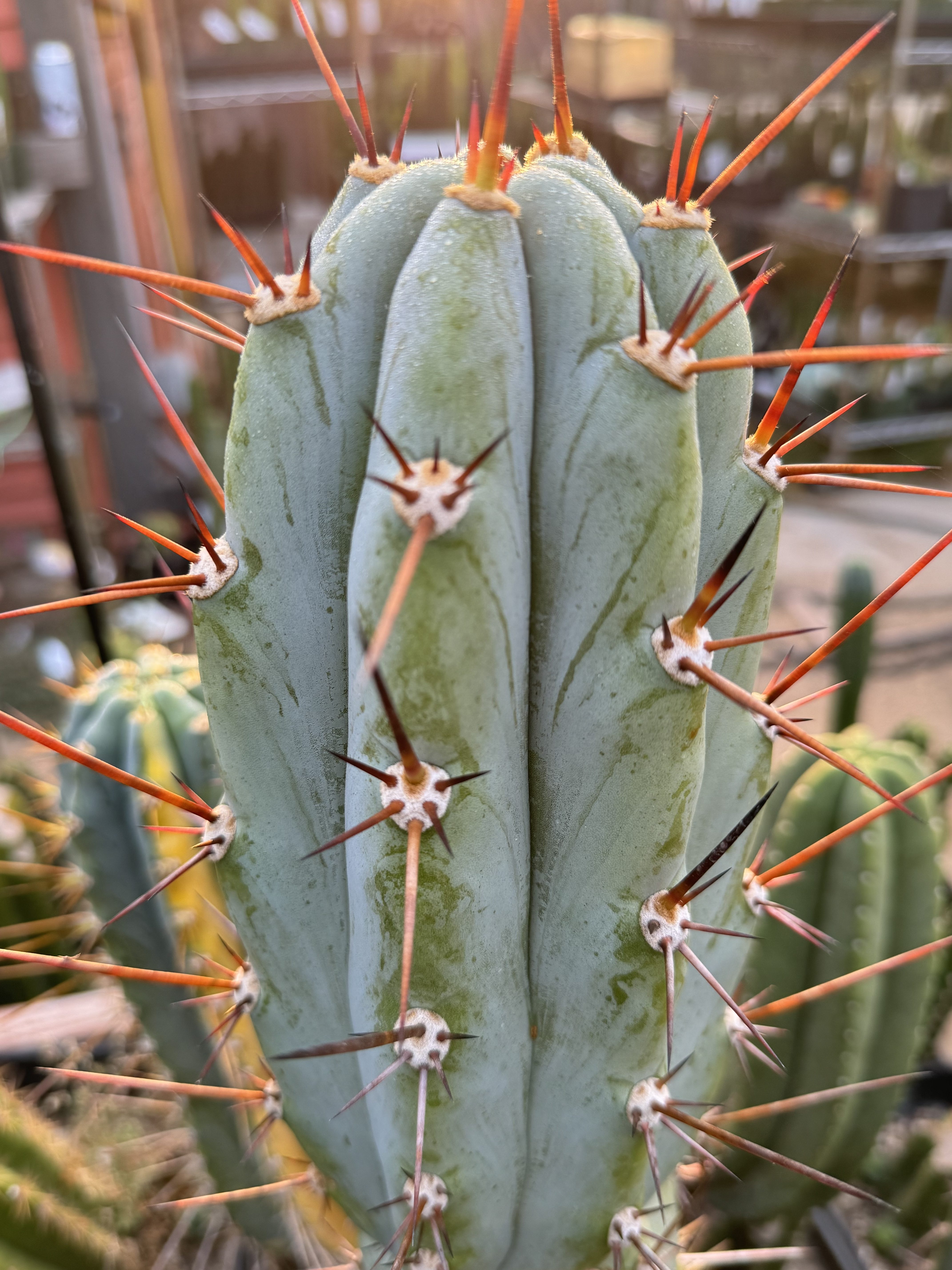 There is something different about this phenotype expression in Arid Art Macrogonus. The way the reddish spines express in colder weather, and how far and separated the areoles are vertically make for some very exposed glaucous blue wax. It’s such a gorgeous contrast of colors, it has to be at the top of the list of any peruvianus collector. I love it so much all I’ve been doing is rooting them. I have four of them rooted now I love it so much. These will be the first two I’ve ever offered.