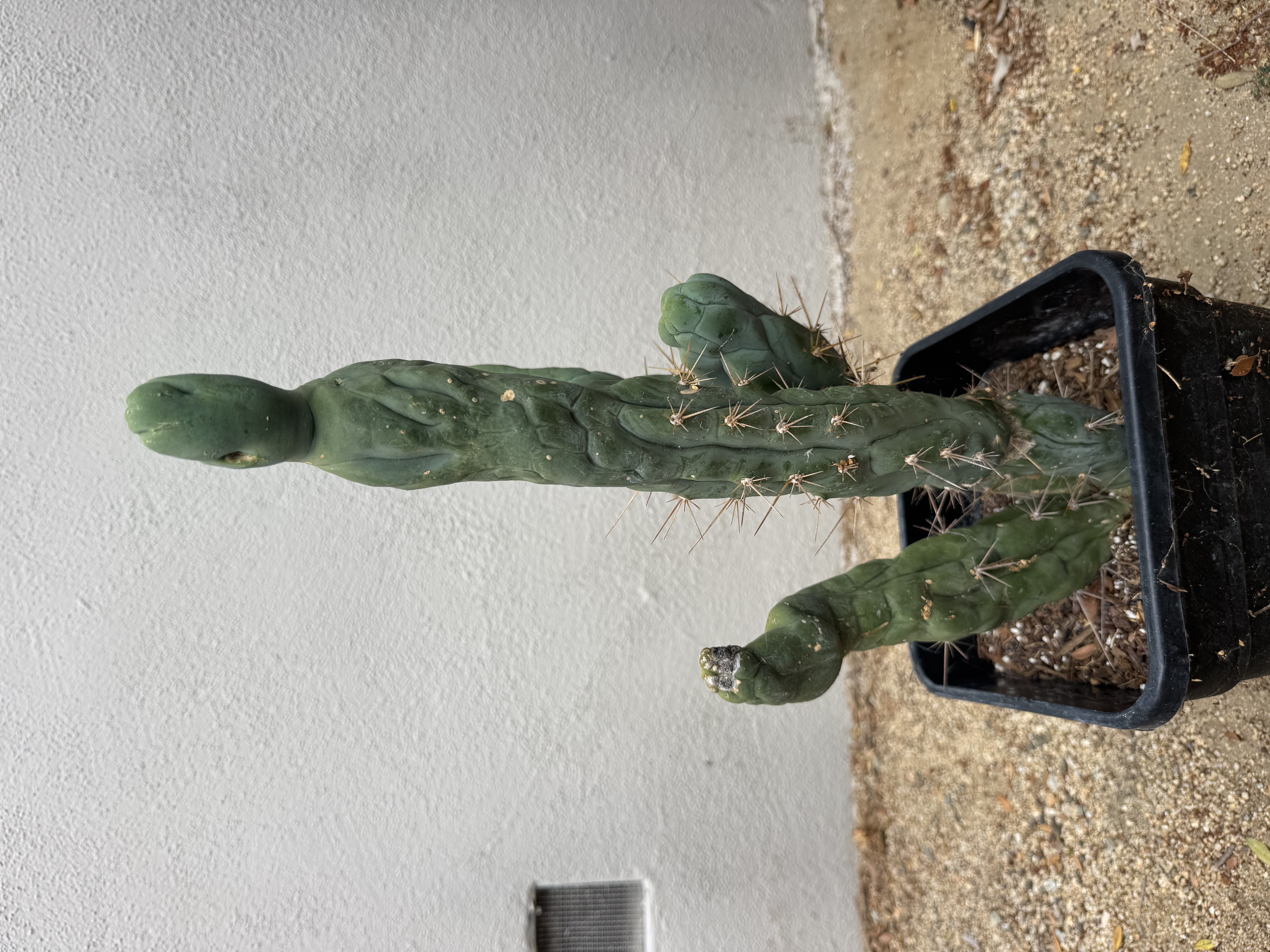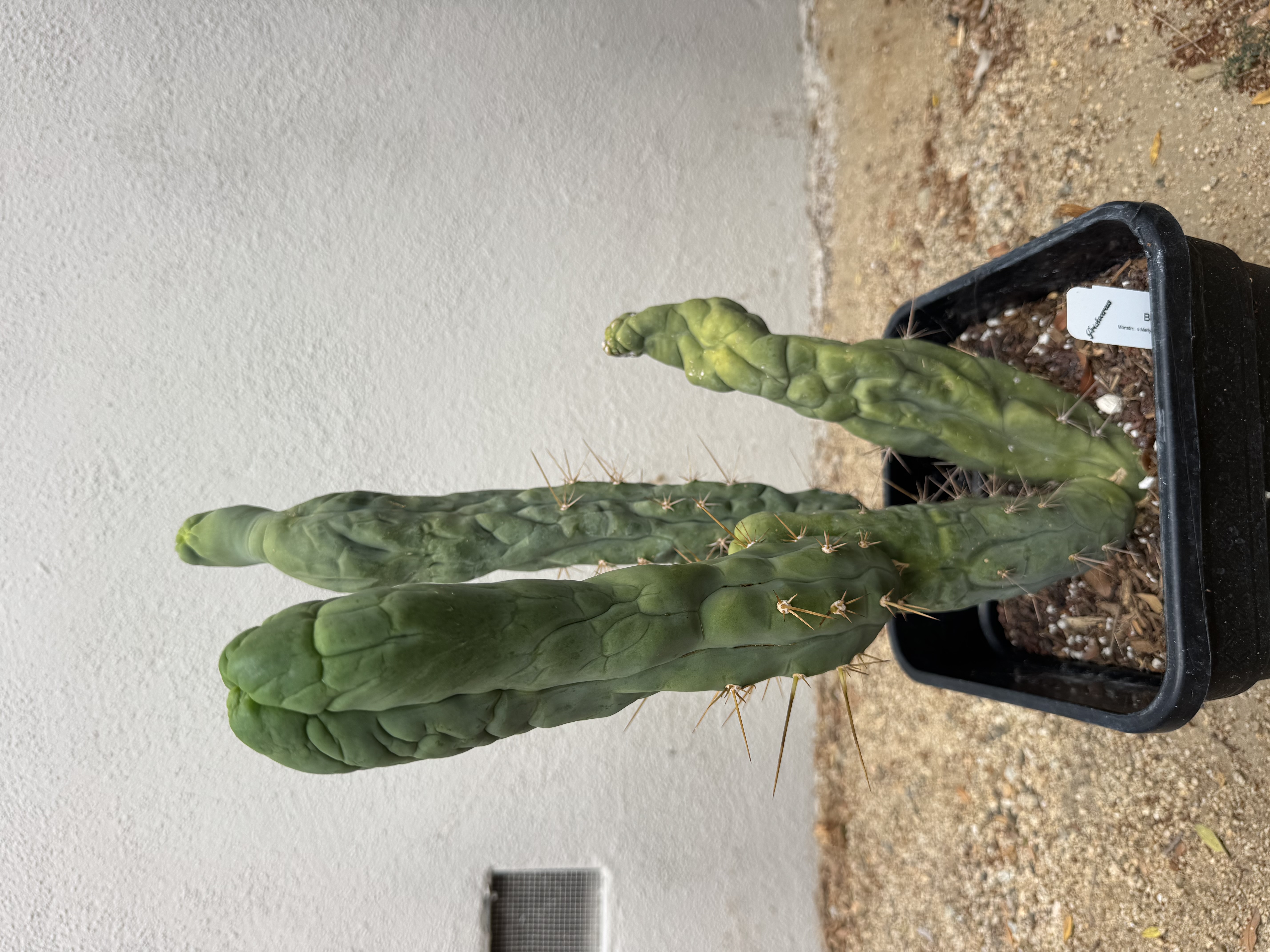 Bruce’s Dragon is a T. peruvianus hybrid showing monstrose genetics.  It’s a very interesting monstrose form that comes from San Diego.  Sometimes spineless, and other times it shows nice heavy spination. One of the best monstrose forms out there that grows much more tolerant to humid environments than some pure bridgesii. These spineless tipped plants will offset somewhat sporadically with more areoles.  It was named after the grower Bruce who actually grew Dracaena drago trees, hence Bruce’s Dragon.