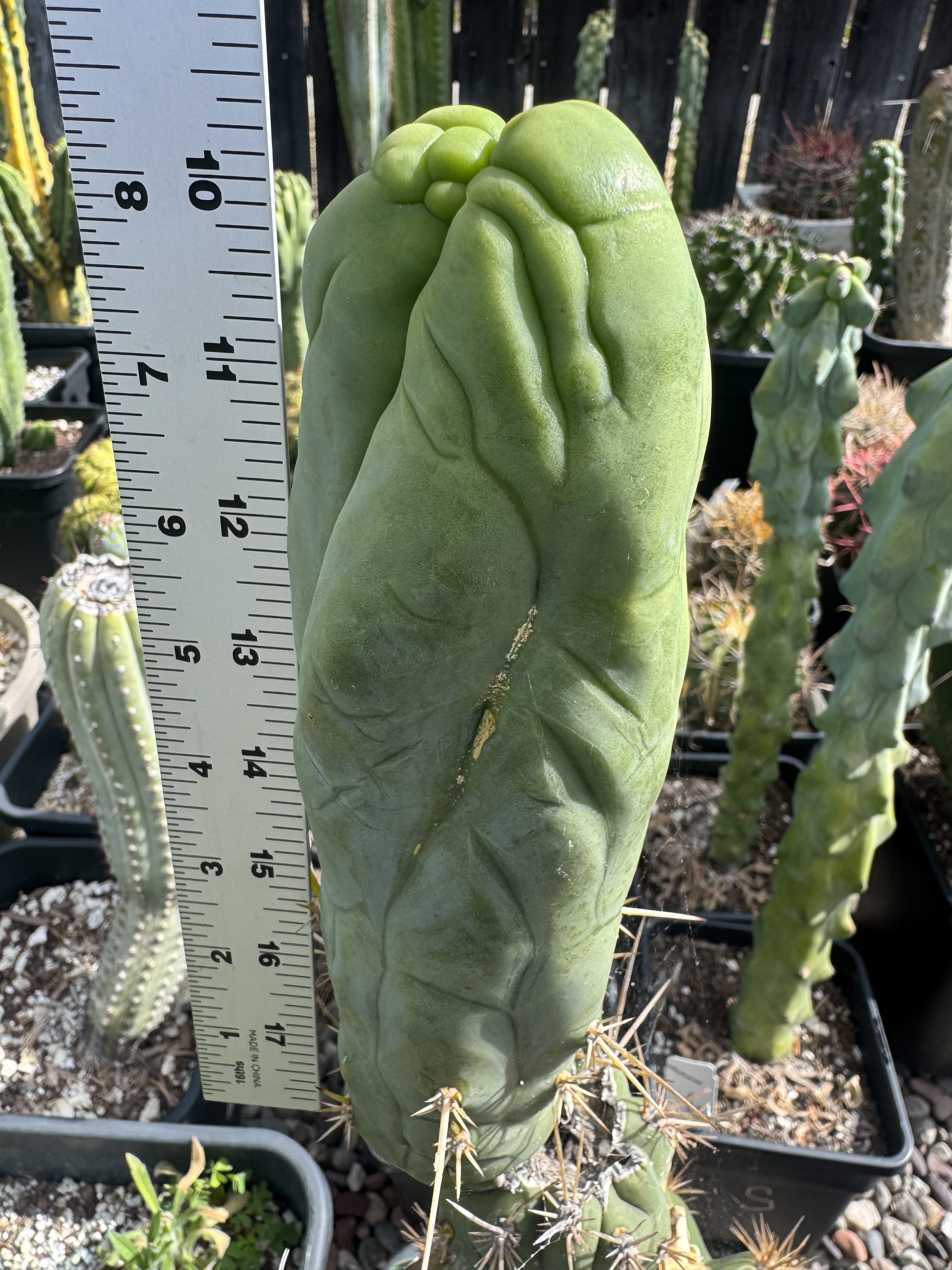 Bruce’s Dragon is a T. peruvianus hybrid showing monstrose genetics.  It’s a very interesting monstrose form that comes from San Diego.  Sometimes spineless, and other times it shows nice heavy spination. One of the best monstrose forms out there that grows much more tolerant to humid environments than some pure bridgesii. These spineless tipped plants will offset somewhat sporadically with more areoles.  It was named after the grower Bruce who actually grew Dracaena drago trees, hence Bruce’s Dragon.