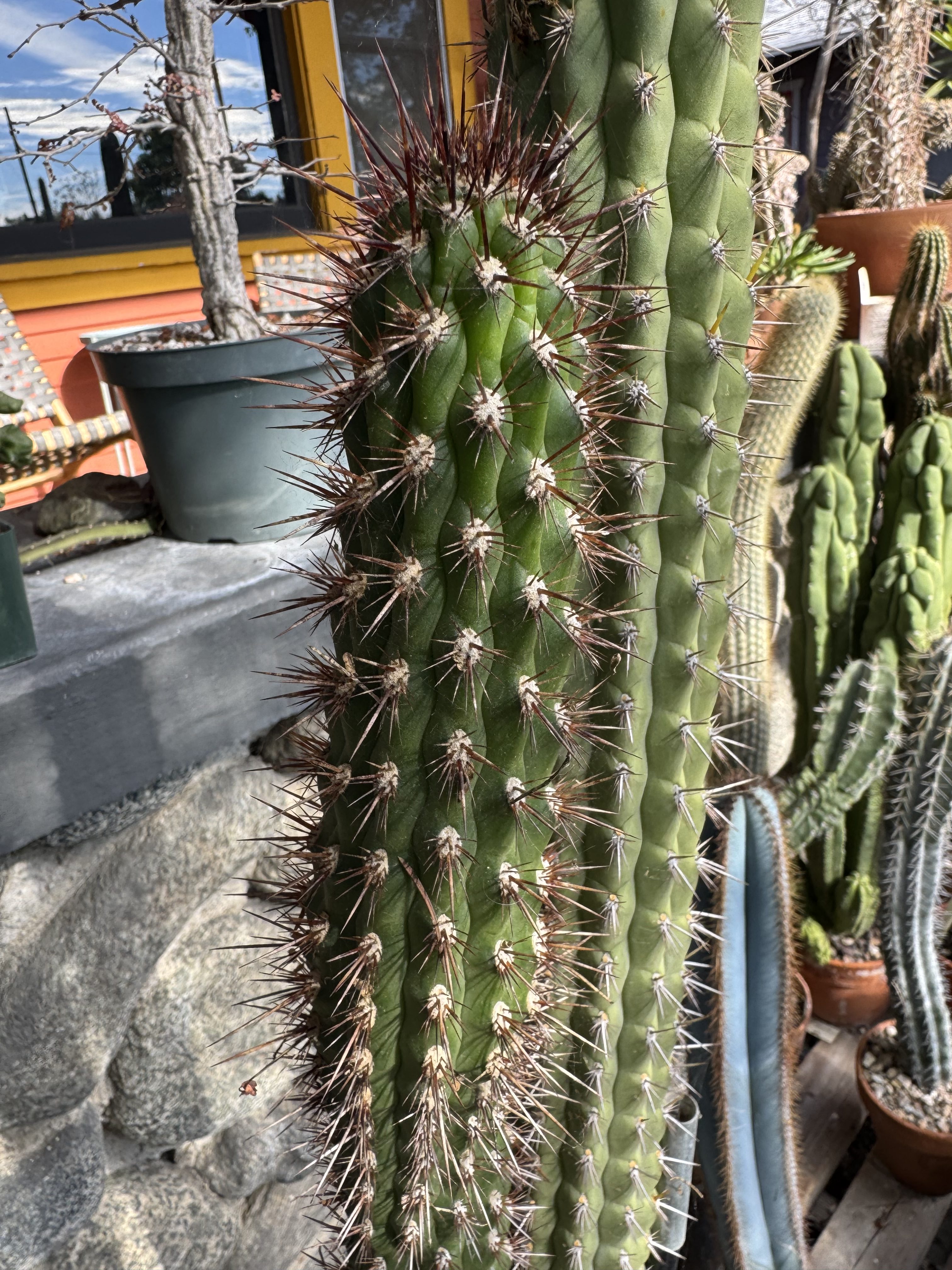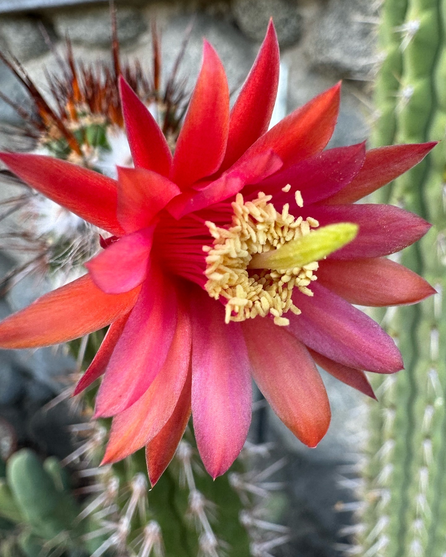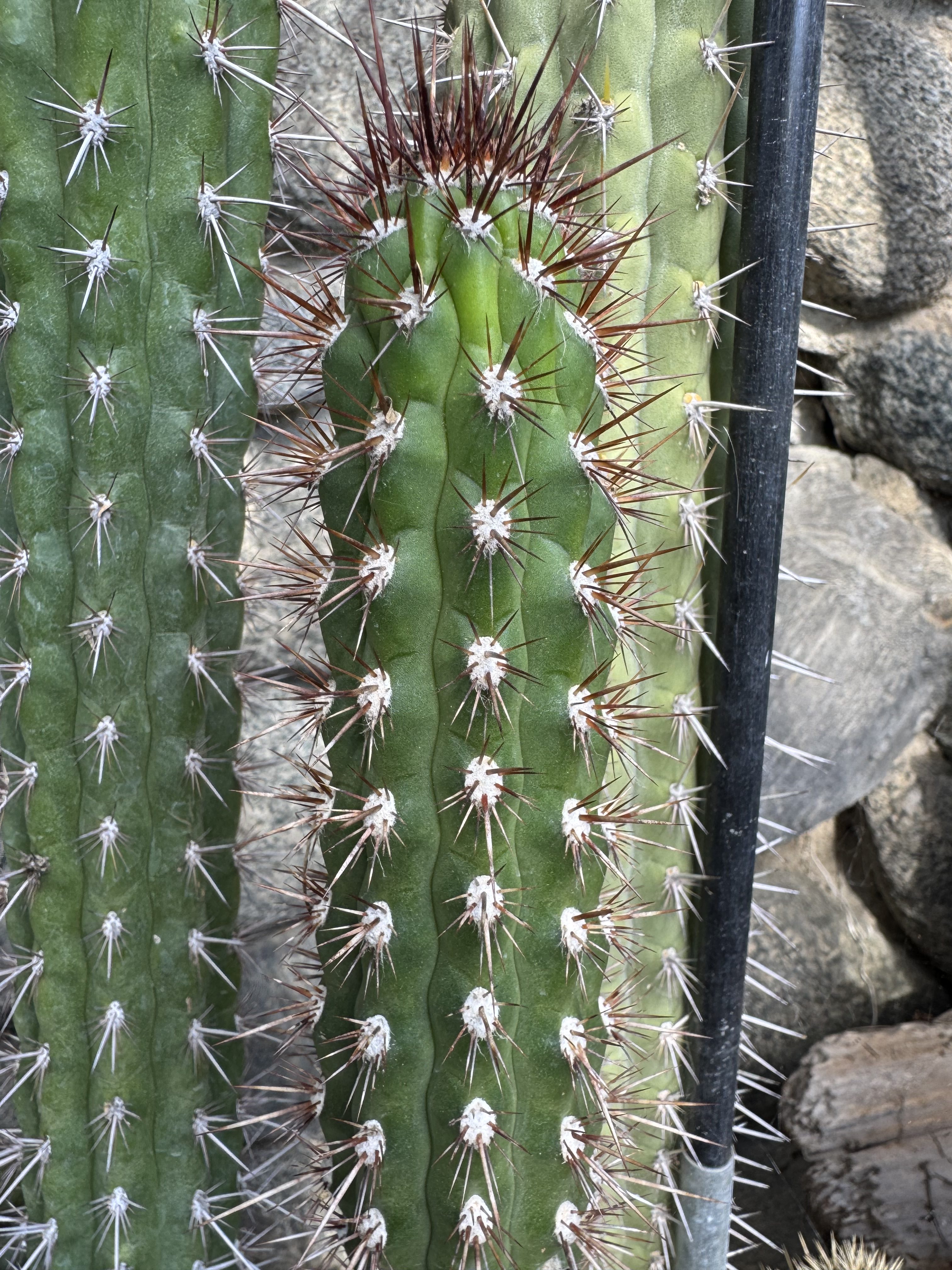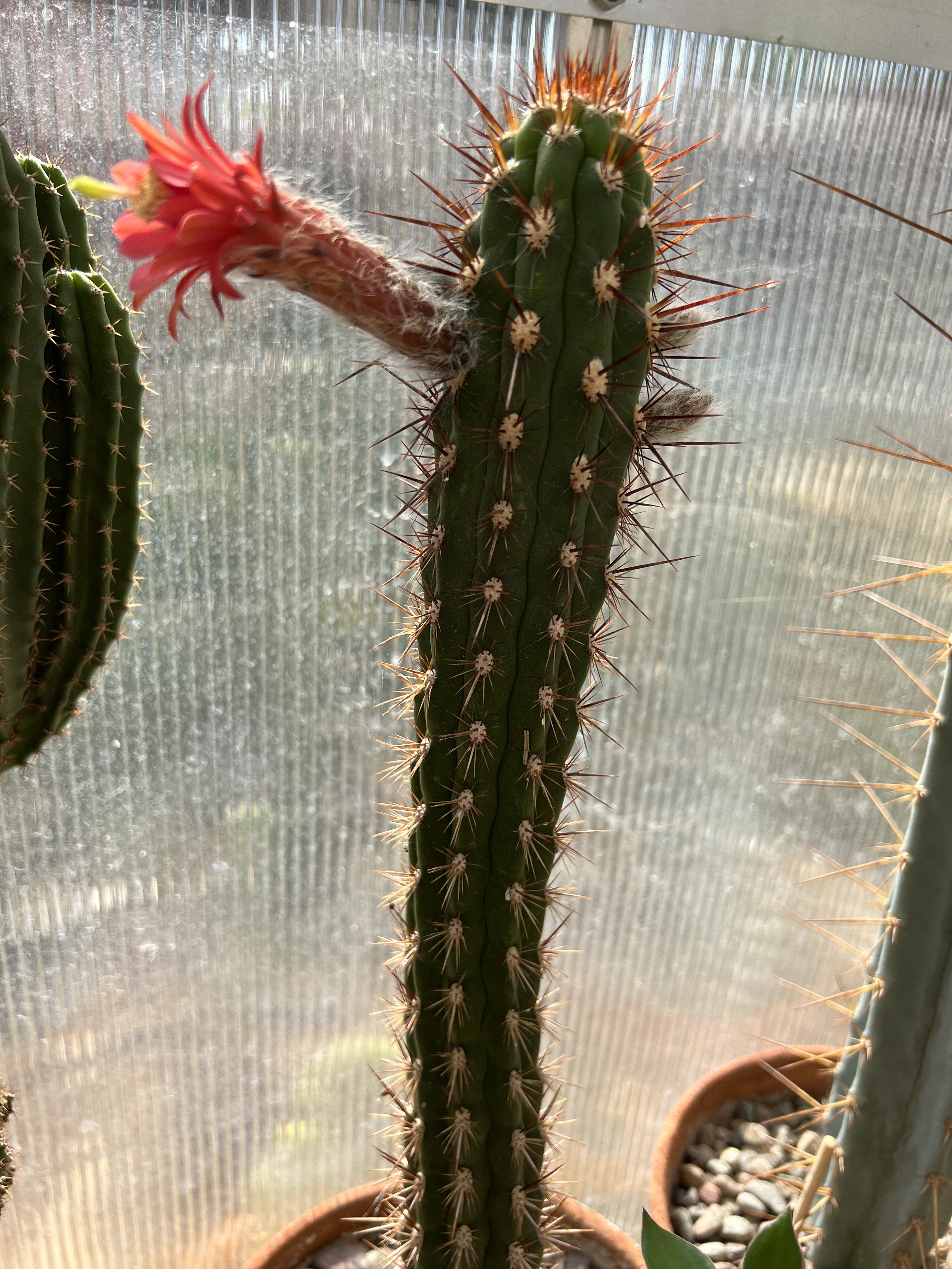 This is Cleistocactus fieldianus subsp. fieldianus. The plant seen at the Huntington Botanical Garden in their Cactus Garden. It doesn’t have the same look as a fieldianus/plagiostoma but still makes great tubercles and reddish spines. You can’t complain about that gorgeous reddish pink flower either.