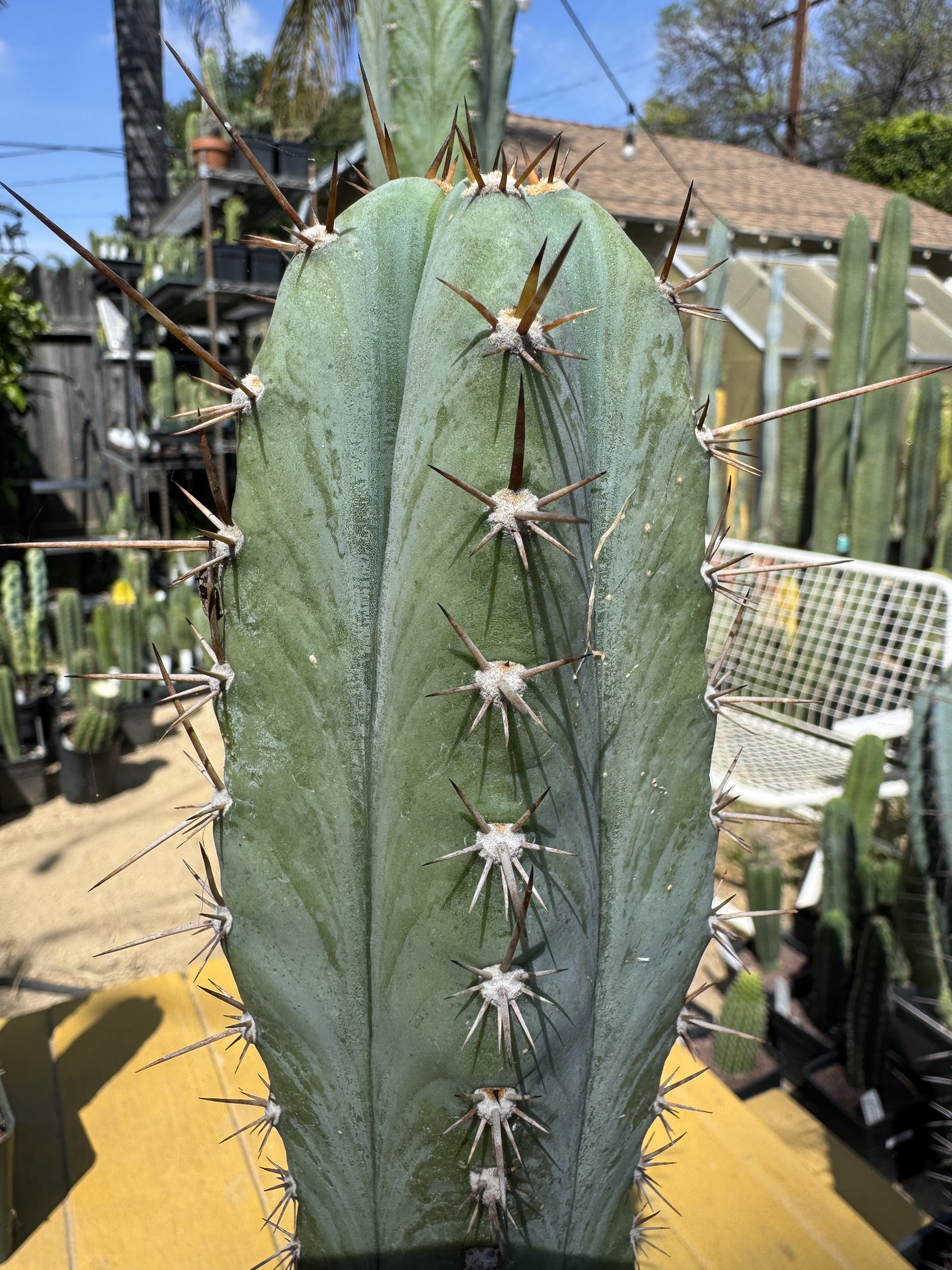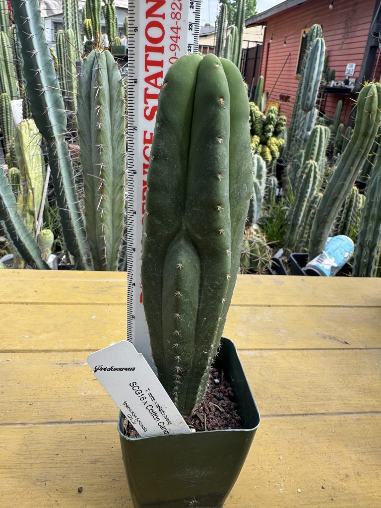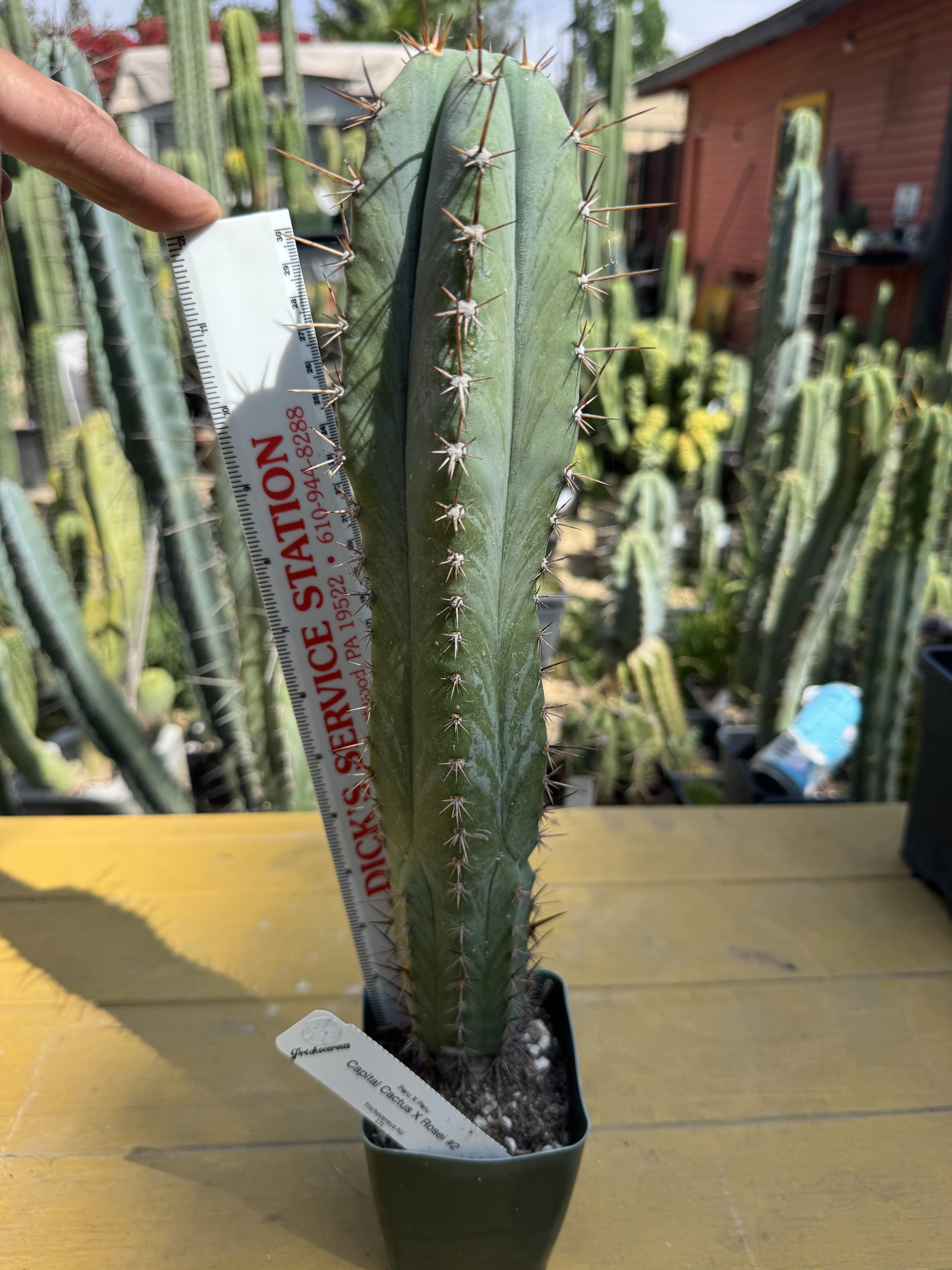 13-14″ in a 3.25″ pot . Great glaucous blue color and orange to dark brown tipped new spines.