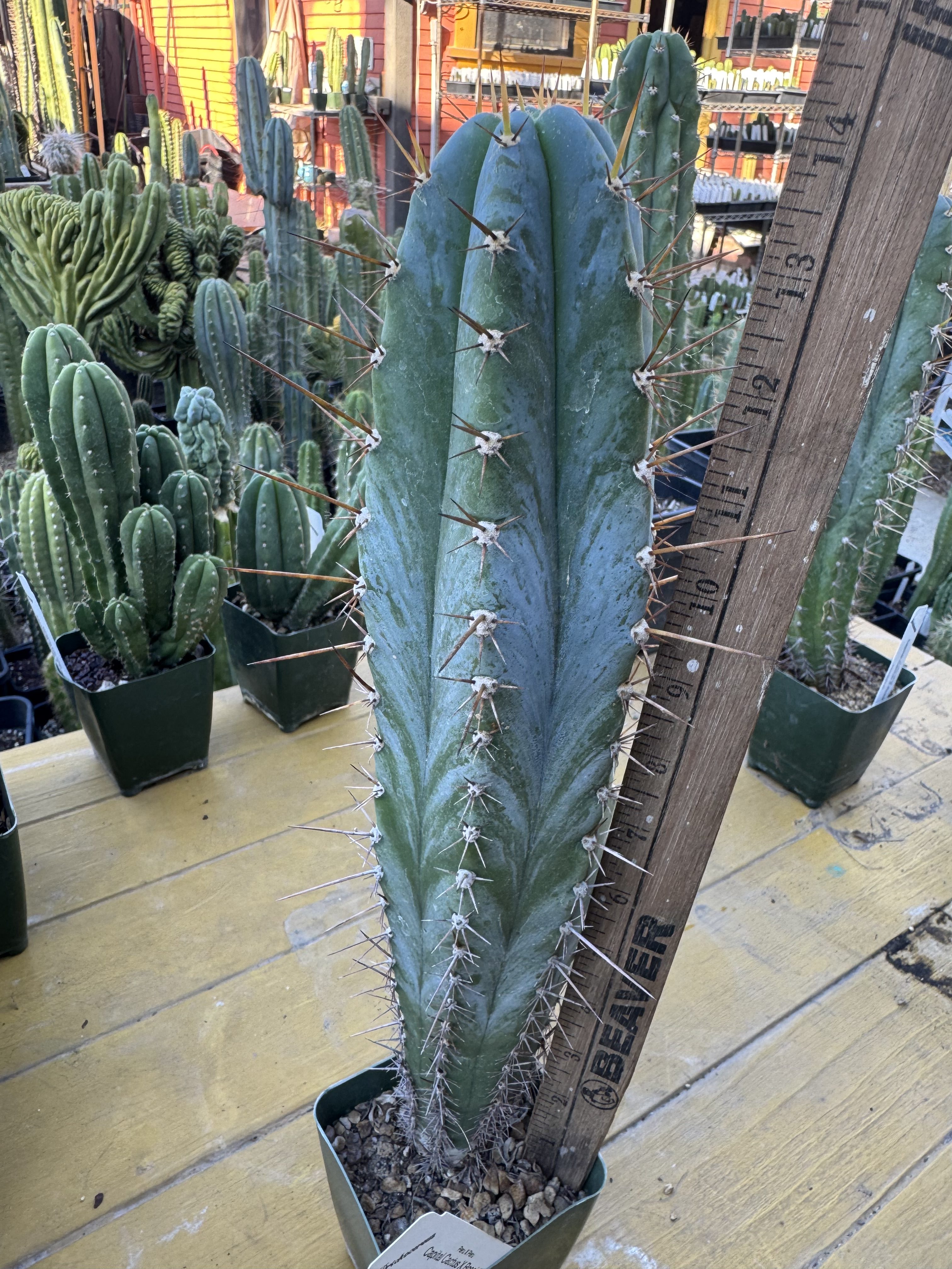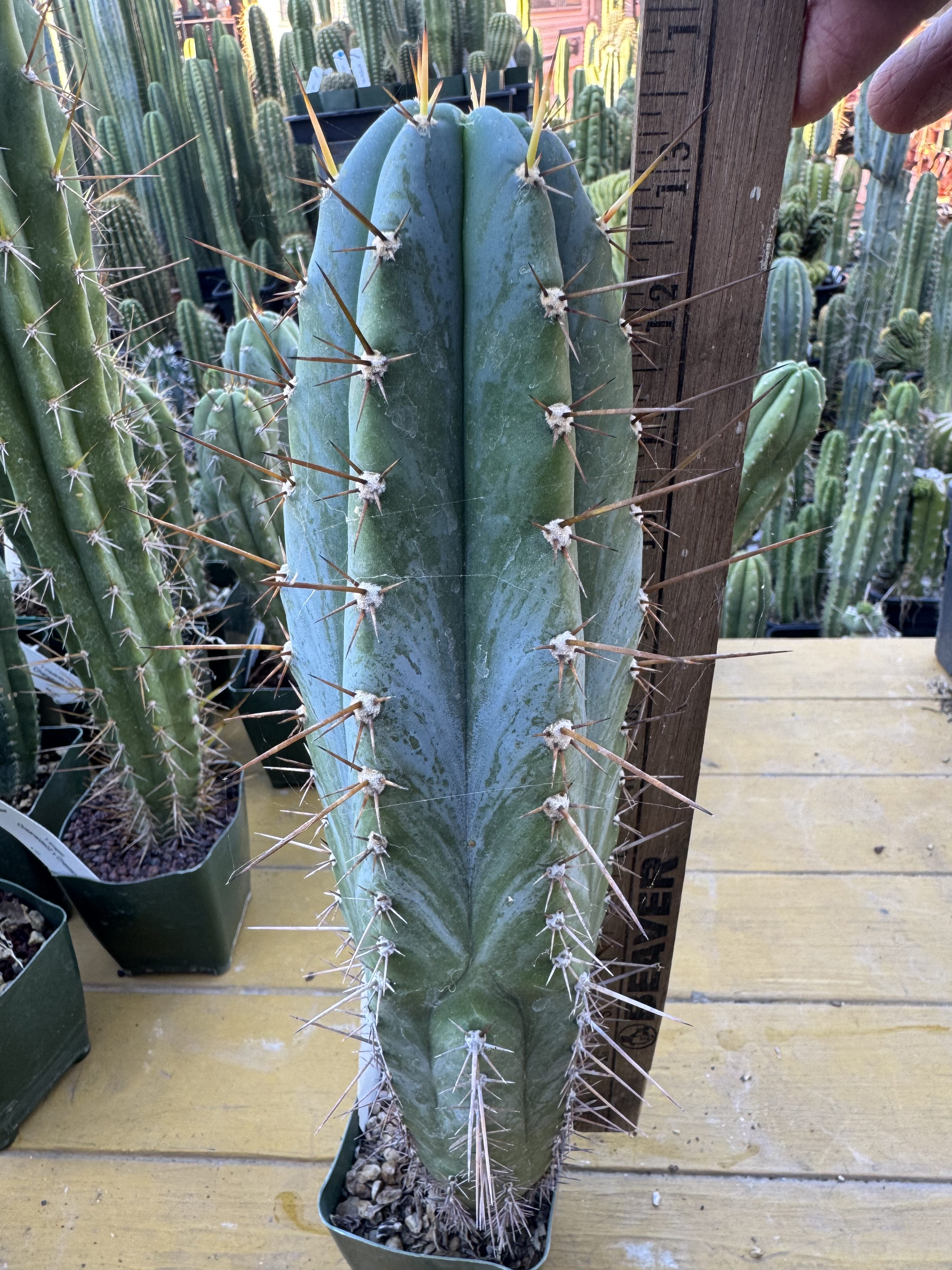 14″ in a 3.25″ pot . Great glaucous blue.