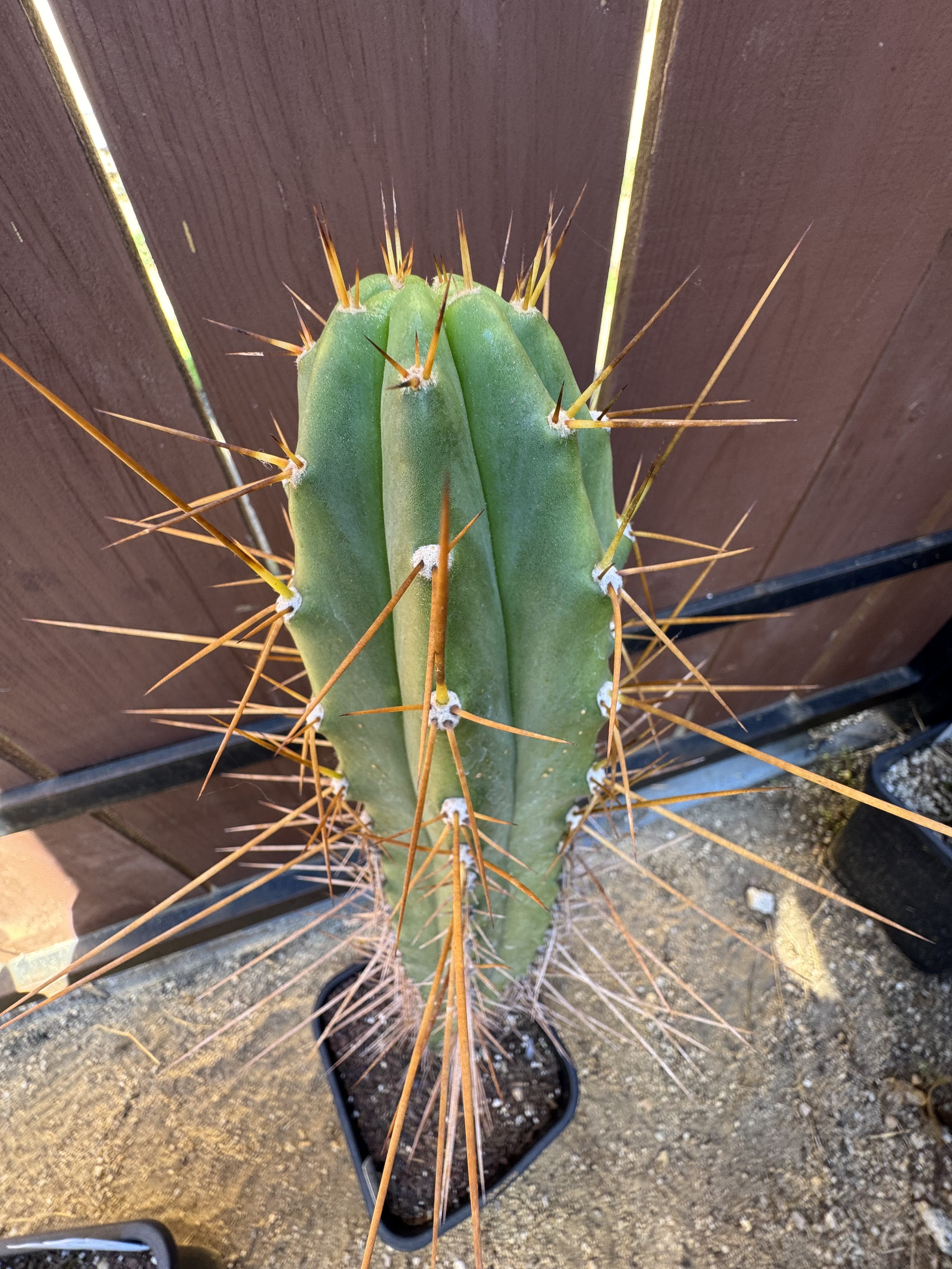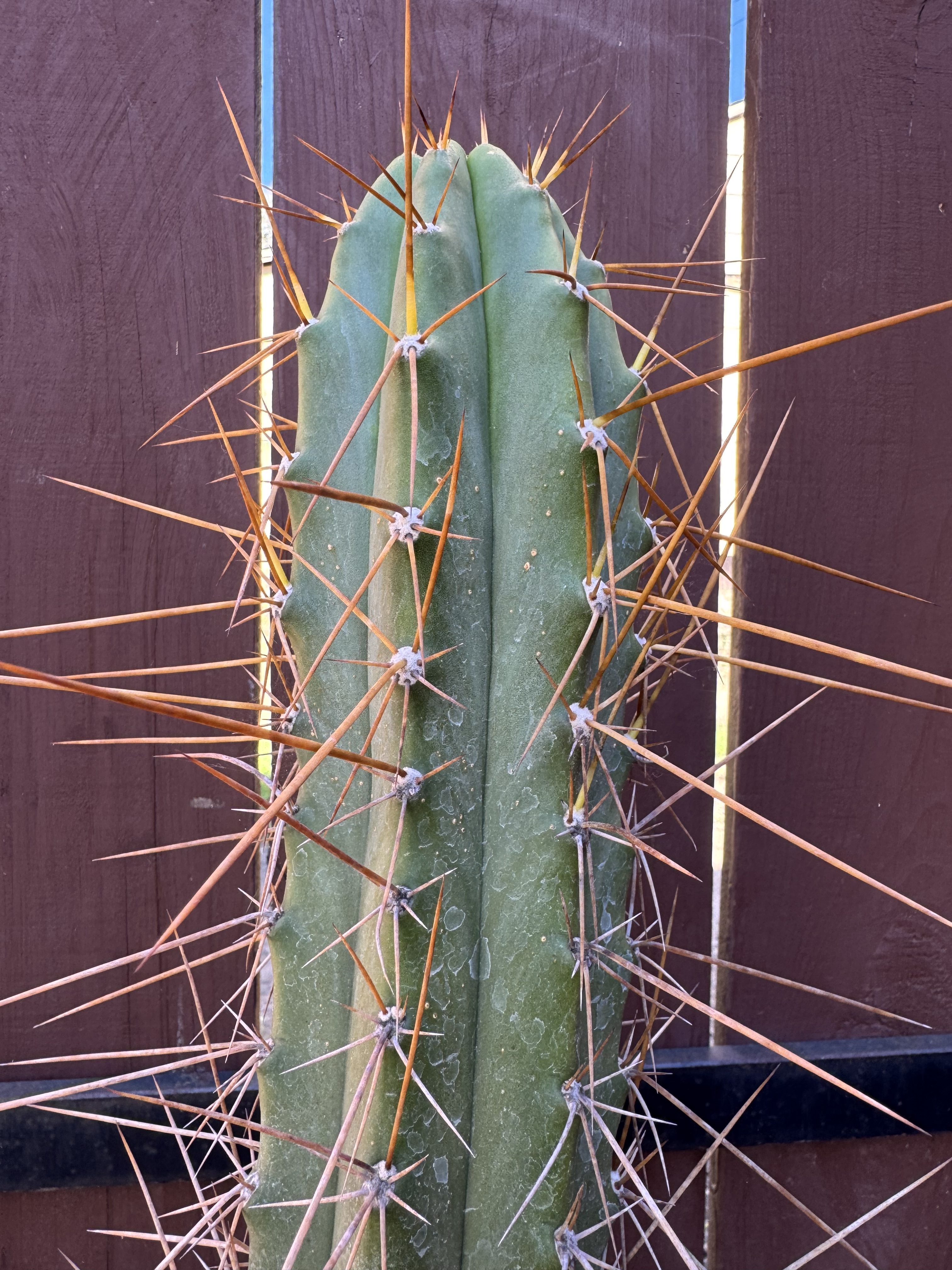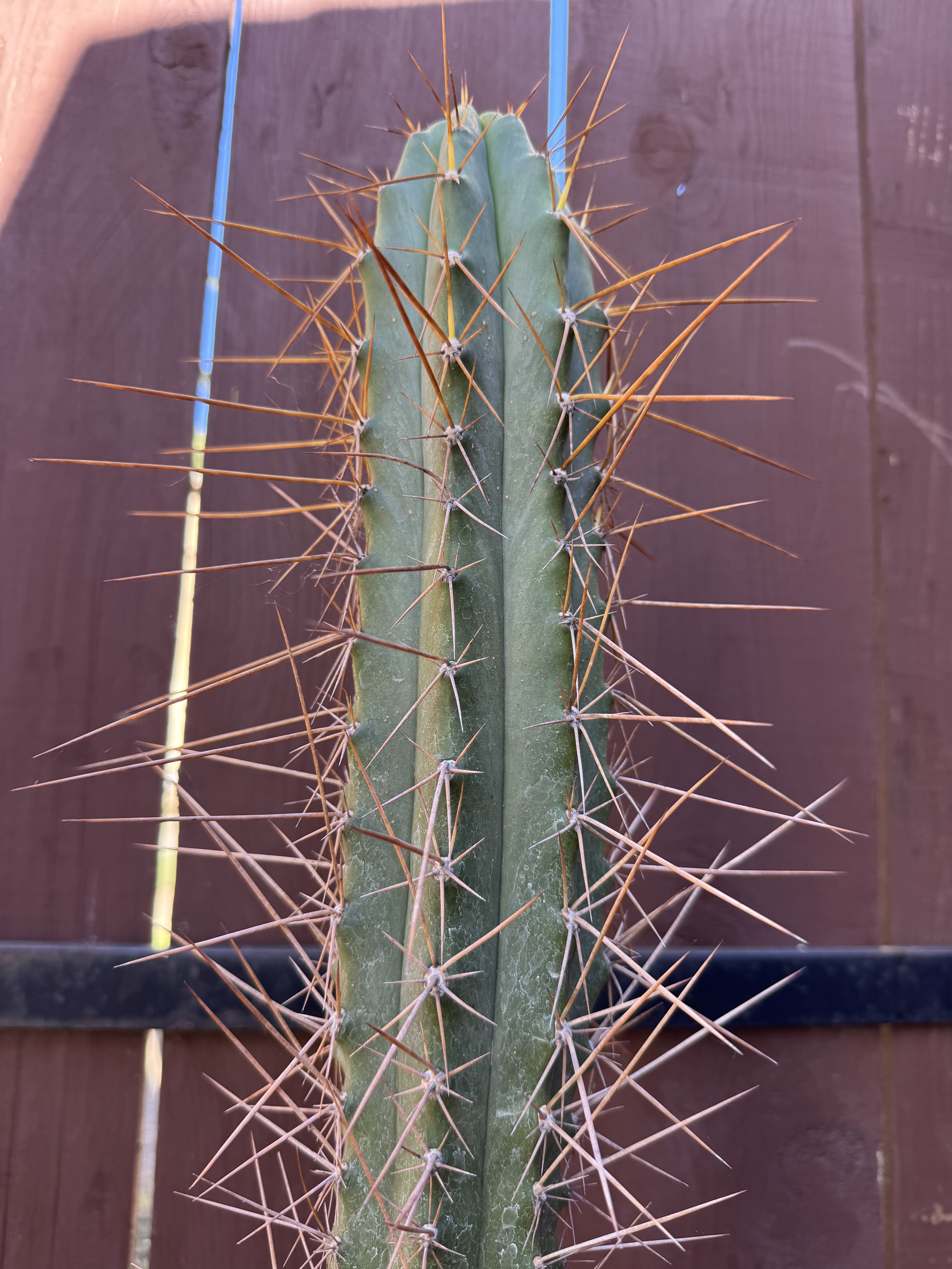 Cochao is a seed grown peruvianus from Chavin Herbalist seed. Mean spination has been what I’ve seen on the few phenotypes. I’ve held onto them probably too long, but I love long spines.  This specific seedgrown has produced some very sporadic and angry spines.  The green epidermis is a good contrast to the yellow spineation.  This is my biggest specimen I grew out, maybe I uppot it again… 22 inches tall.