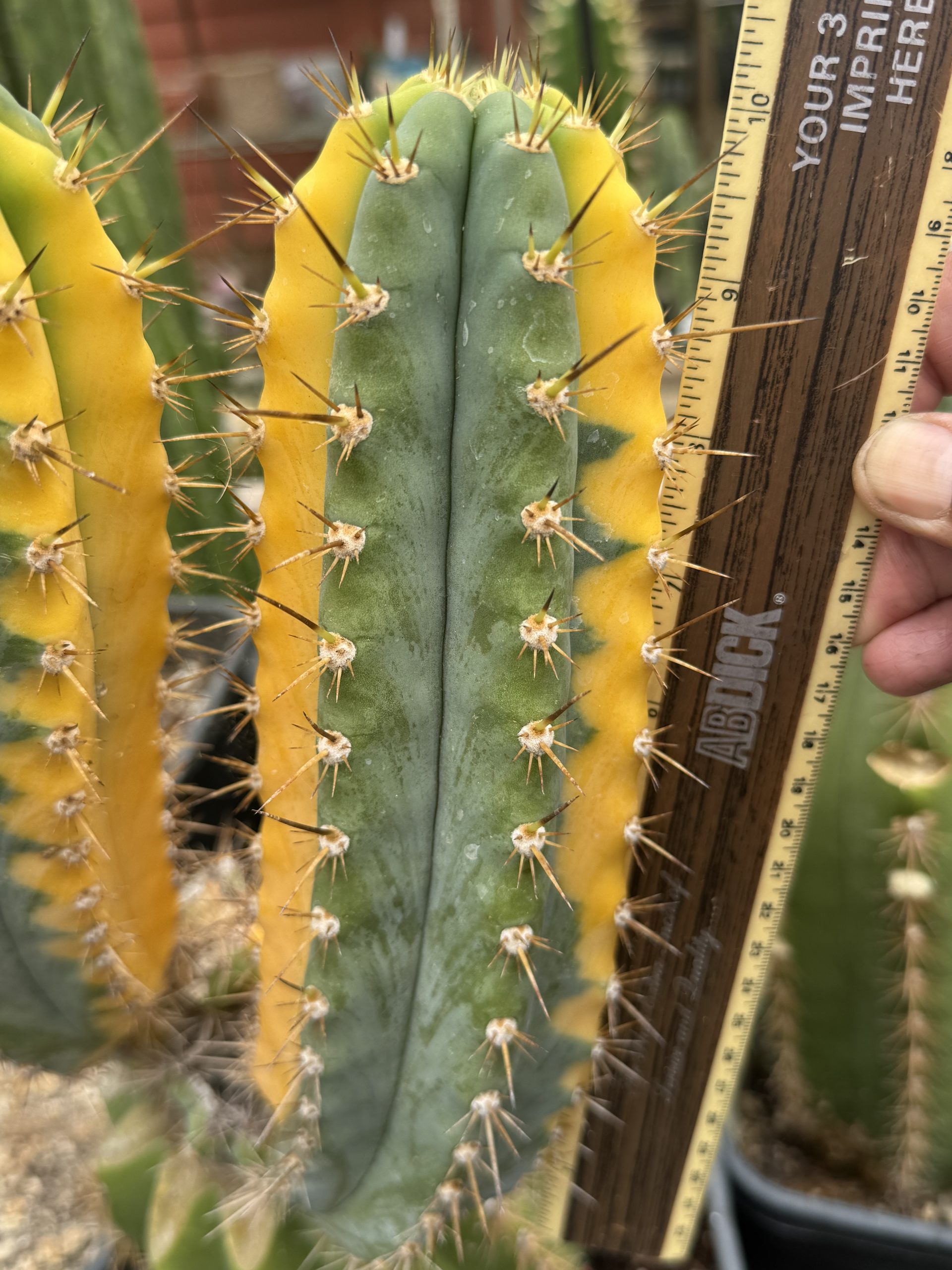The seed grown variegated Icaro Matucana peruvianus. Glaucous blue over patterned green and yellow epidermis. Yellow spines coming out of undulating tubercles. Daedalus the mythilogical character, inventor, architect, craftsman, and father of Icarus.