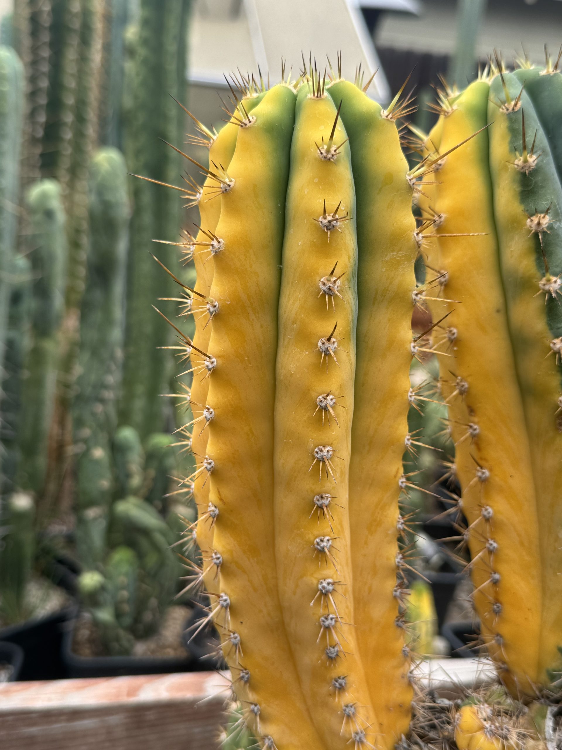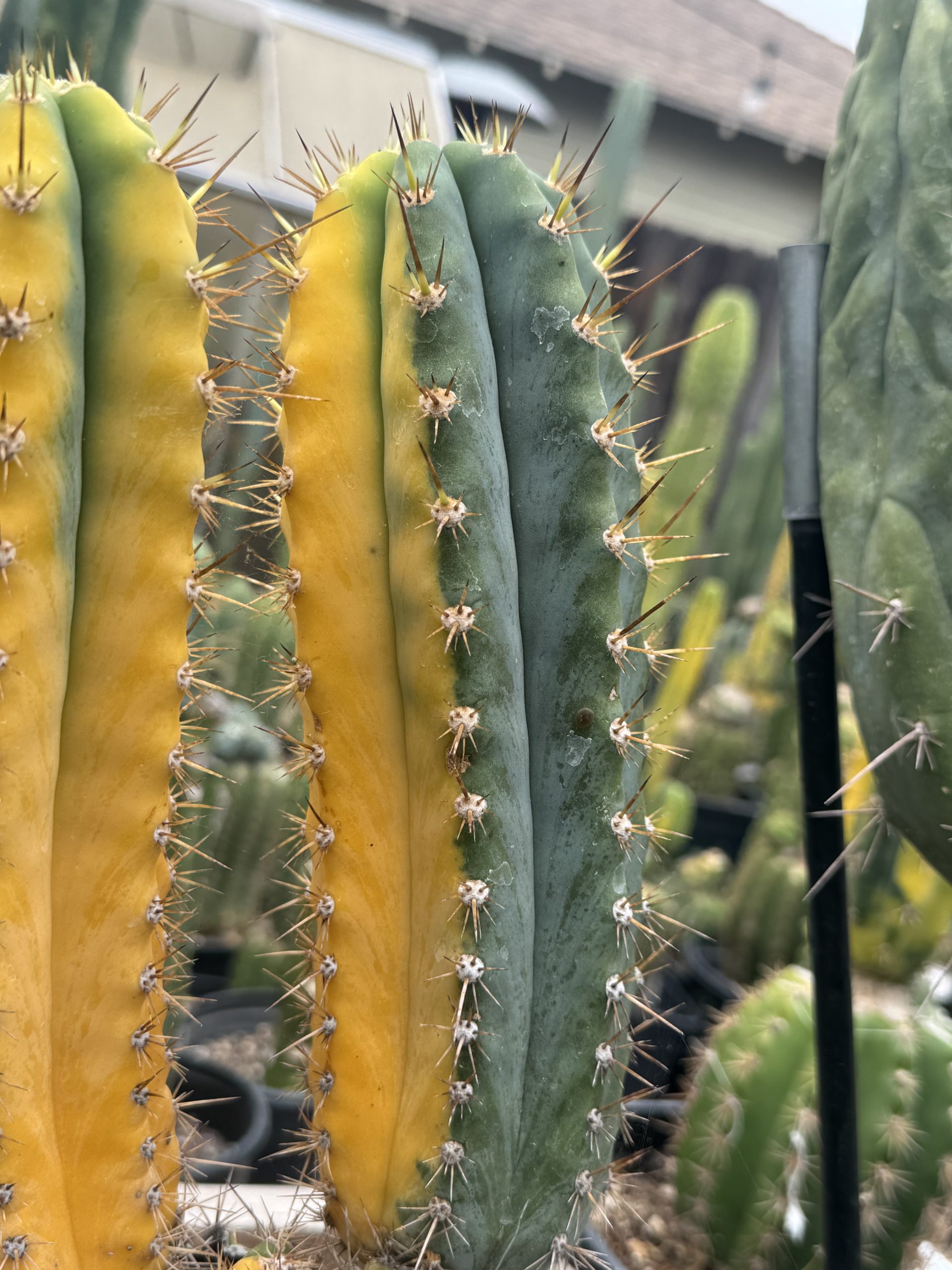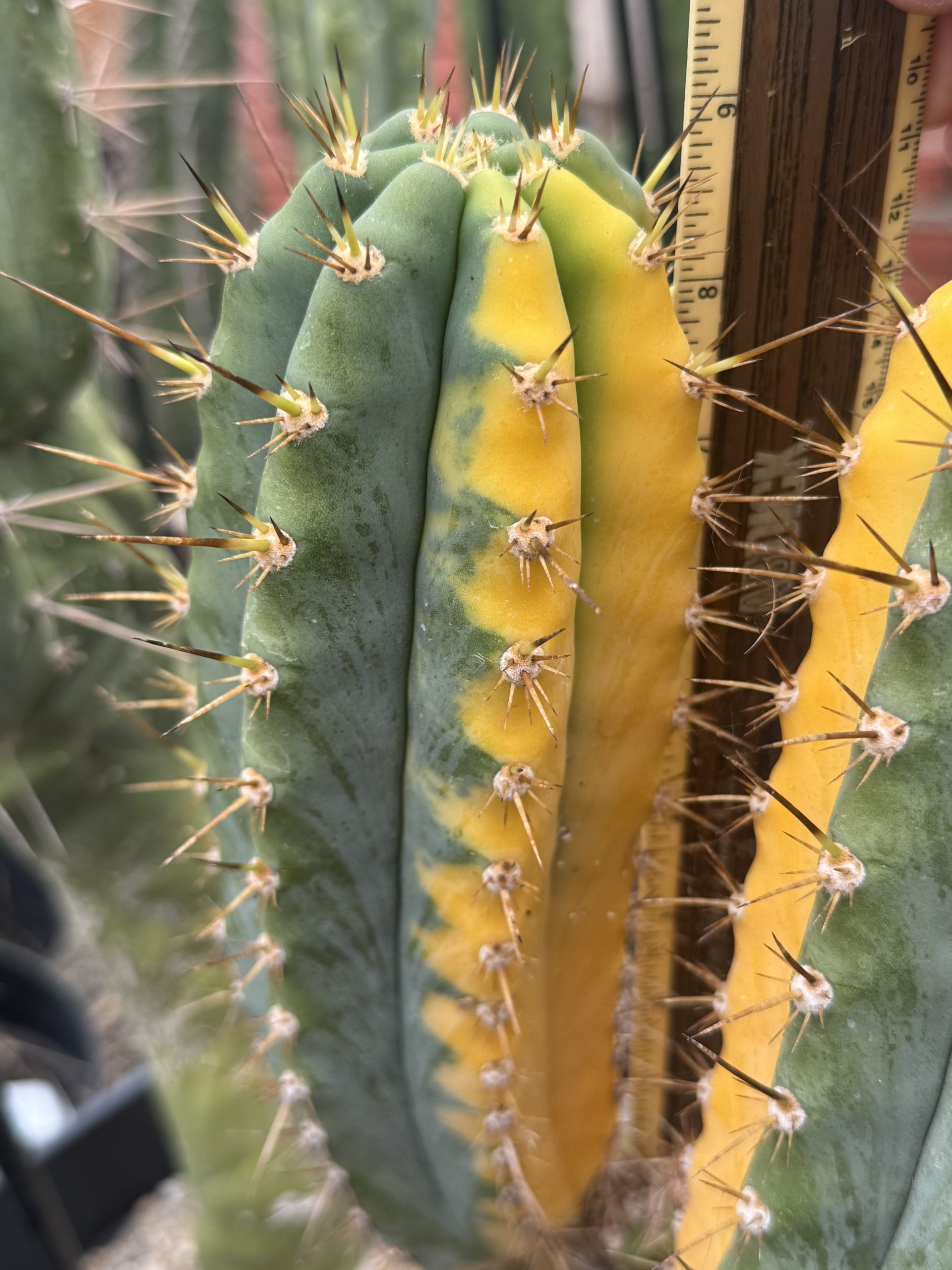 Daedalus is a variegated T. peruvianus discovered, isolated, and propagated by us here. Still a very rare occurrence considering the thousands of seeds of Icaro sown over years. I’m glad to be one of the first to offer something as beautiful as this. I’ve only cut a few of these, so there is definitely a small garen population with this plant.