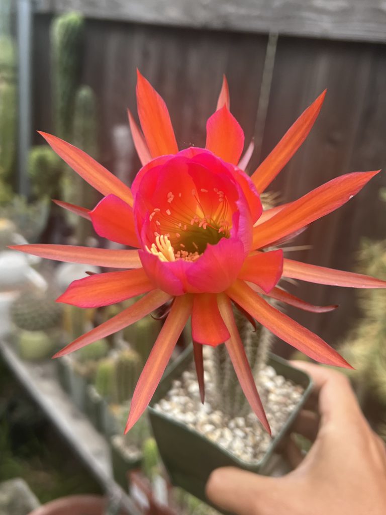 Echinopsis/Tricho cactus are well known for their big beautiful flowers at maturity. These plants will usually get to that place at 4-8 feet and specific growing conditions. Highly collectible for their looks, shape, and color, they make wonderful potted plants and landscaping plants.
