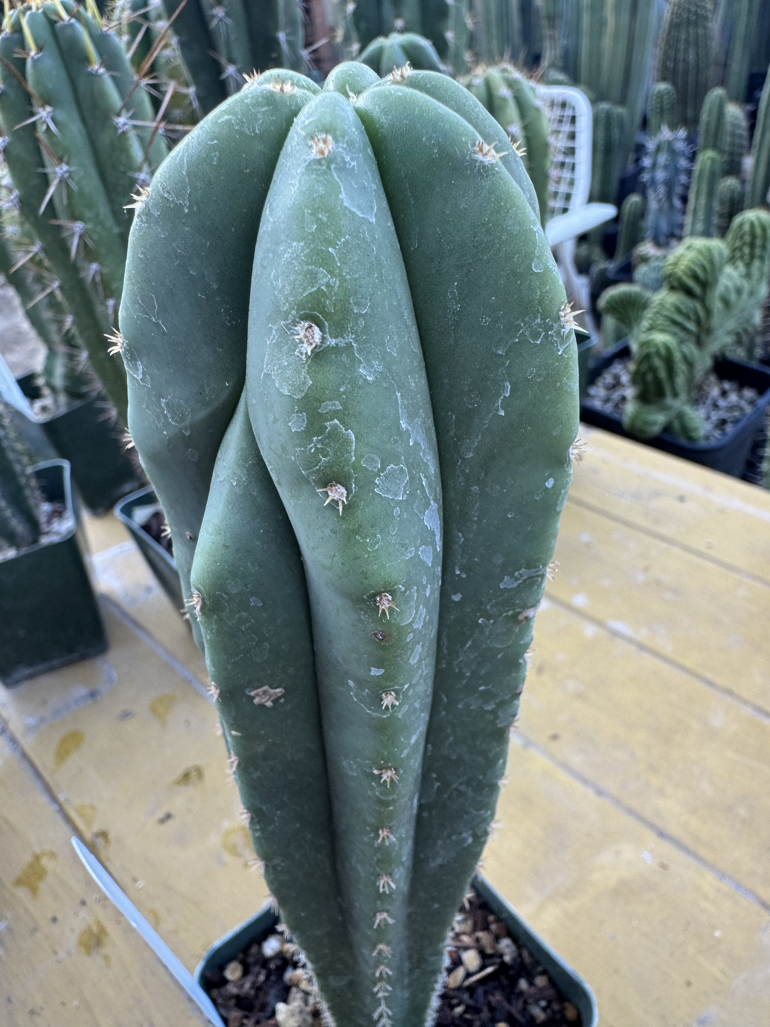 FR991 x Ferah seed grown Trichocereus scopulicola from the Prickocereus garden. Two great genetics put together here.  We love all the scops, and the seedlings and yearlings are no exception. The very smooth sometimes leathery skin, and very short spination is a fan favorite of Trichocereus collectors. Sown here in our garden.