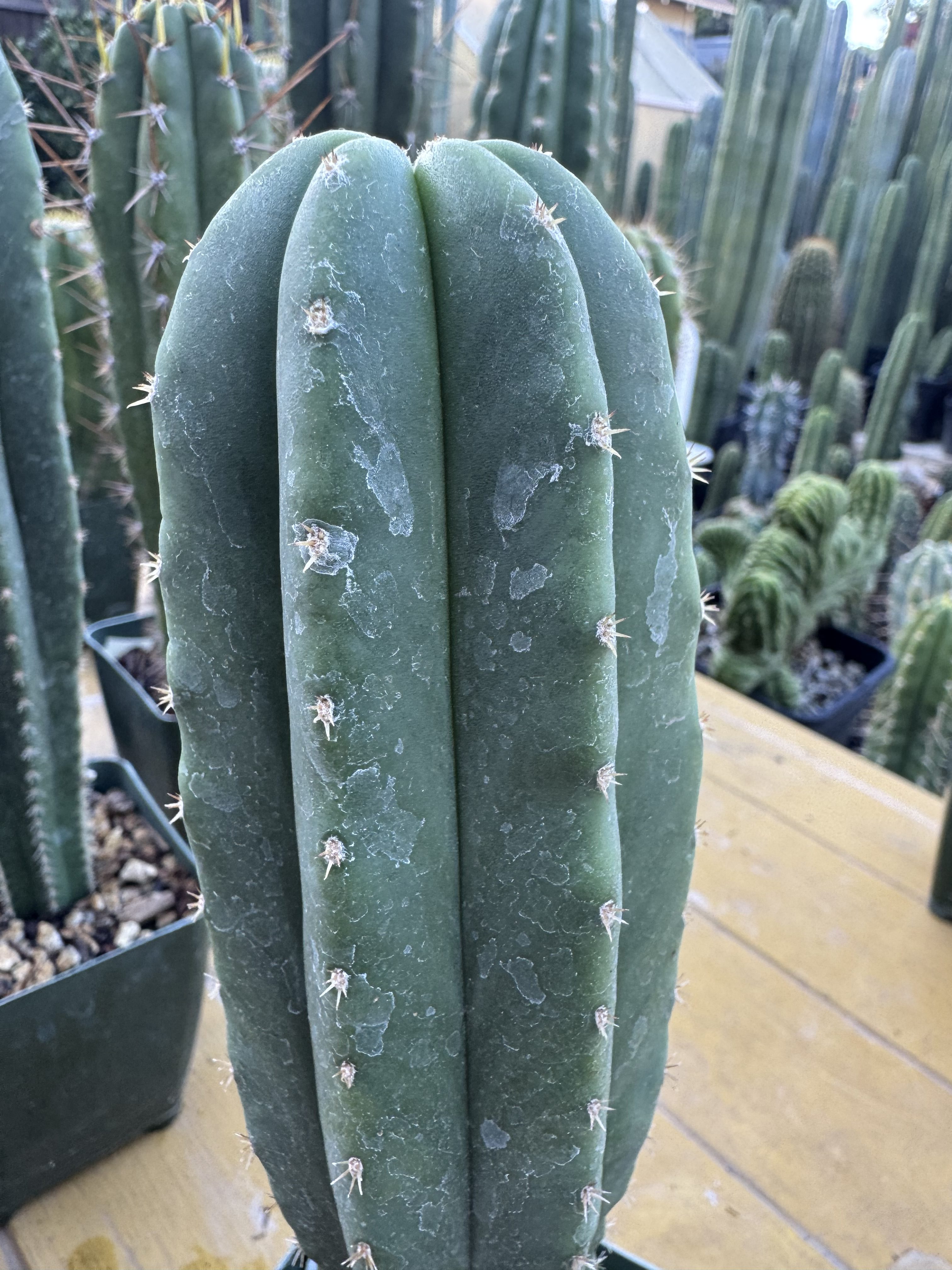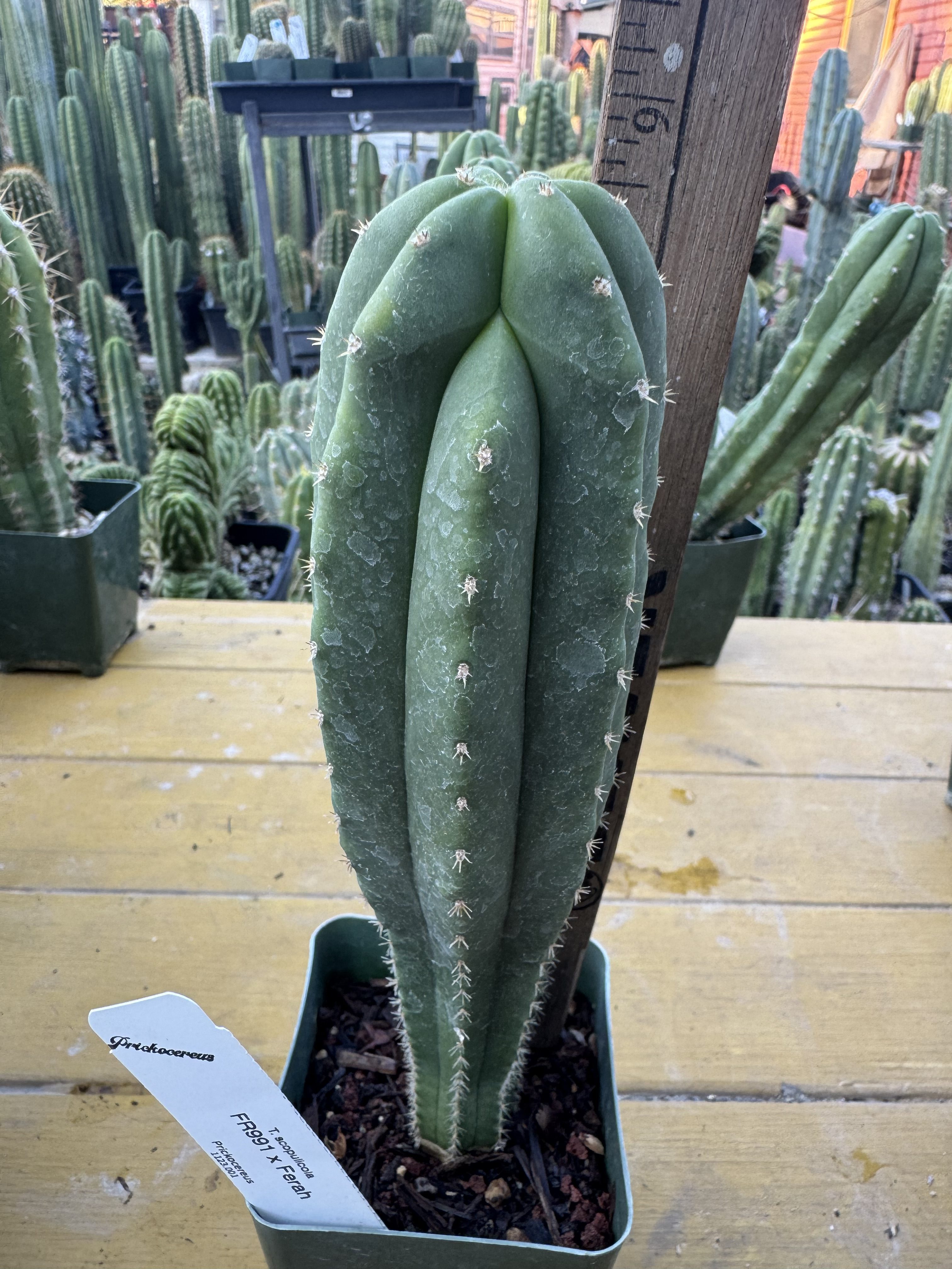FR991 x Ferah seed grown Trichocereus scopulicola from the Prickocereus garden. Two great genetics put together here.  We love all the scops, and the seedlings and yearlings are no exception. The very smooth sometimes leathery skin, and very short spination is a fan favorite of Trichocereus collectors. Sown here in our garden.