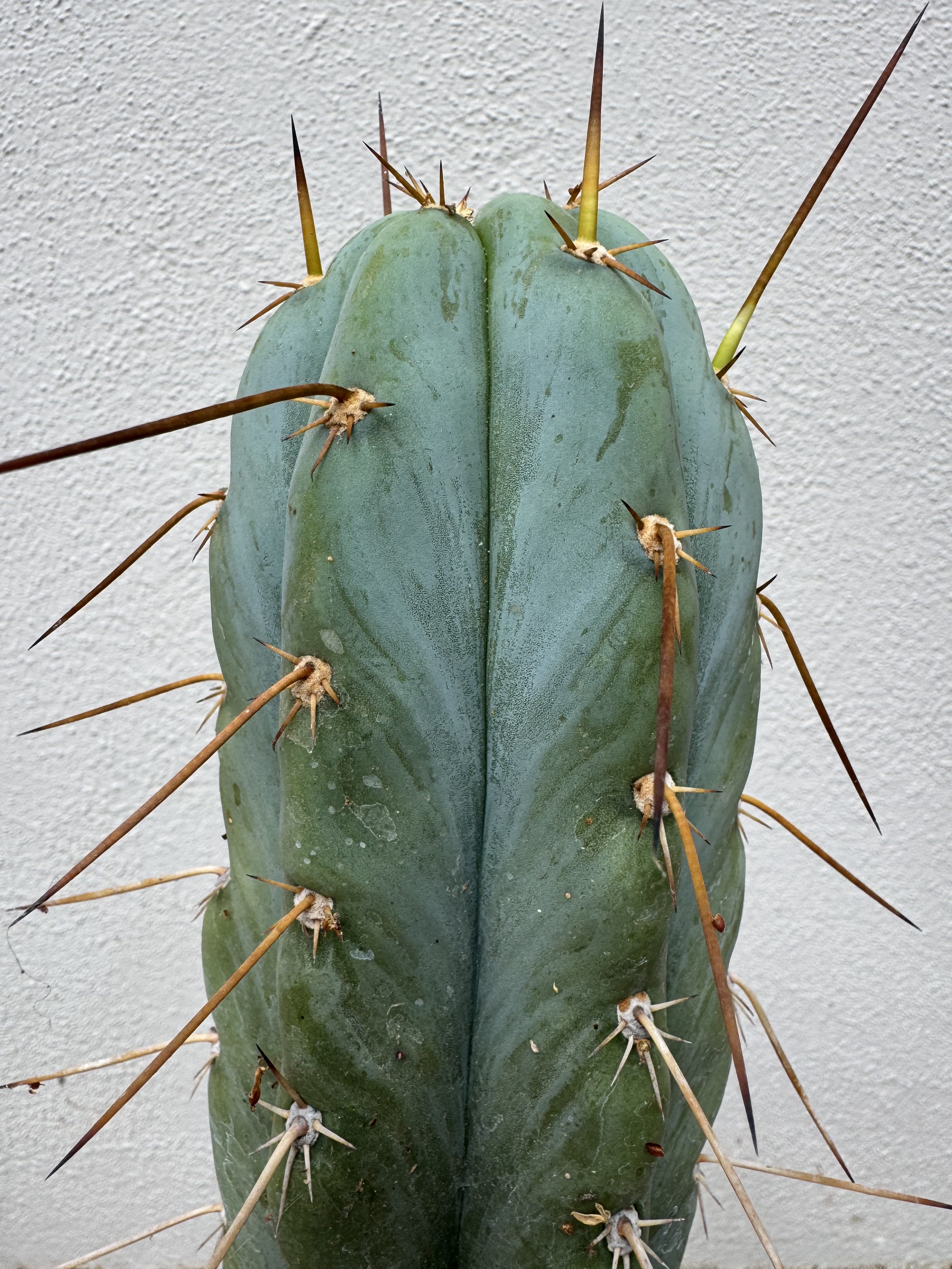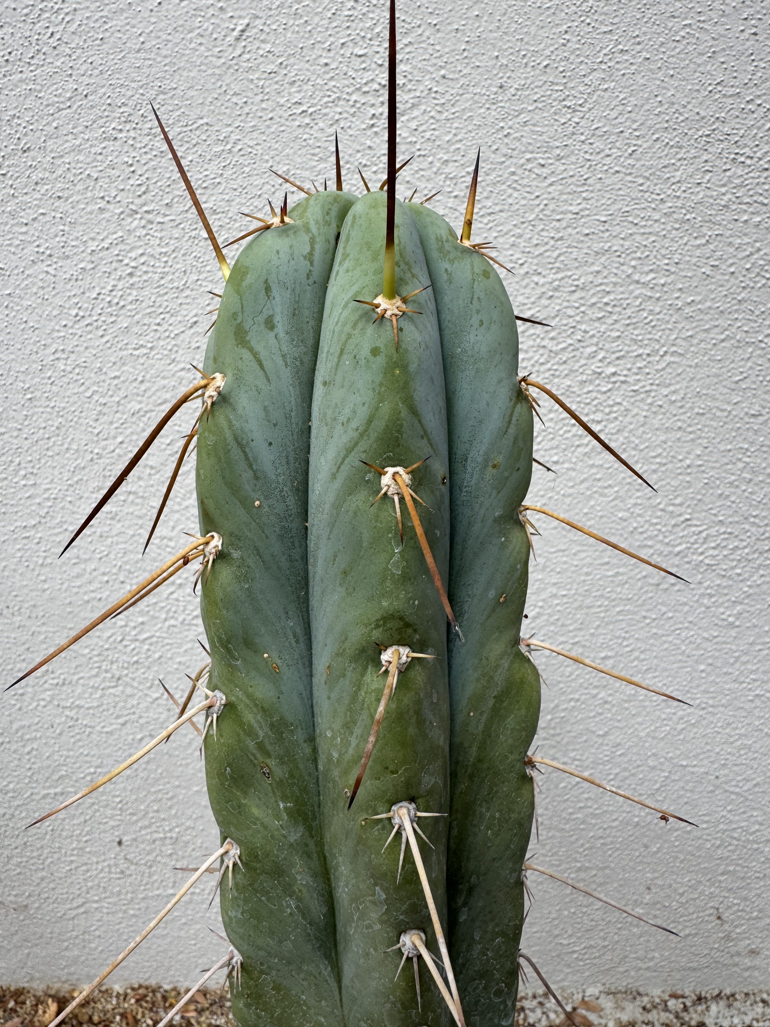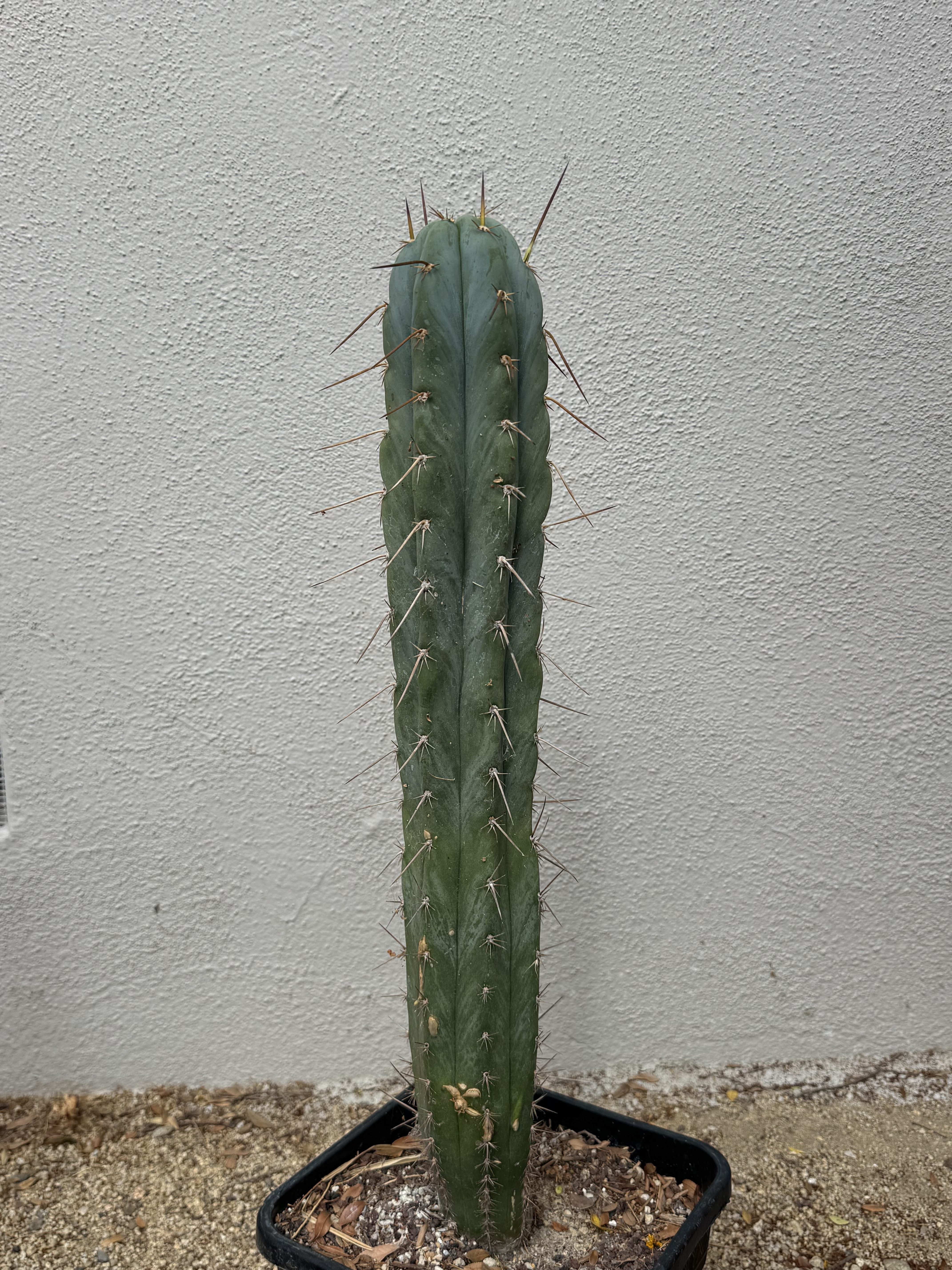 Icaro DNA T. peruvianus.  Well known for it’s glaucous blue epidermis.  Seed grown peruvianus’ are great because they can all have such slight interesting phenotypical differences from their siblings.   Great profile on this one with the somewhat downward facing central spines.  It’s kind of interesting how the spines decides to bend down without any interference from me.   A great thick example at 22 inches tall.  A few marks at the lower section but nothing significant.