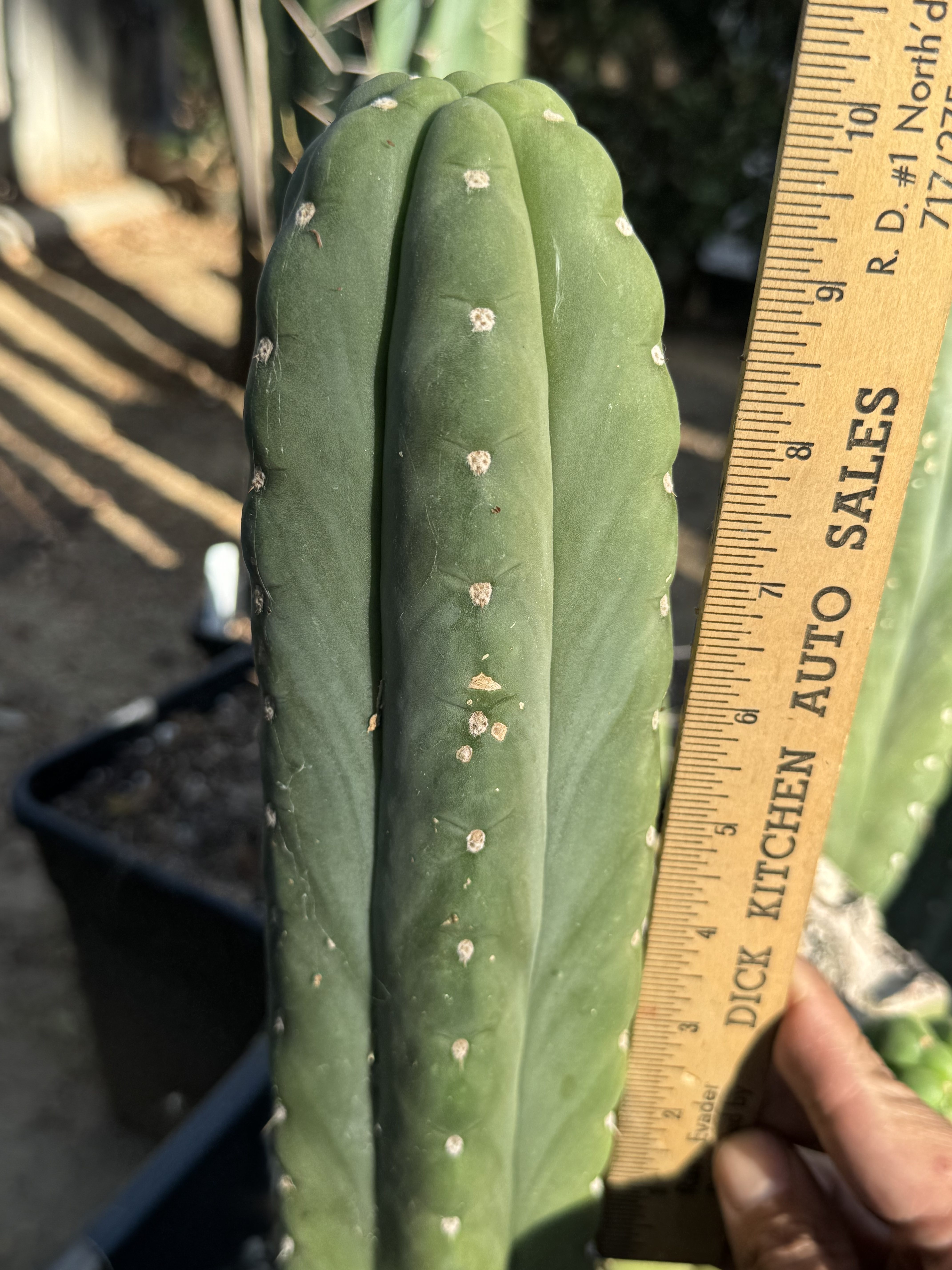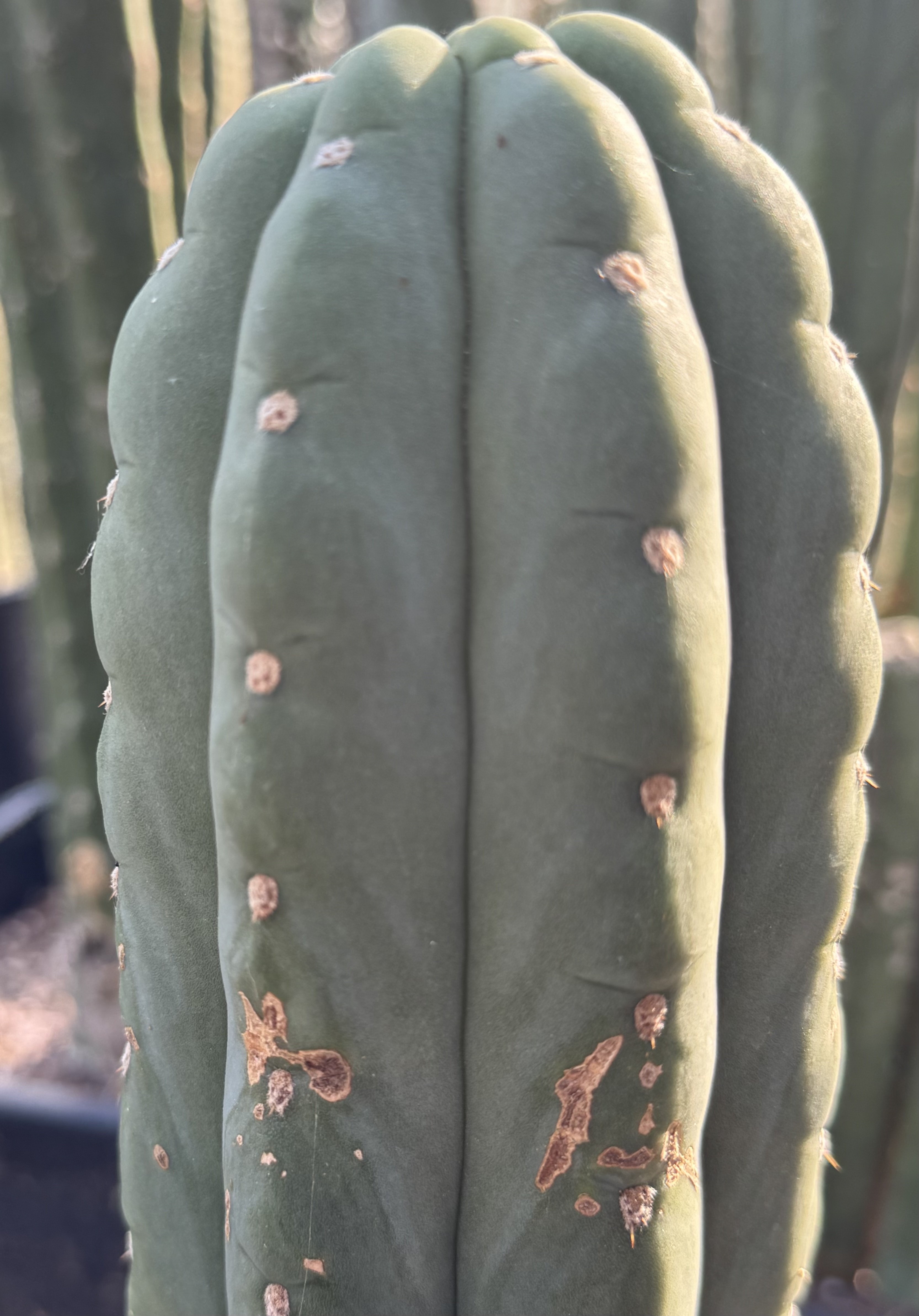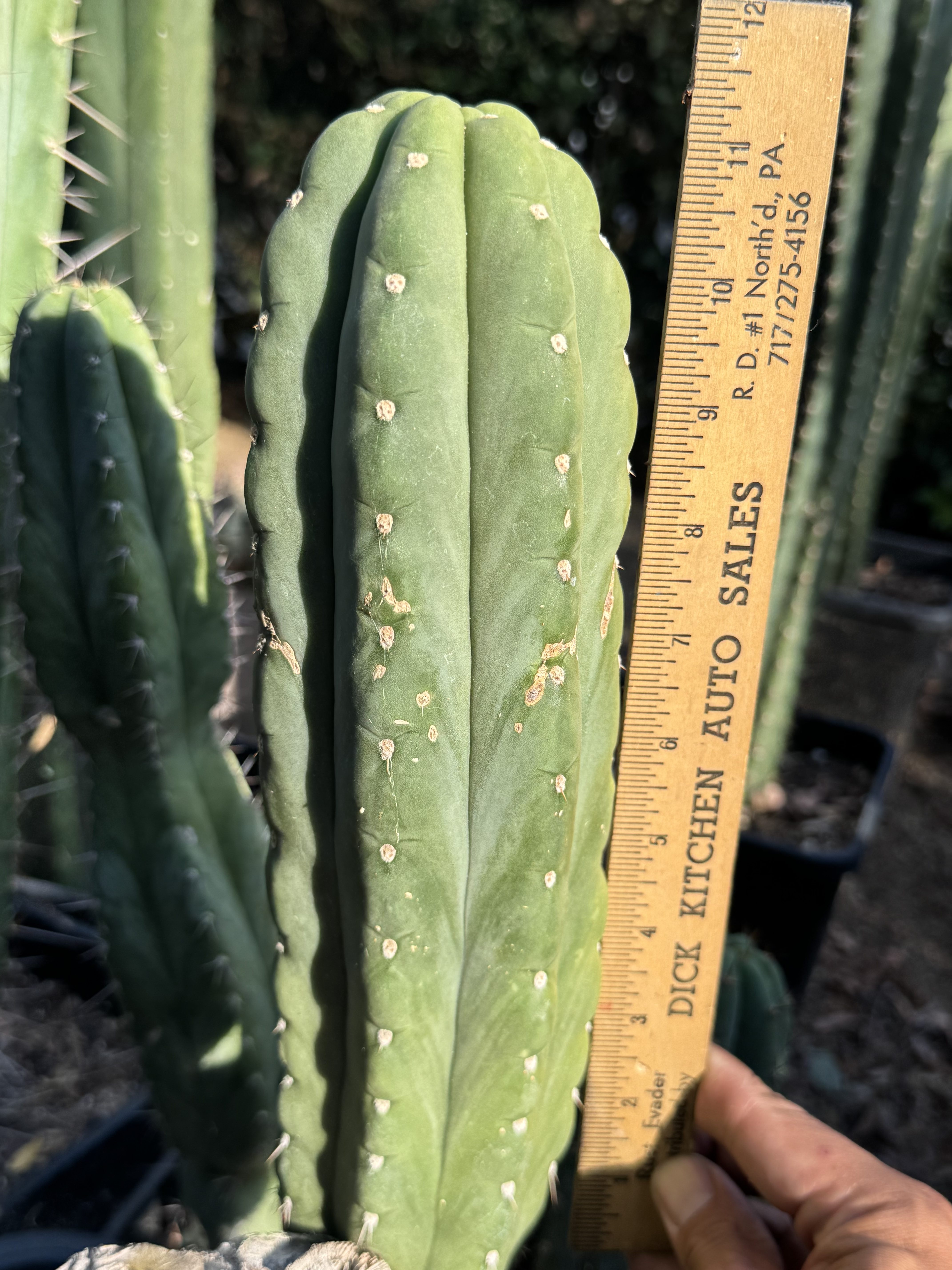 John’s Jamon is a very nice pachanoi discovery in Yucaipa, CA. This is a T. pachanoi that’s notchy and short spined. It’s one of our SoCal favorites without a doubt for its unique form for a pachanoi, considering the many smooth straight ribbed type of forms out there. What’s notchy? Look above the areole, and see the lateral line that looks almost like a furrowed eyebrow. Thats the notch!