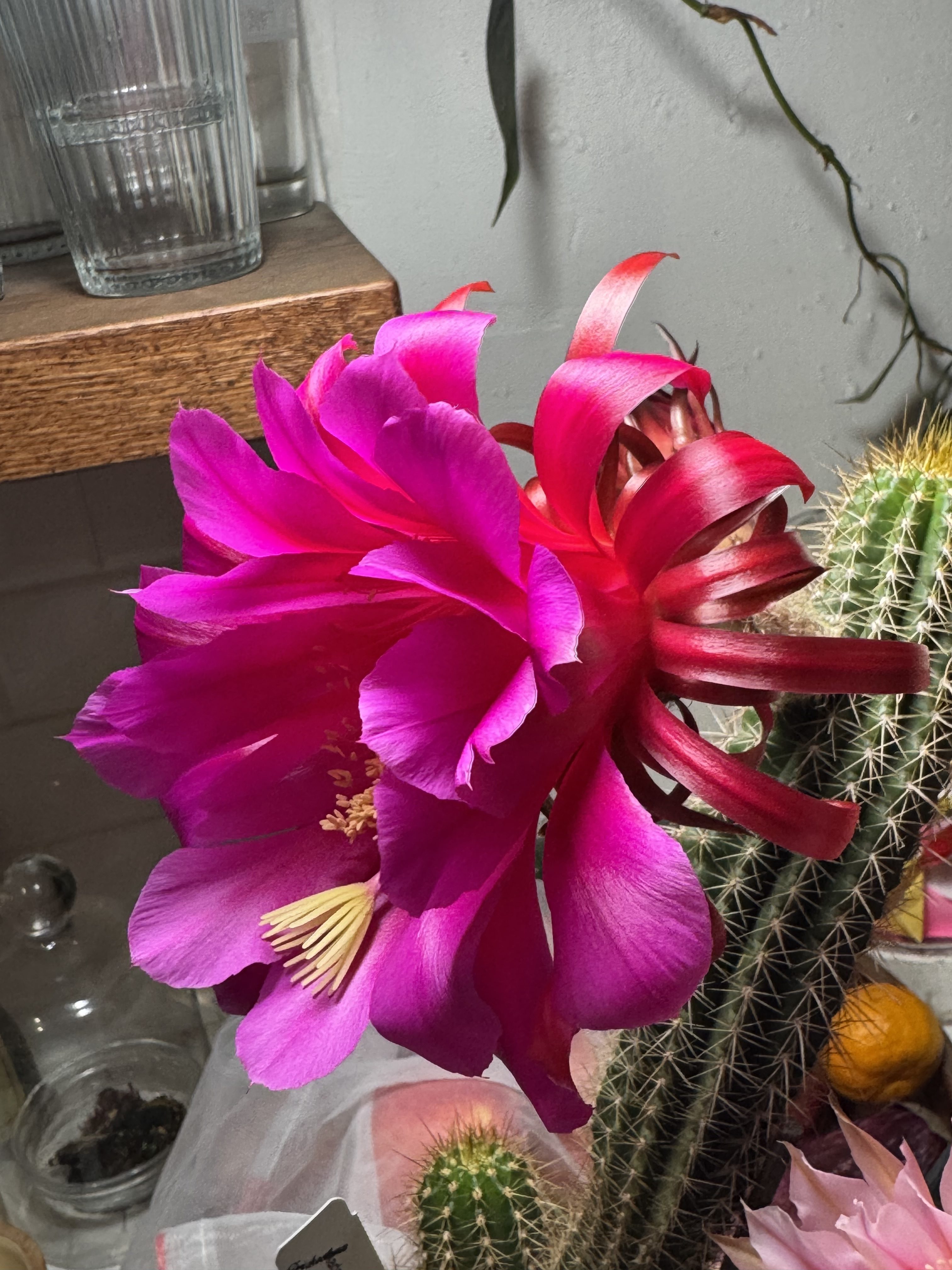 One of our favorites, Madame produces the pink and white flower on a short spined column while getting it crossed with it’s offspring that produced one of the most vibrant magenta flowers I’ve seen. I can’t wait to see how it morphs