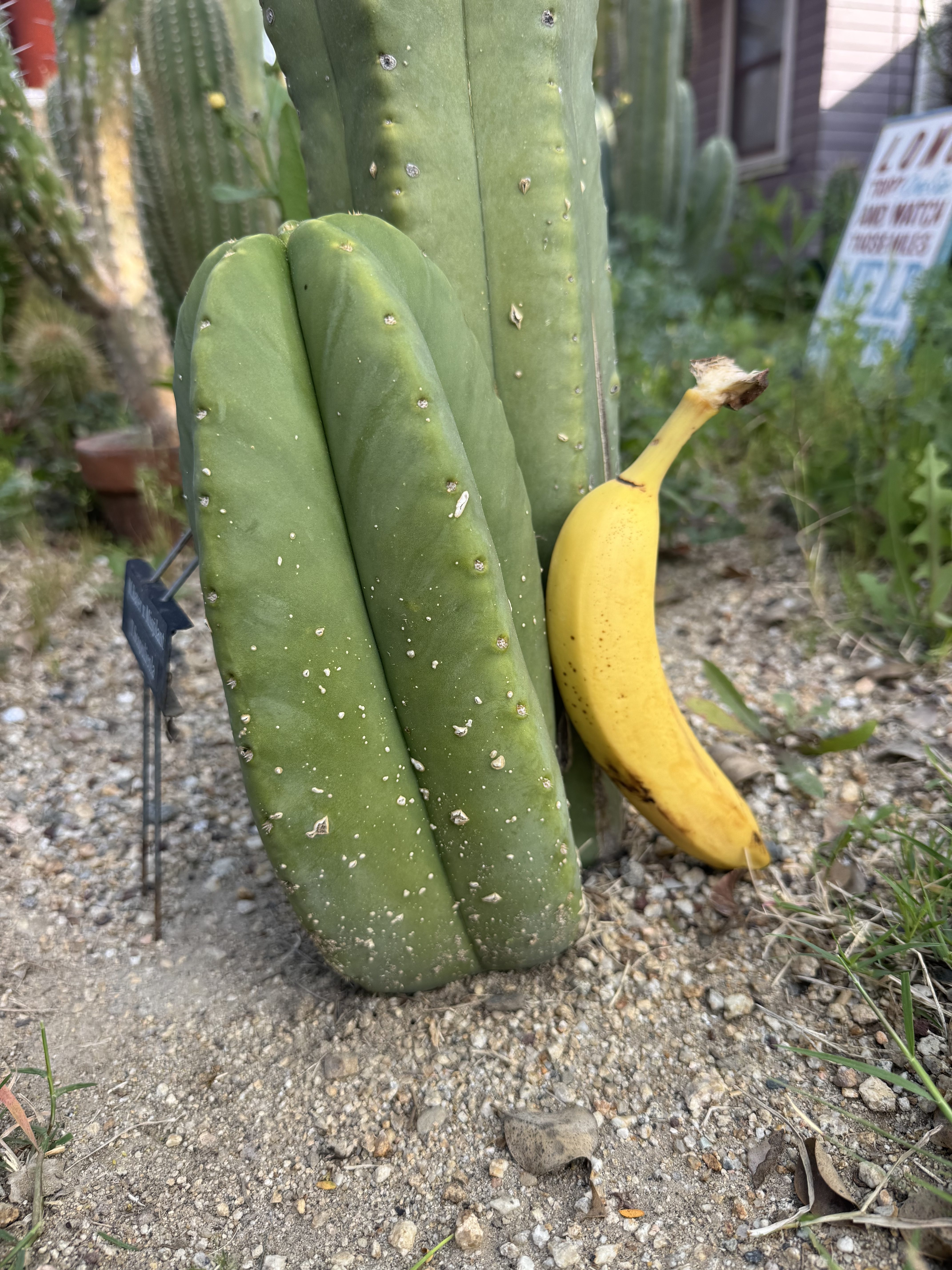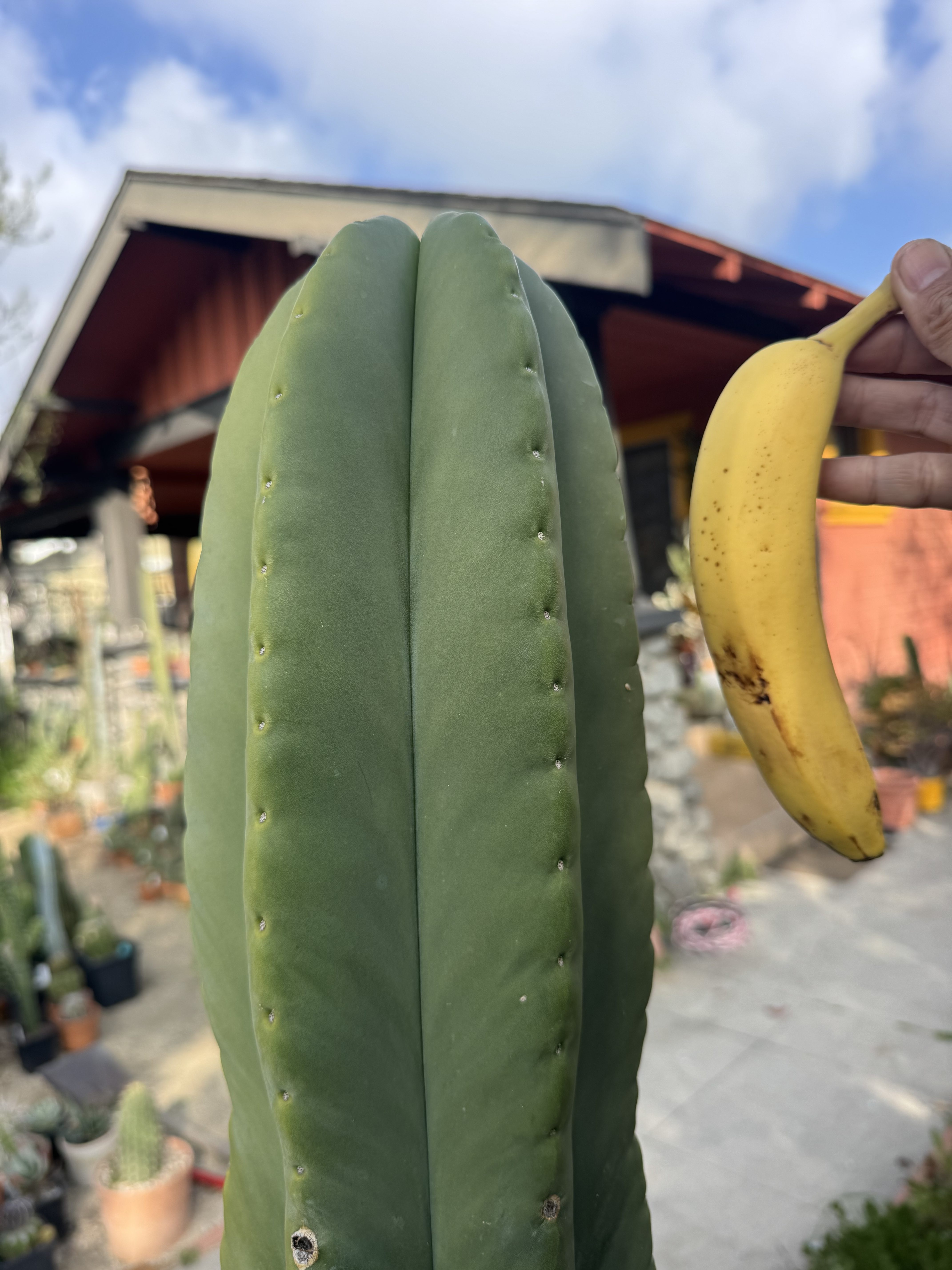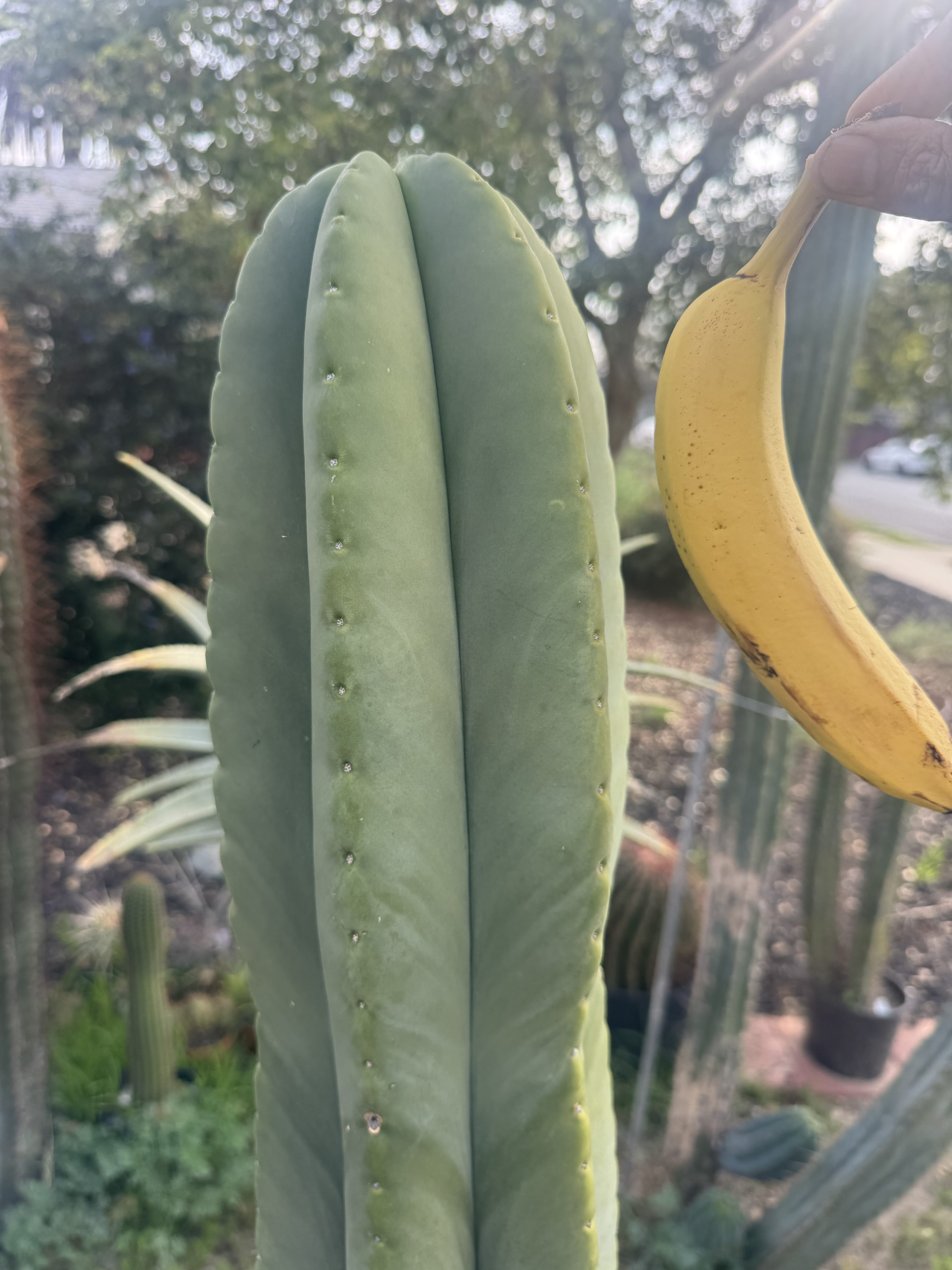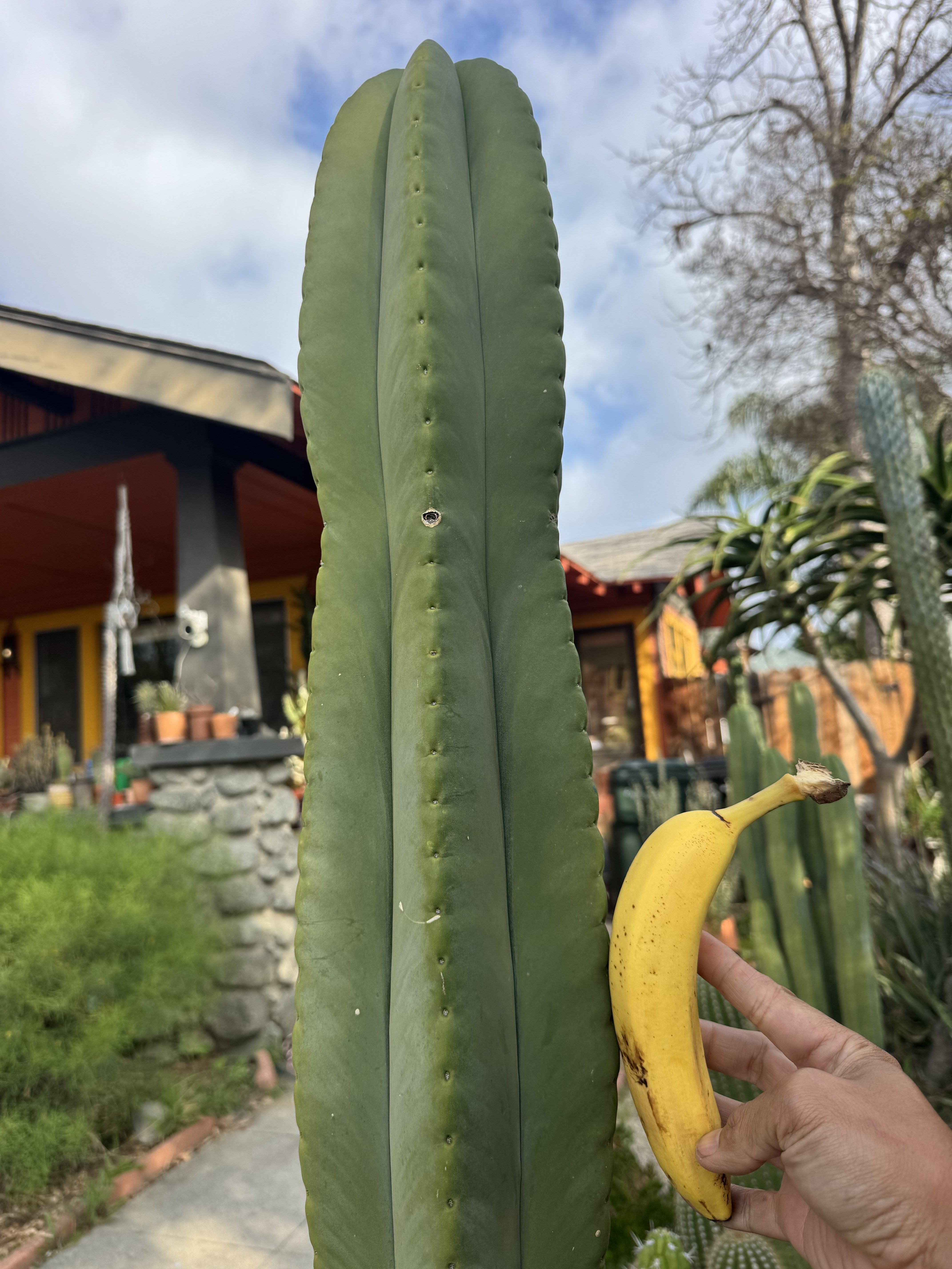 MB X MP T. scopulicola. The Bolivian Tricho that grows thick columned and short spined. To the point of looking and feeling seemingly spineless. This is 6 foot unit ready to be grounded in your yard from my own collection. I could cut and propagate it but I think it deserves to be a whole plant. You want large fat scop? this is the one, seed grown maybe 8 years ago. organic banana for scale