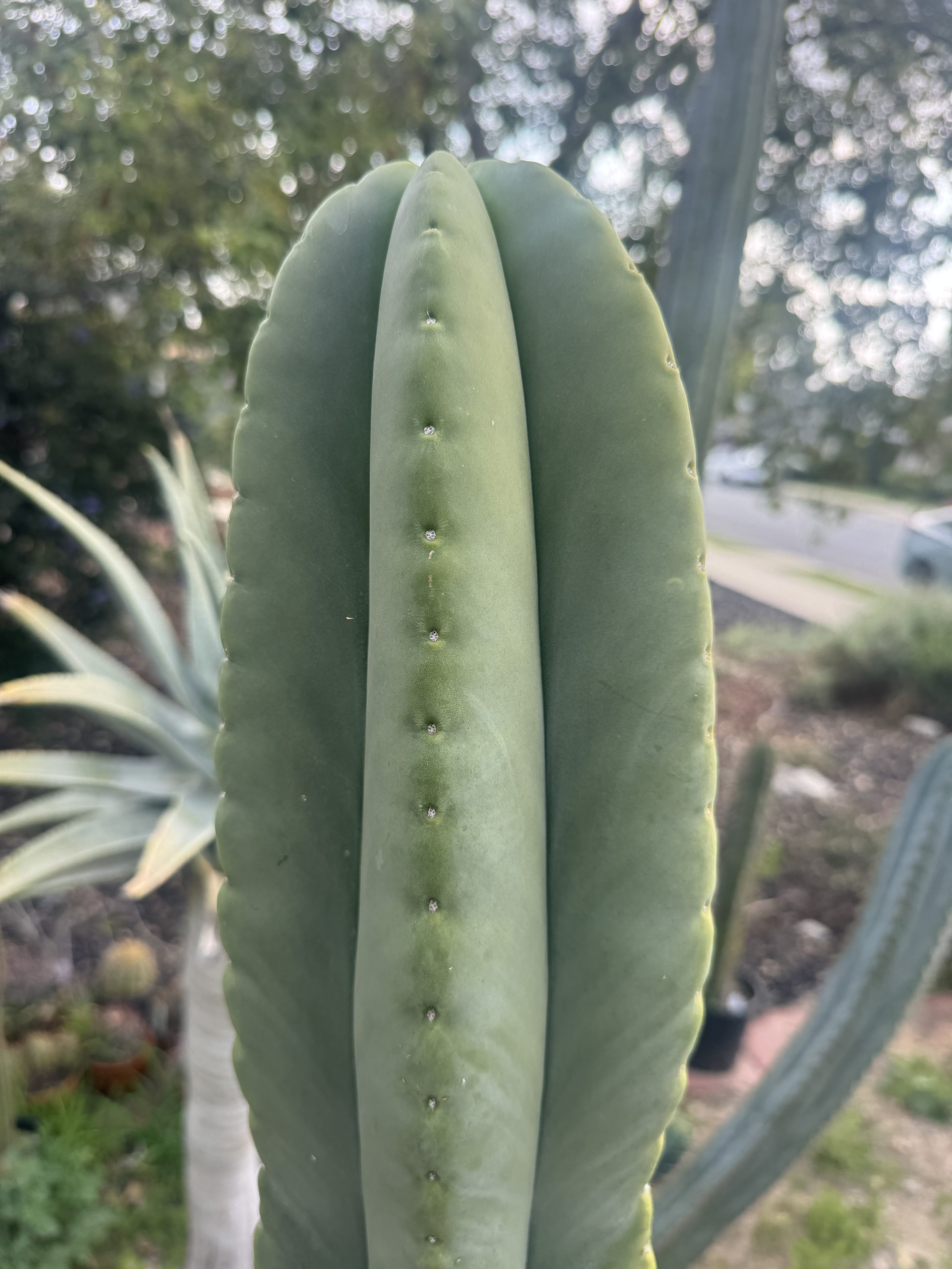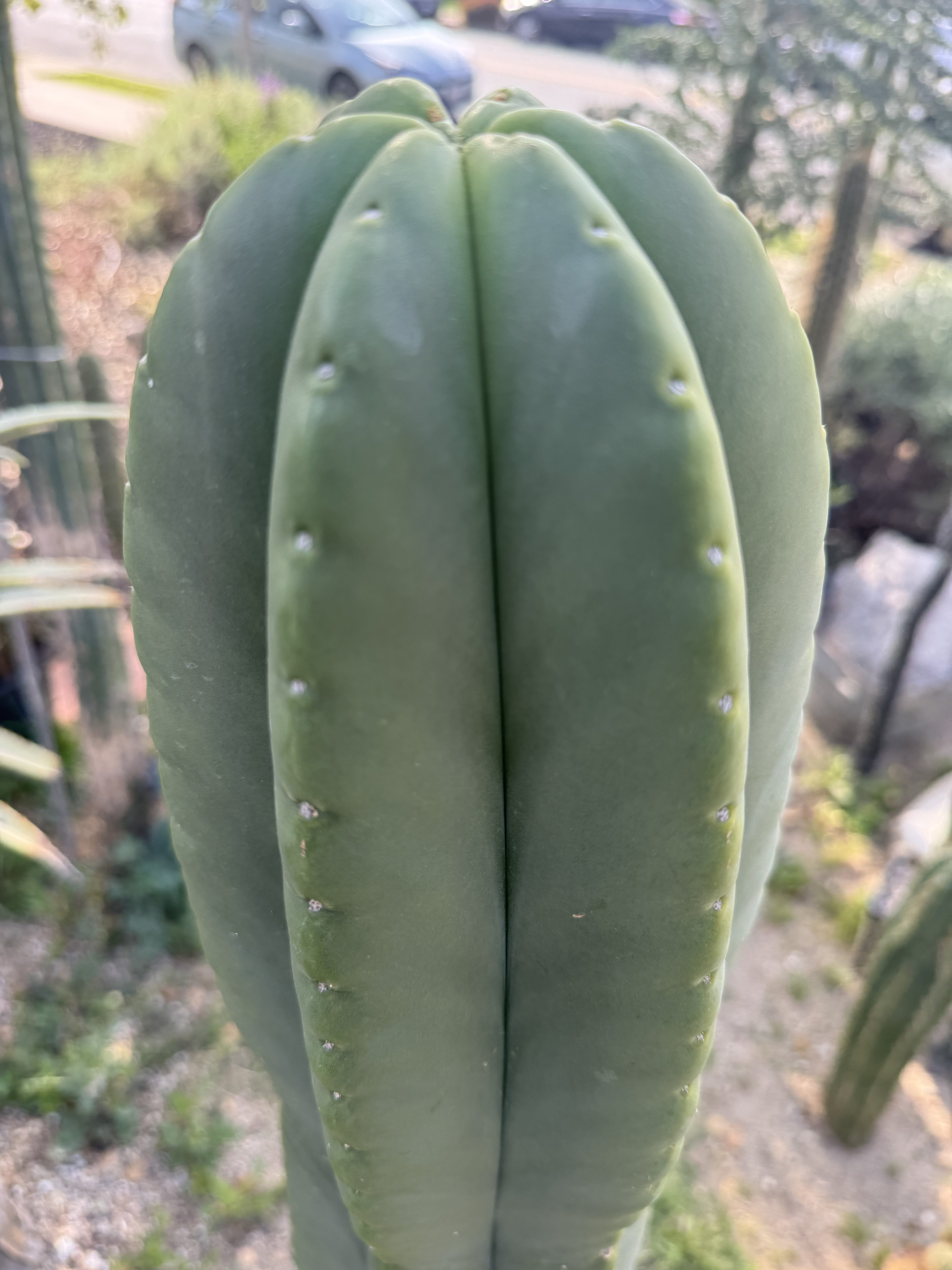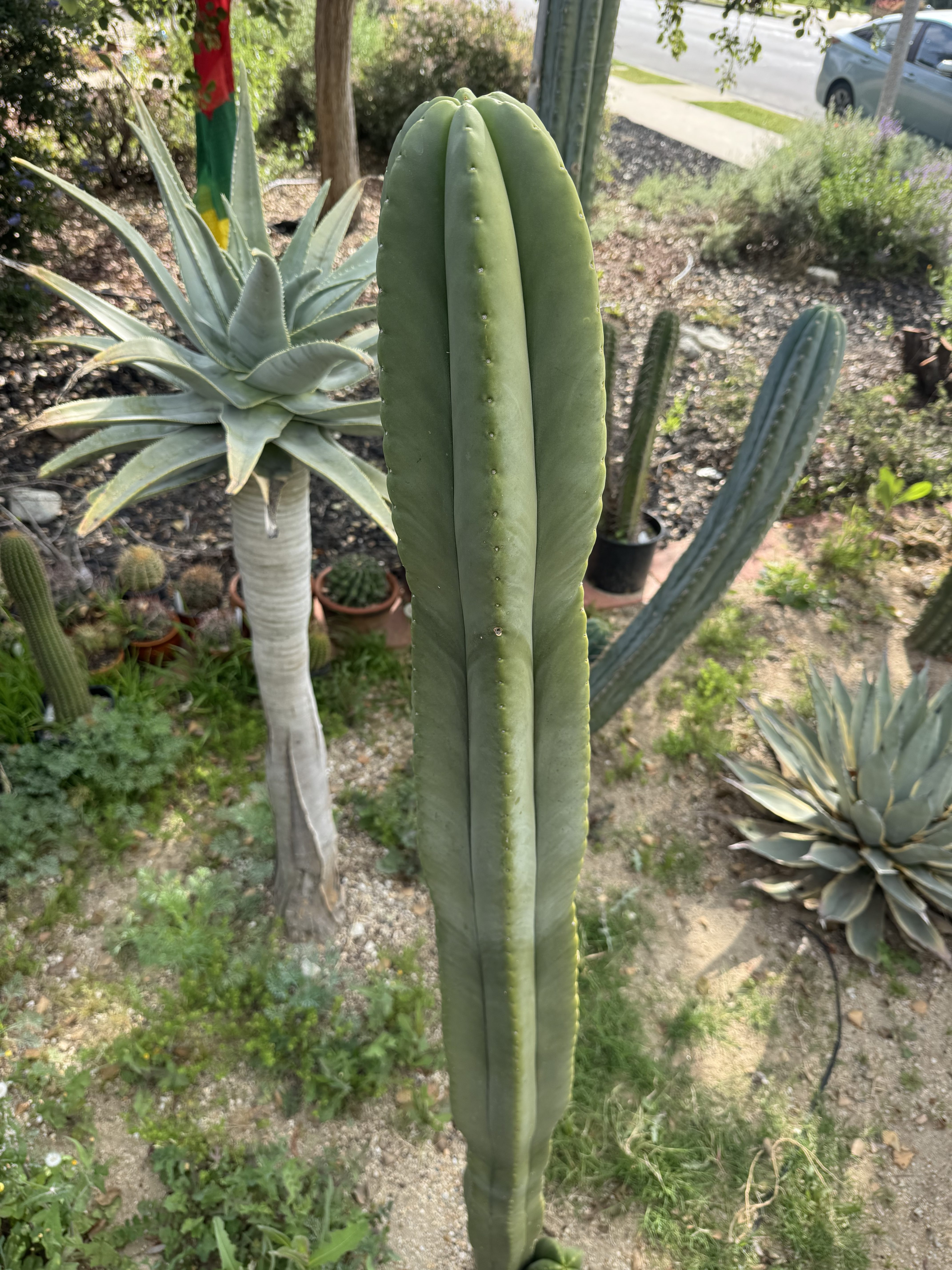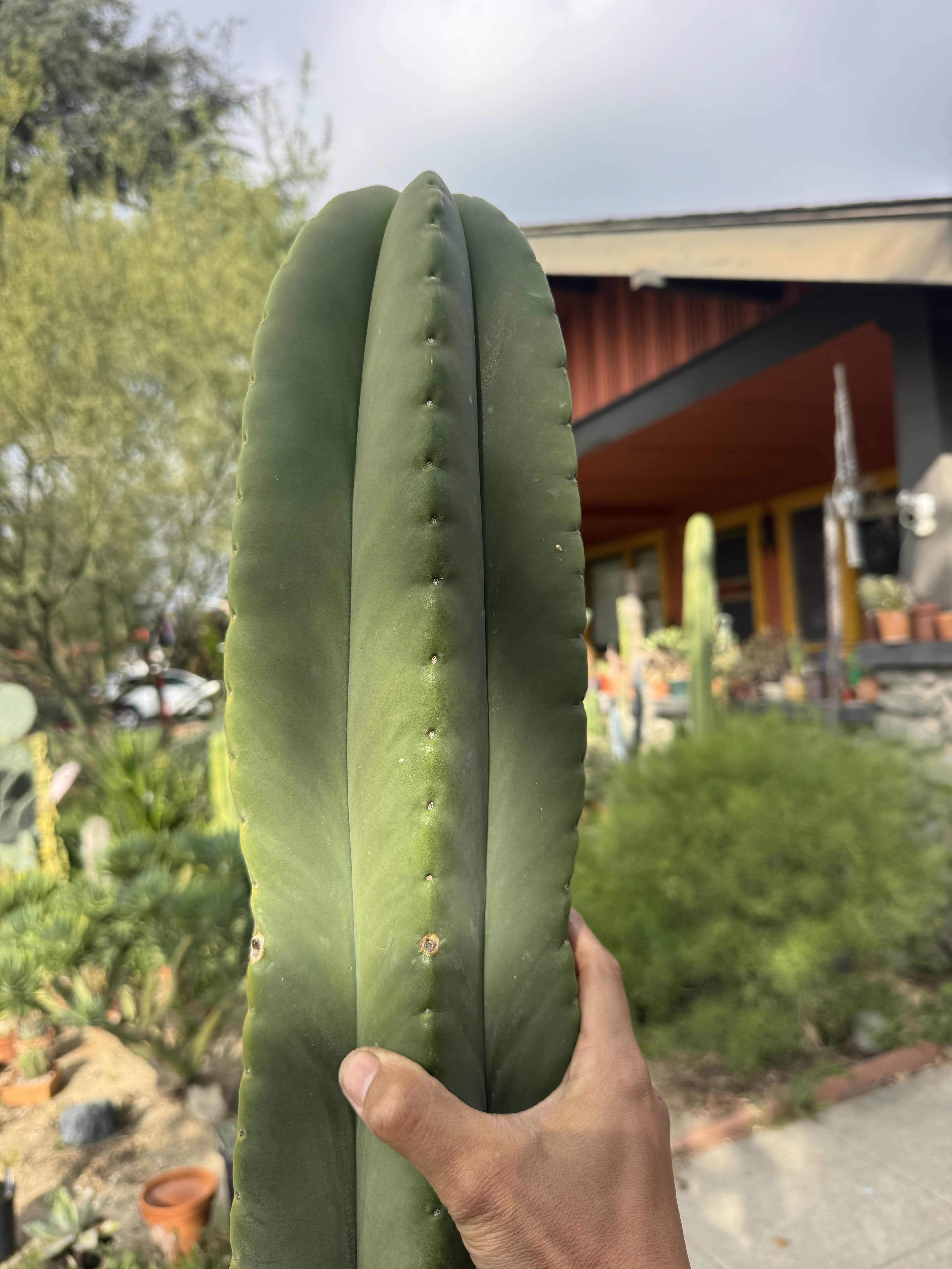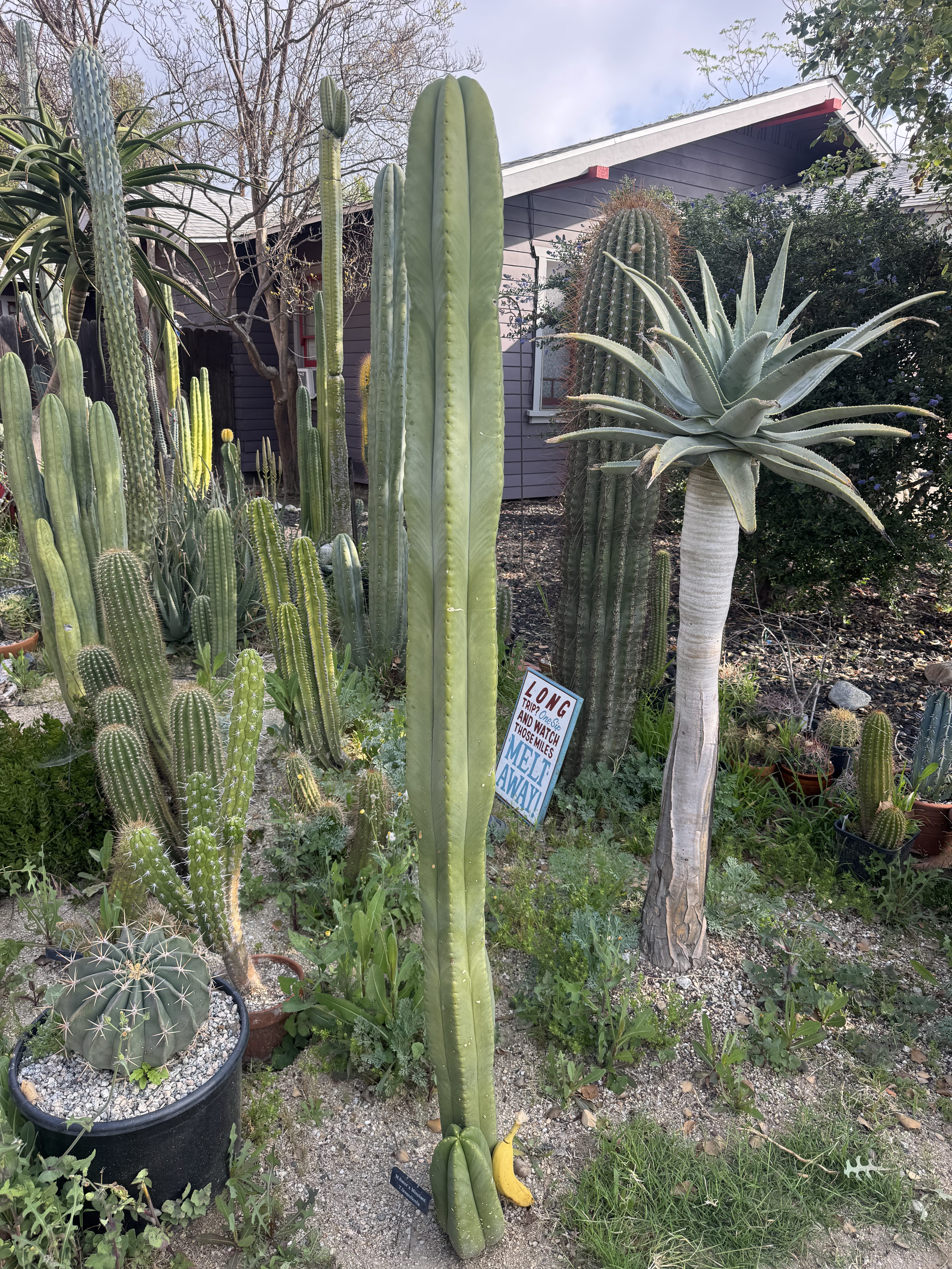 MB X MP T. scopulicola. The Bolivian Tricho that grows thick columned and short spined. To the point of looking and feeling seemingly spineless. This is 6 foot unit ready to be grounded in your yard from my own collection. I could cut and propagate it but I think it deserves to be a whole plant. You want large fat scop? this is the one, seed grown maybe 8 years ago. organic banana for scale