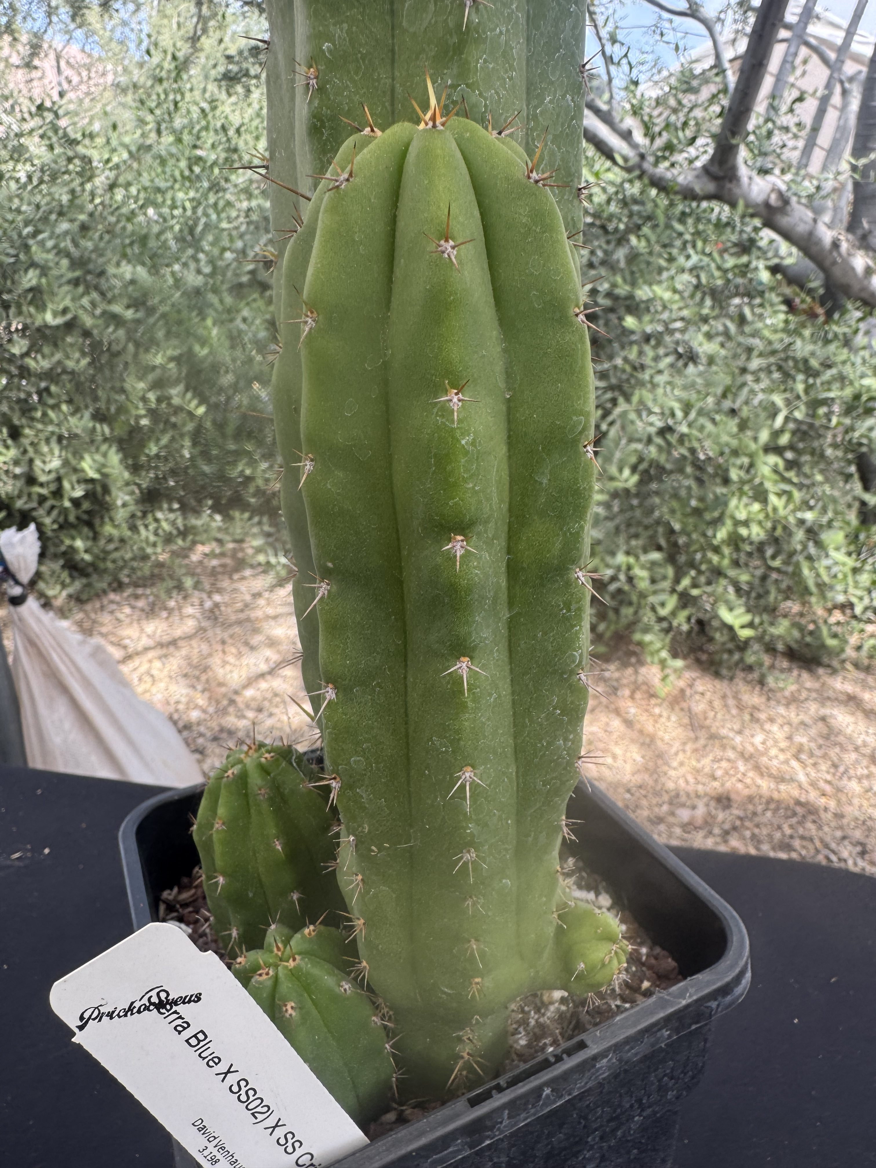 (Serra Blue x SS02 ) x SS Cristata. This one is 5 years old and I’ve been intently watching for it to go weird again. The goal with this phenotype was to see a crest with very long spines. The column itself has looked great, but we still wait patiently for its monstrose genetics to show again.