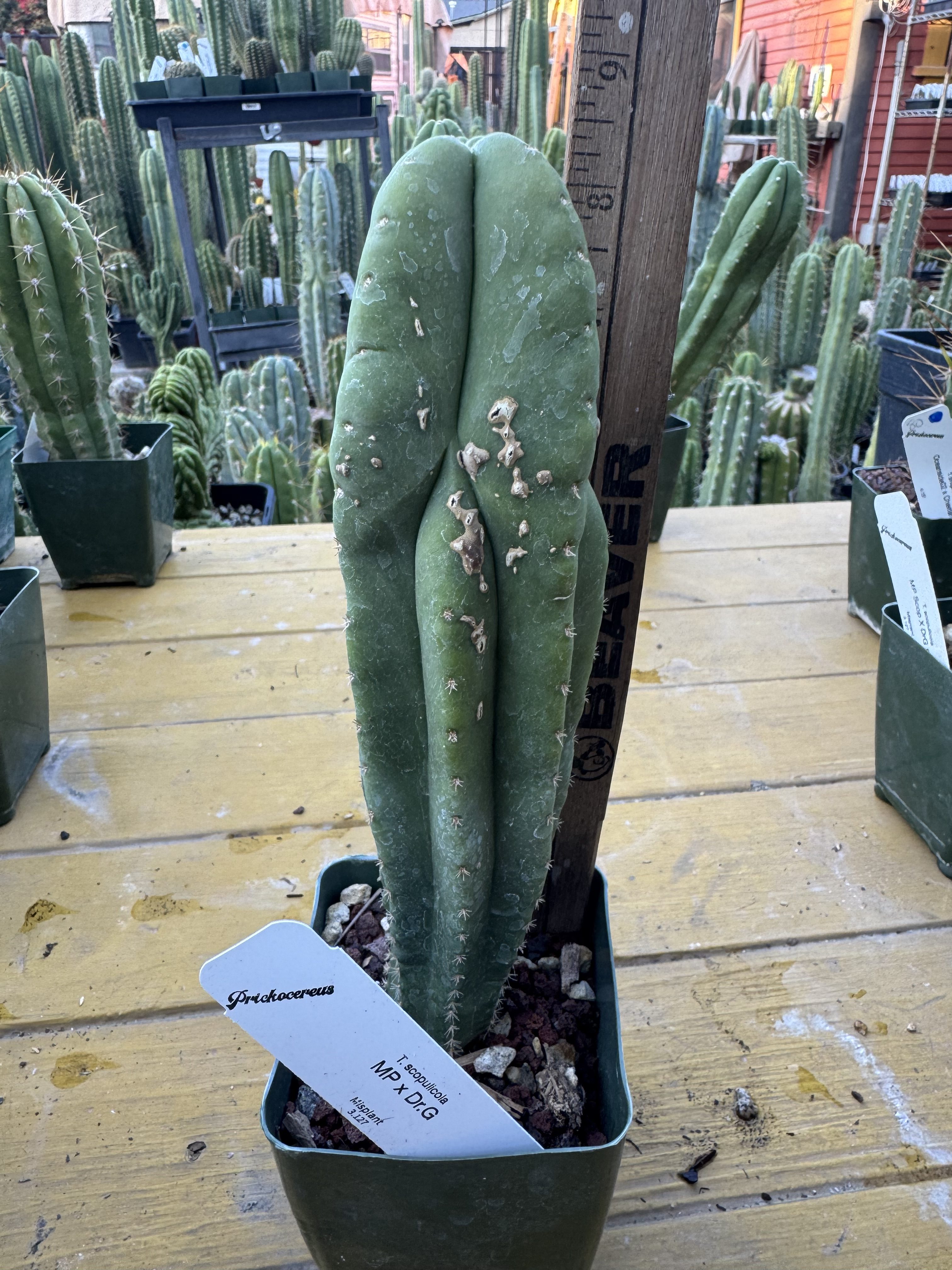 Seed grown Trichocereus scopulicola from Misplant seed. We love all the scops, and the seedlings and yearlings are no exception. The very smooth sometimes leathery skin, and very short spination is a fan favorite of Trichocereus collectors. Sown here in our garden.