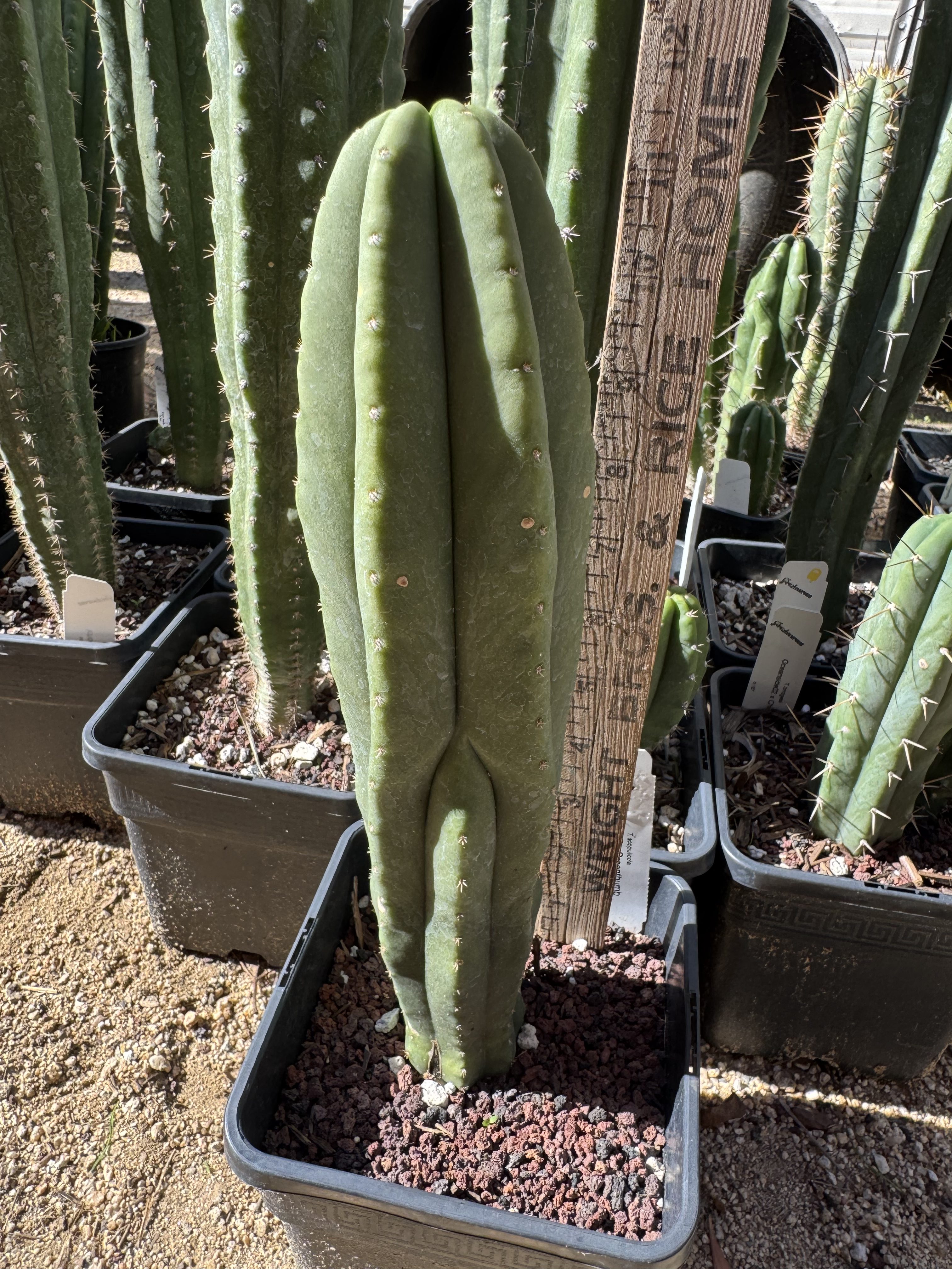 Seed grown Trichocereus scopulicola from Misplant seed. We love all the scops, and the seedlings and yearlings are no exception. The very smooth sometimes leathery skin, and very short spination is a fan favorite of Trichocereus collectors. Sown here in our garden.