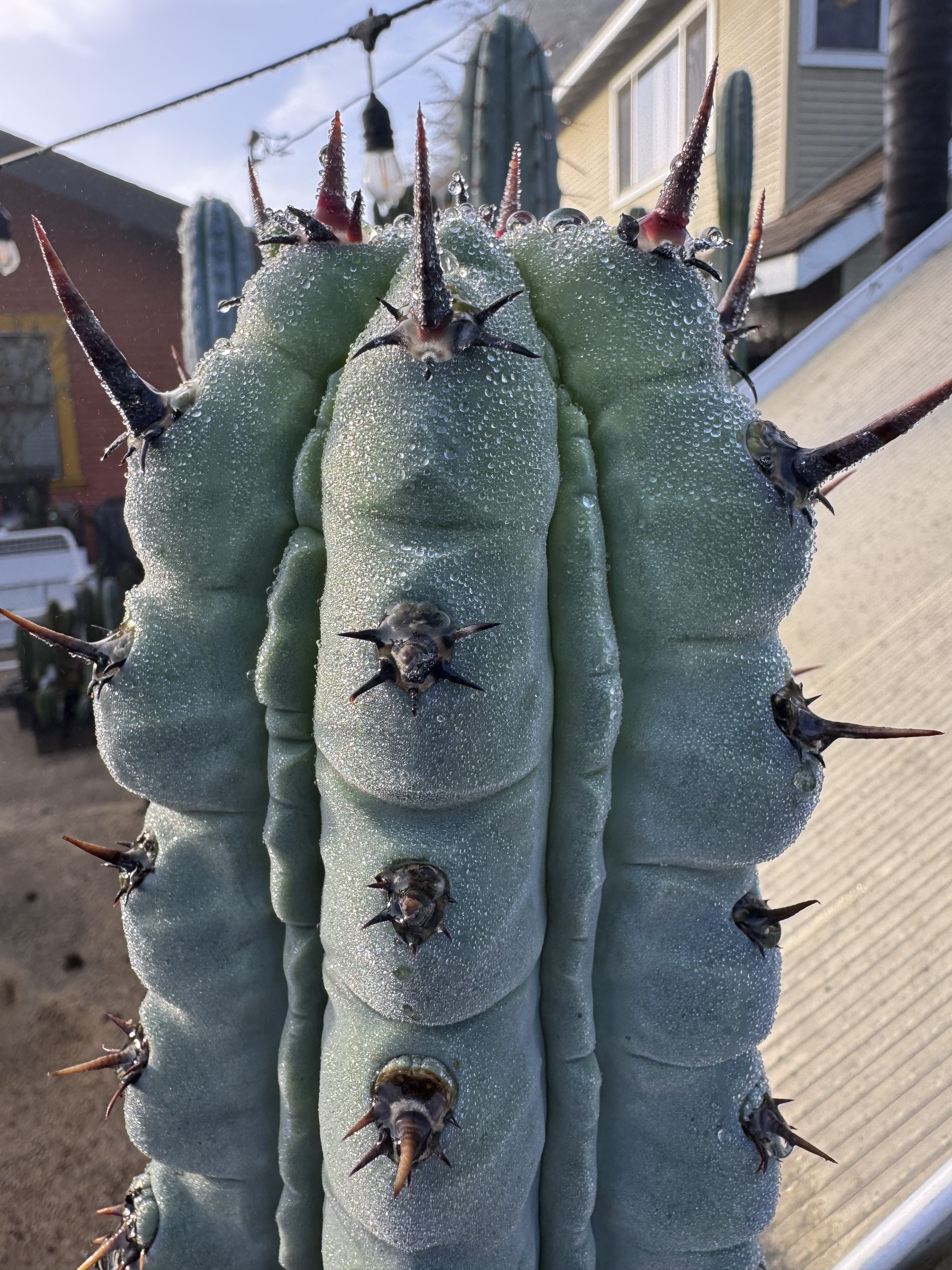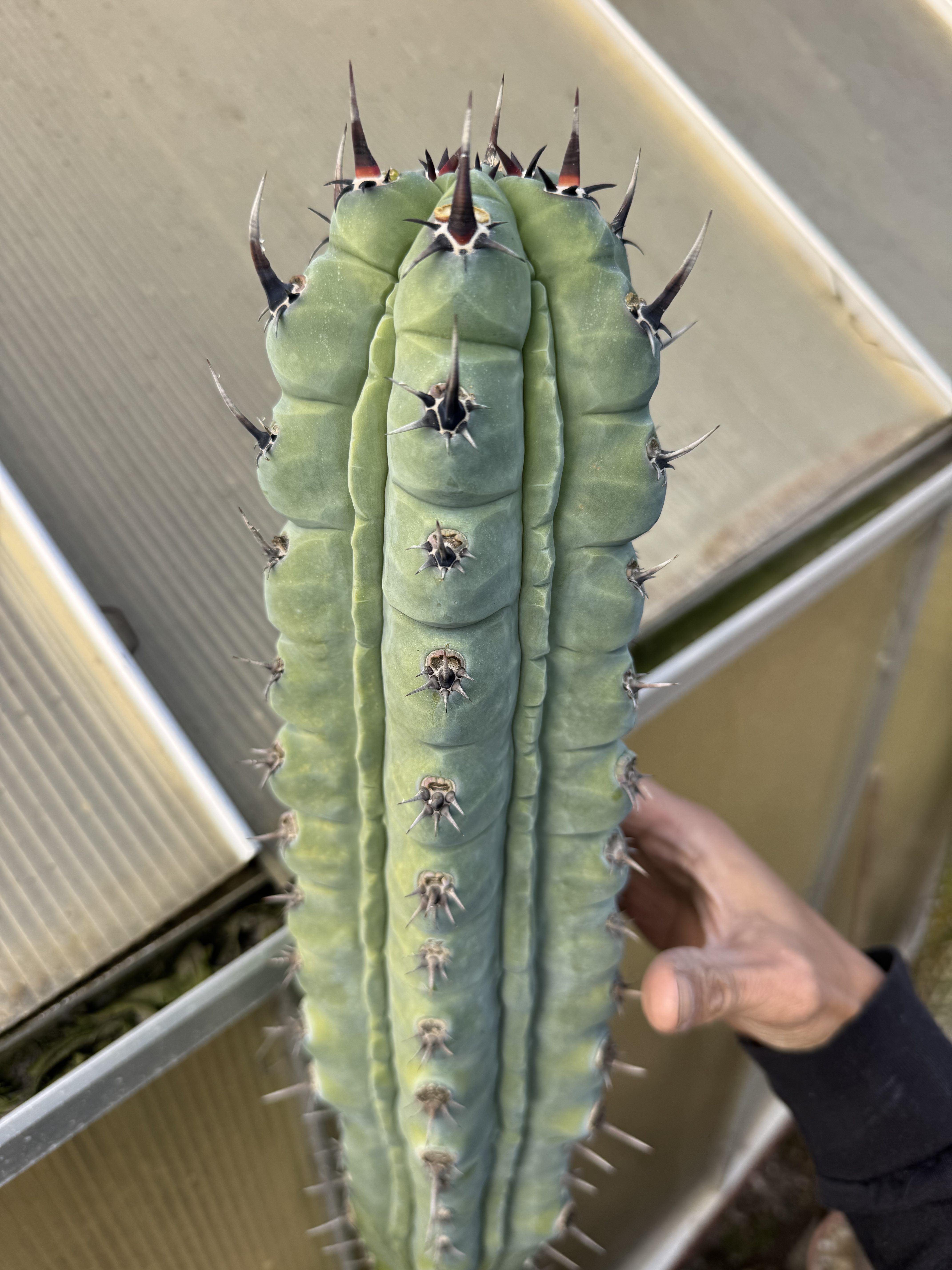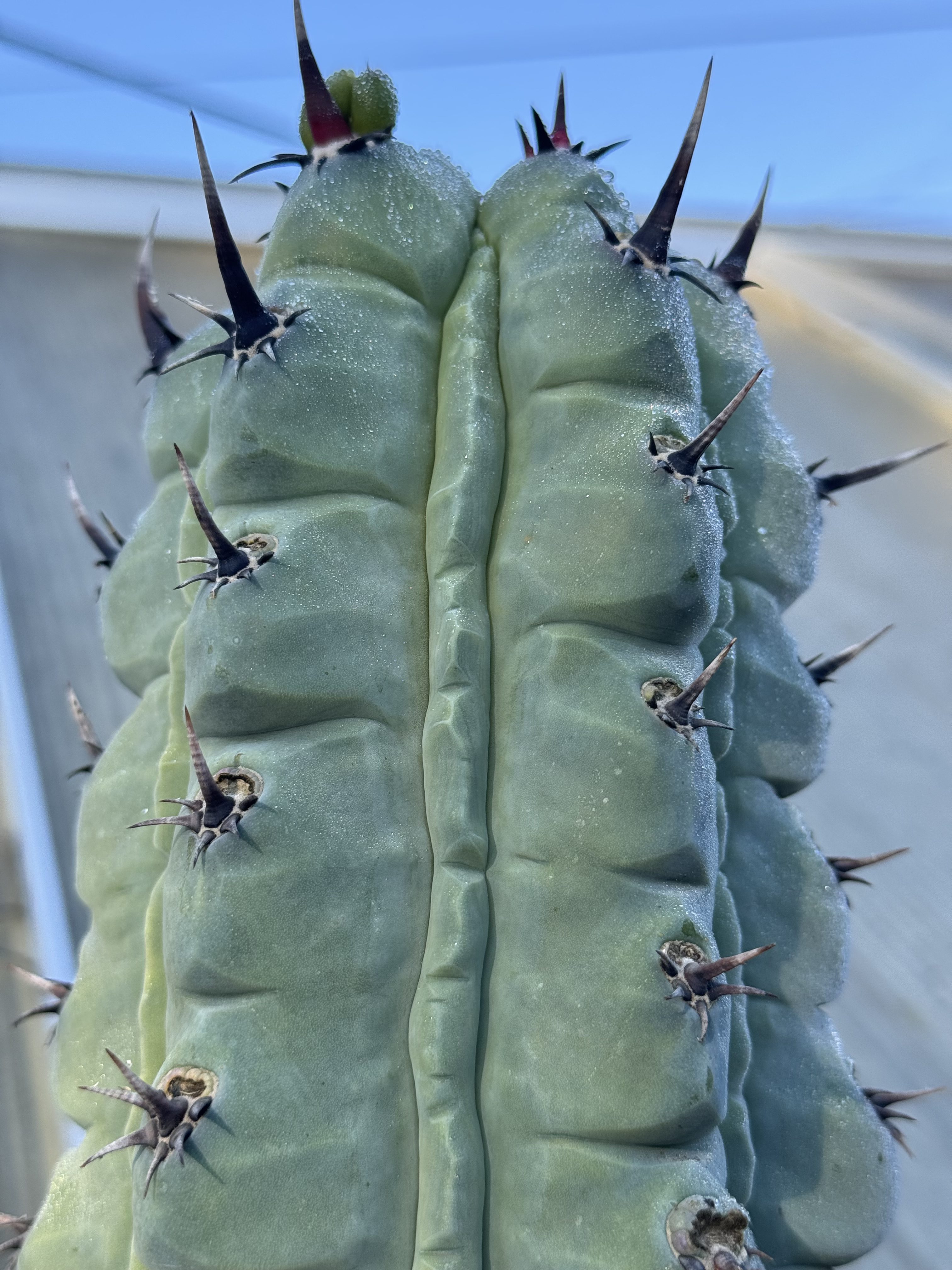 Monstrosa Myrtillocactus Grecas found by Irvin Cano Montezuma in MX. A wonderful form of monstrose that alternates ribs that produce no spines or areoles. A lateral spineless rib that is consistent on every single one we’ve seen gives it a great look. Look at how it matures! Gorgeous plant