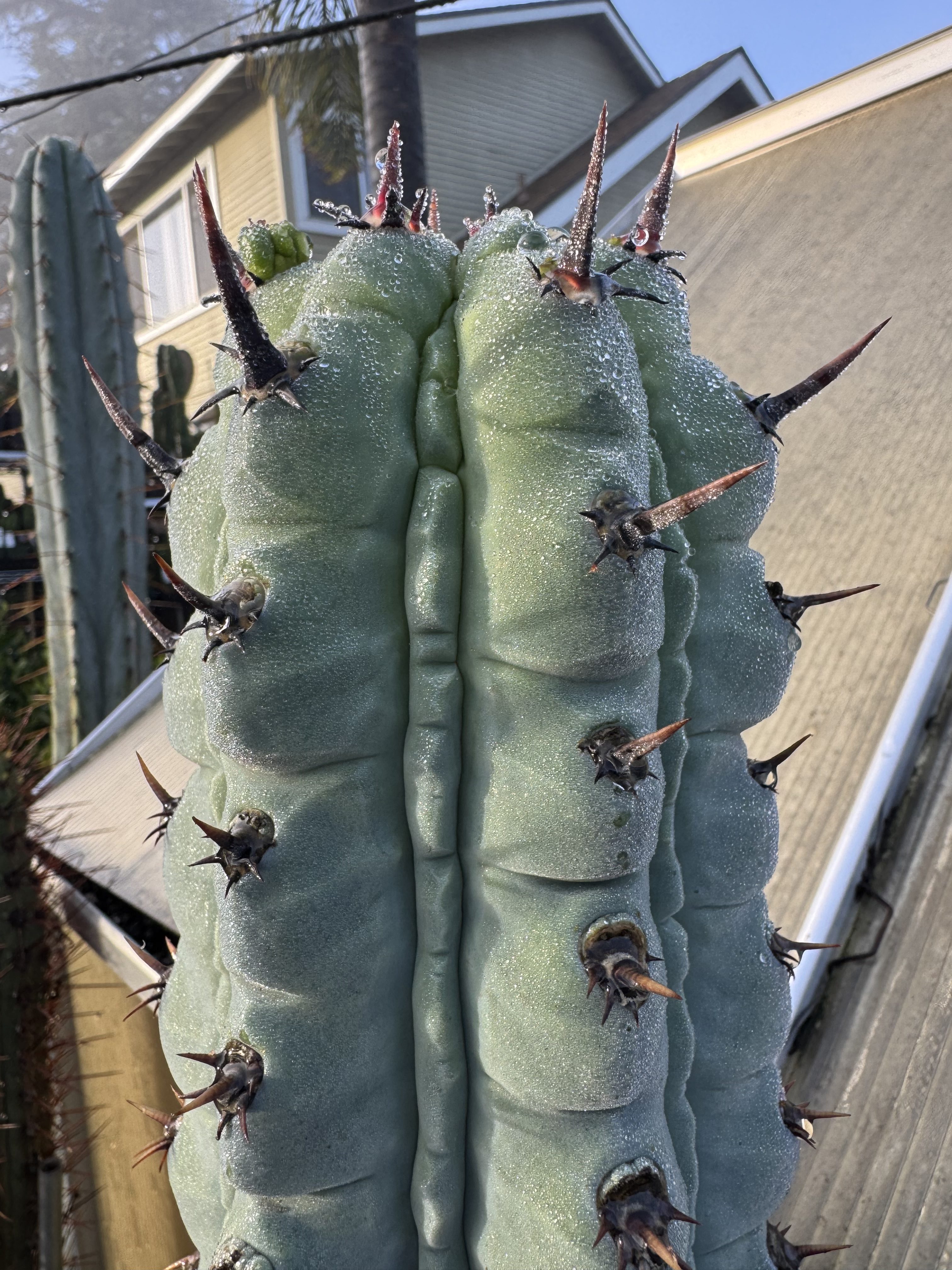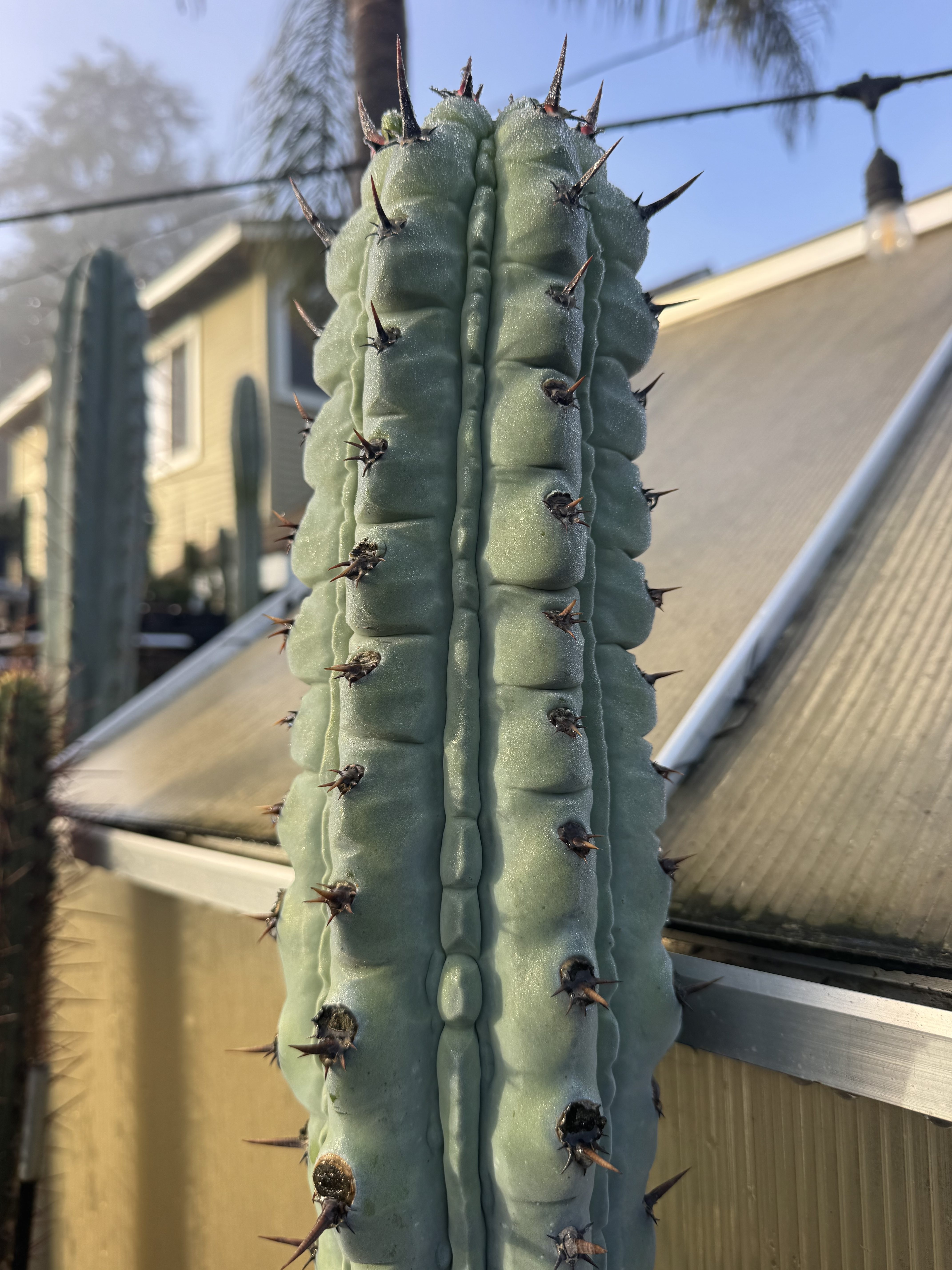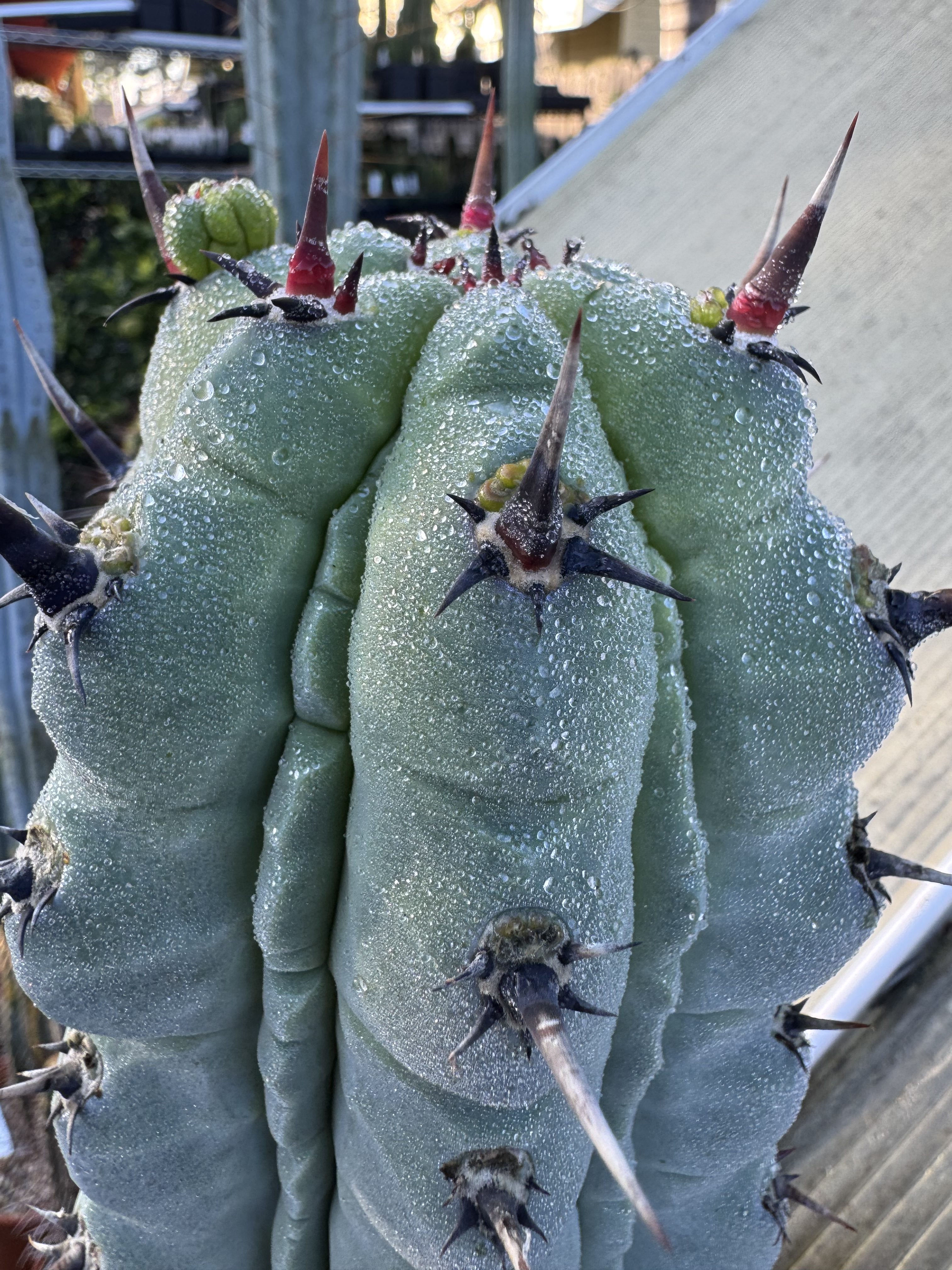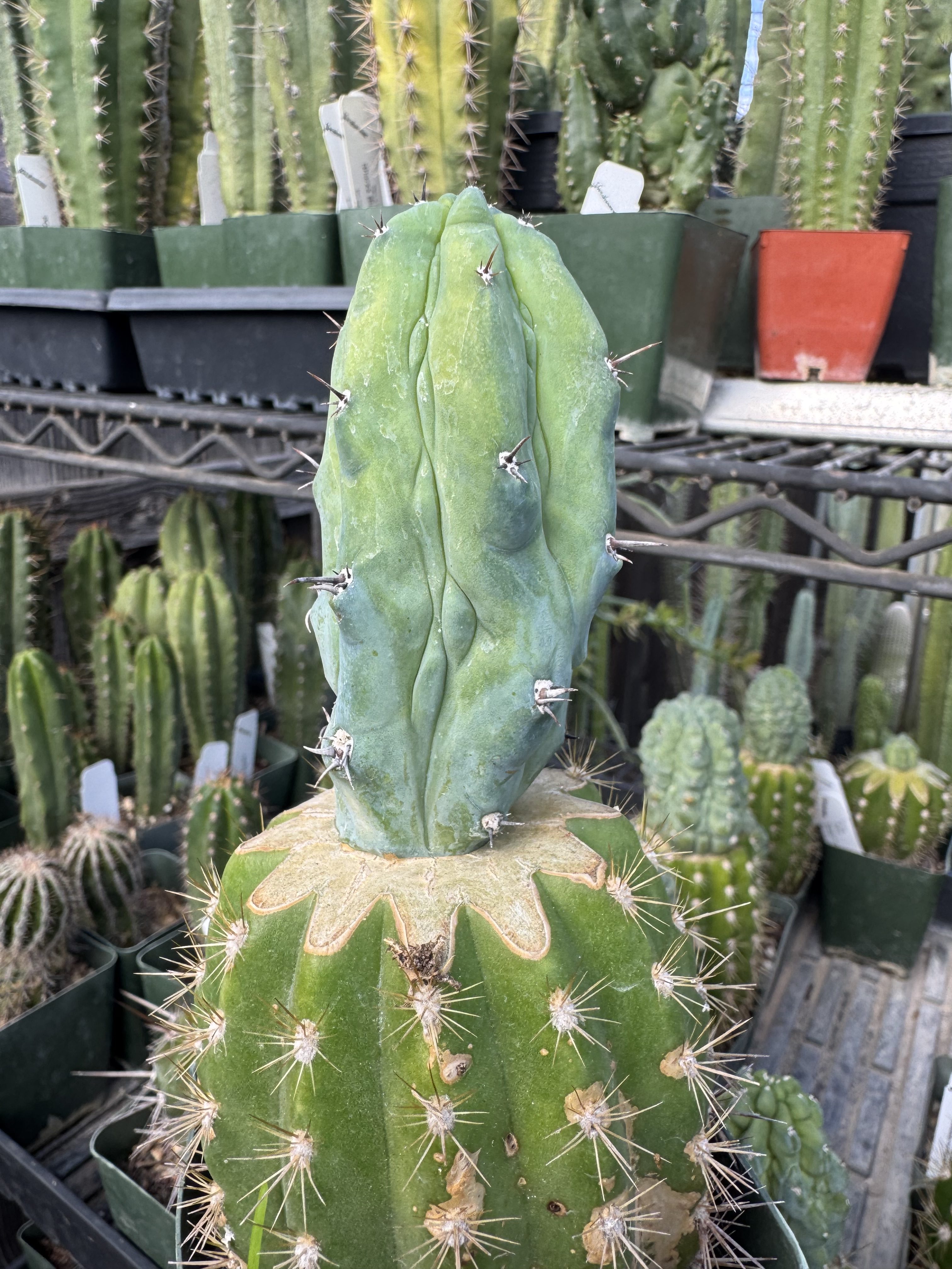 Monstrosa Myrtillocactus Grecas found by Irvin Cano Montezuma in MX. A wonderful form of monstrose that alternates ribs that produce no spines or areoles. A lateral spineless rib that is consistent on every single one we’ve seen gives it a great look. Look at how it matures! Gorgeous plant