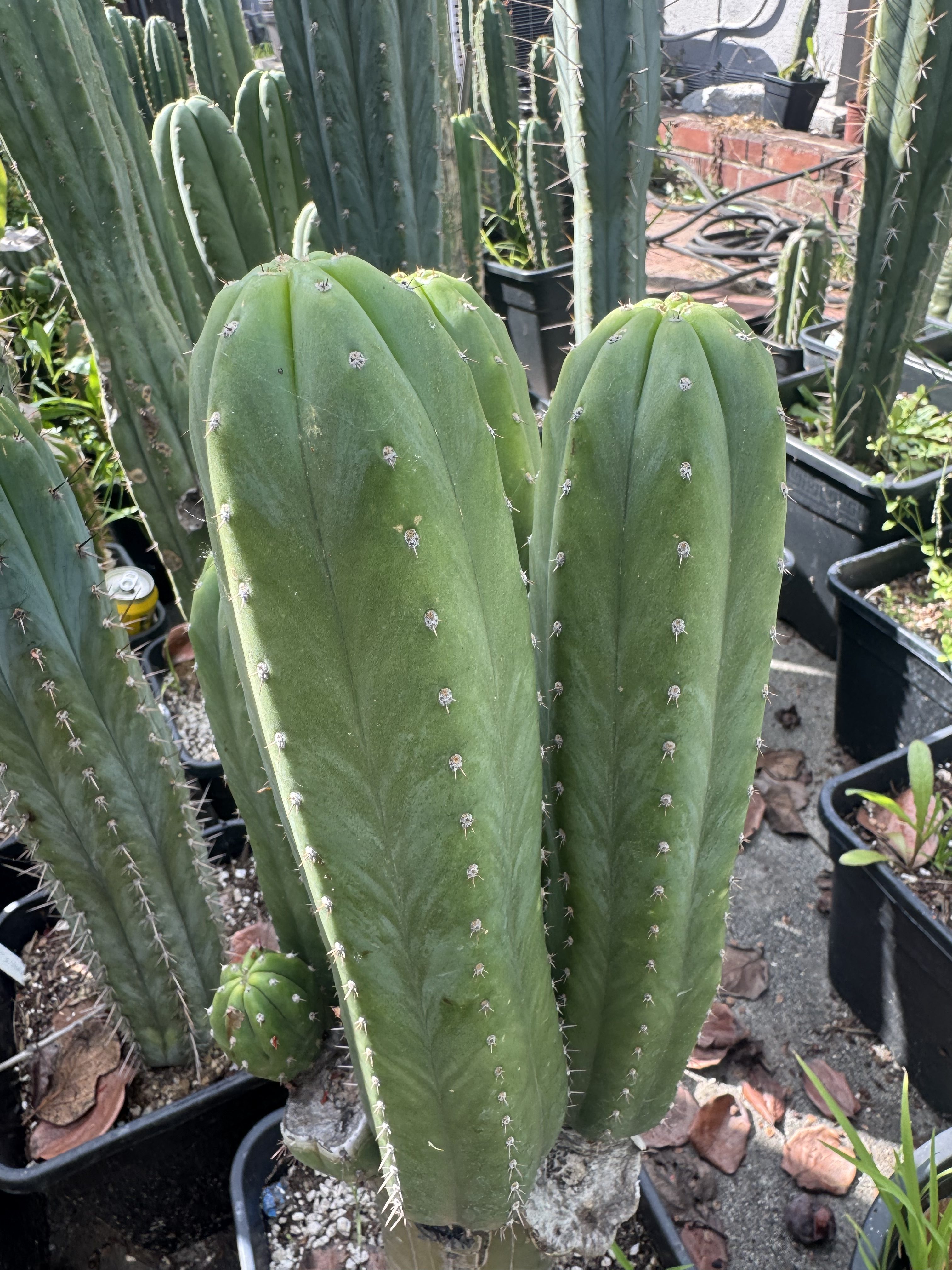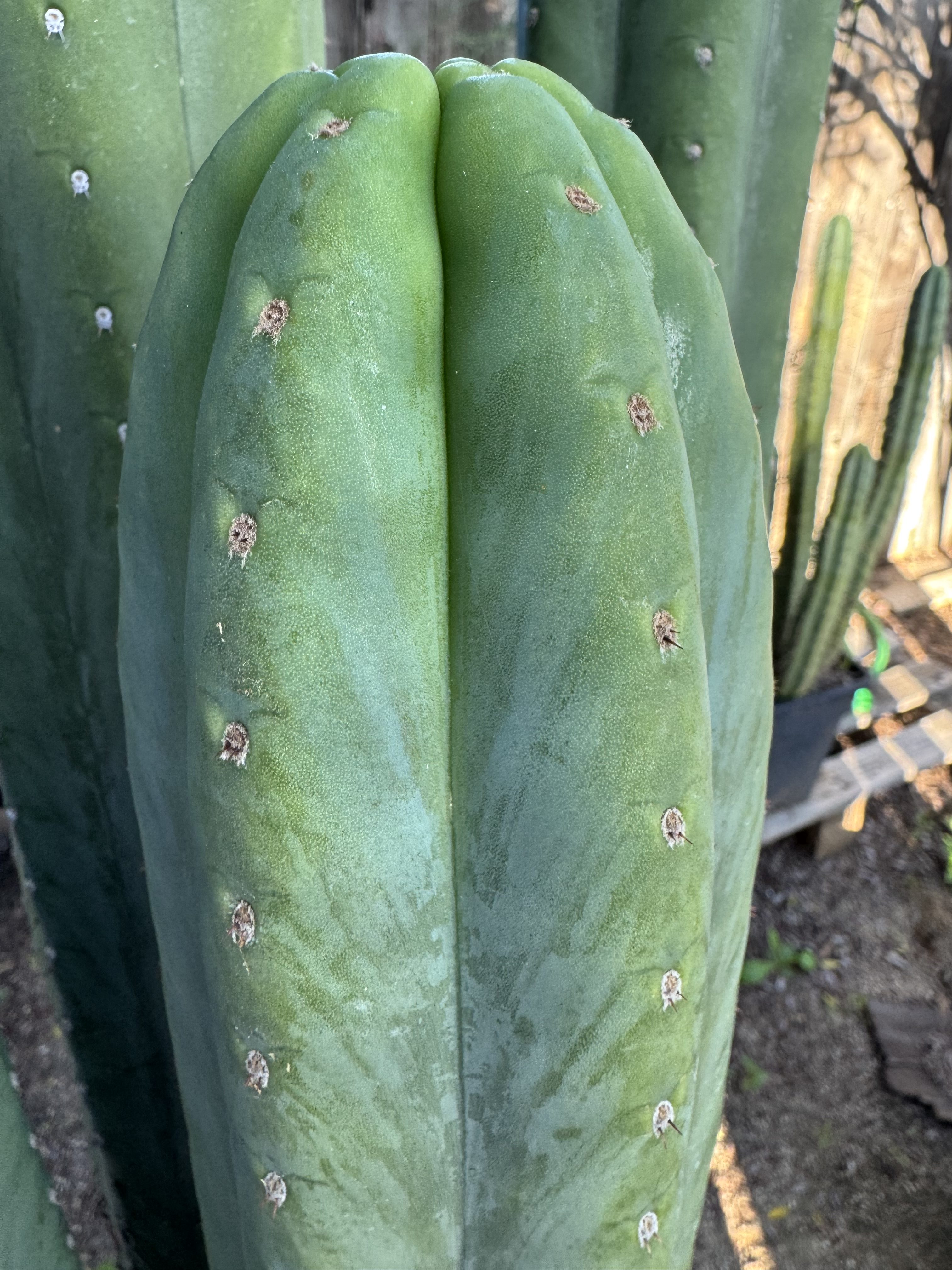 This is Piru pachanoi. A gorgeous looking pach found in a dairy farm in Chino, California. The farm needed the massive stand removed so they had all of it dug up. It’s actually fairly interesting to see this phenotype of a pachanoi like this. The reddish areoles and short spines, on that glaucous blue skin. This is my stand of it thats been growing for a few years since getting my piece from Pat. It’s got a gorgeous look in full sun or in a bit of shade from the afternoon sun.