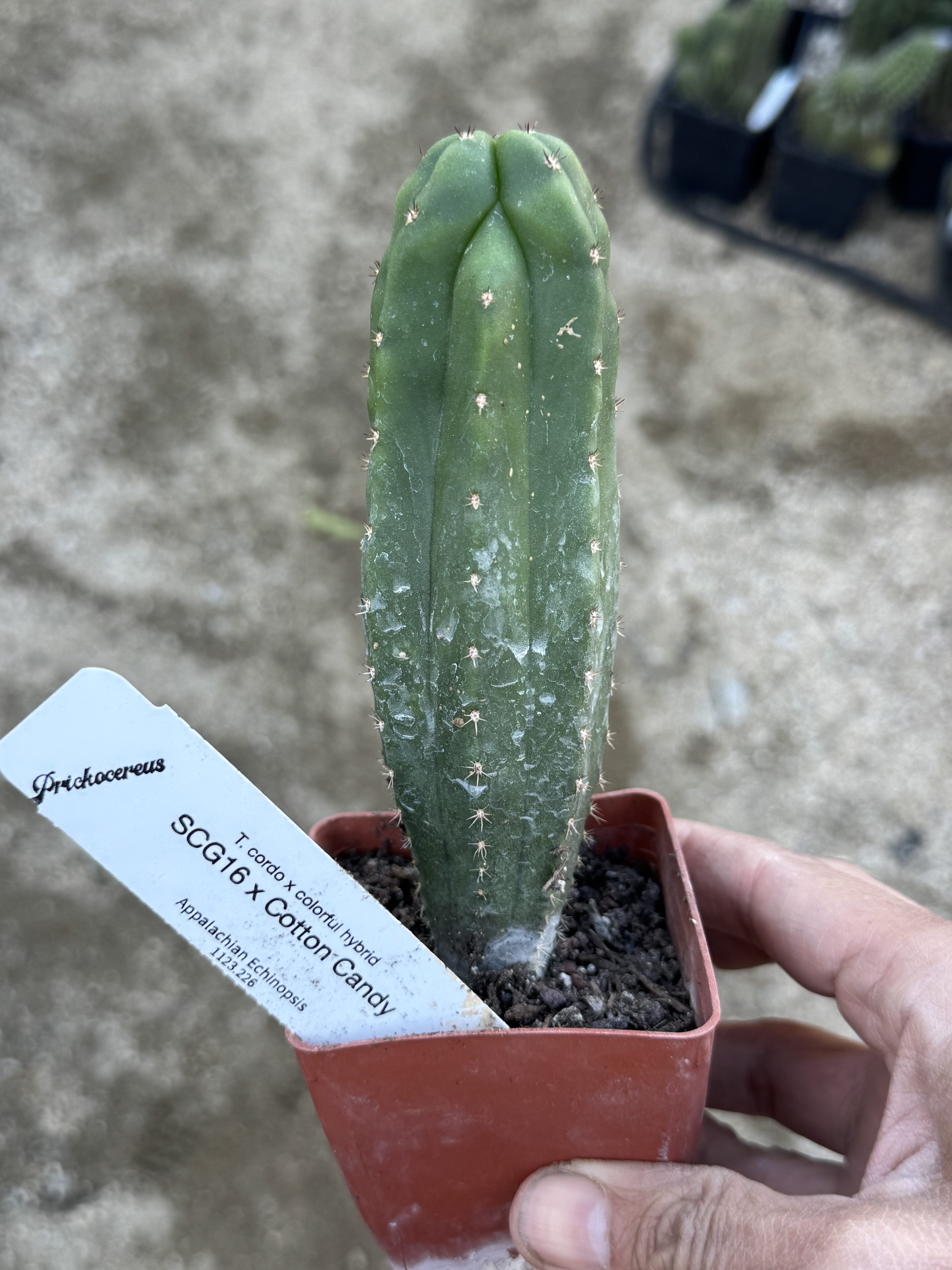 SCG16 x Cototn Candy is a scop/cordo x colorful hybrid : Appalachian Echinopsis made this cross between a scop/cordo and a colorful hybrid named Cotton Candy. The hopes of a nice pink flower will come from these thick skinned columns.