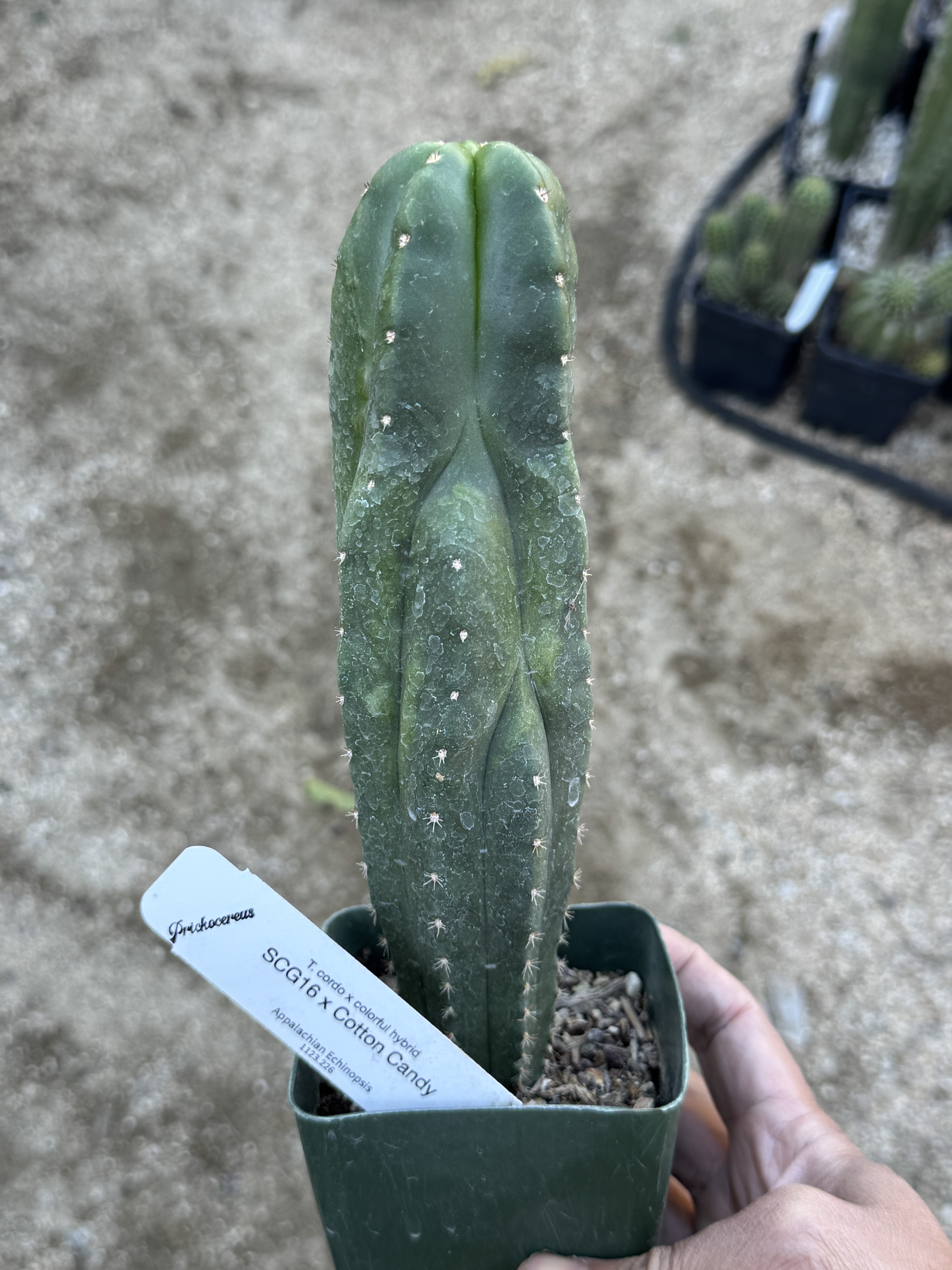 SCG16 x Cototn Candy is a scop/cordo x colorful hybrid : Appalachian Echinopsis made this cross between a scop/cordo and a colorful hybrid named Cotton Candy. The hopes of a nice pink flower will come from these thick skinned columns.