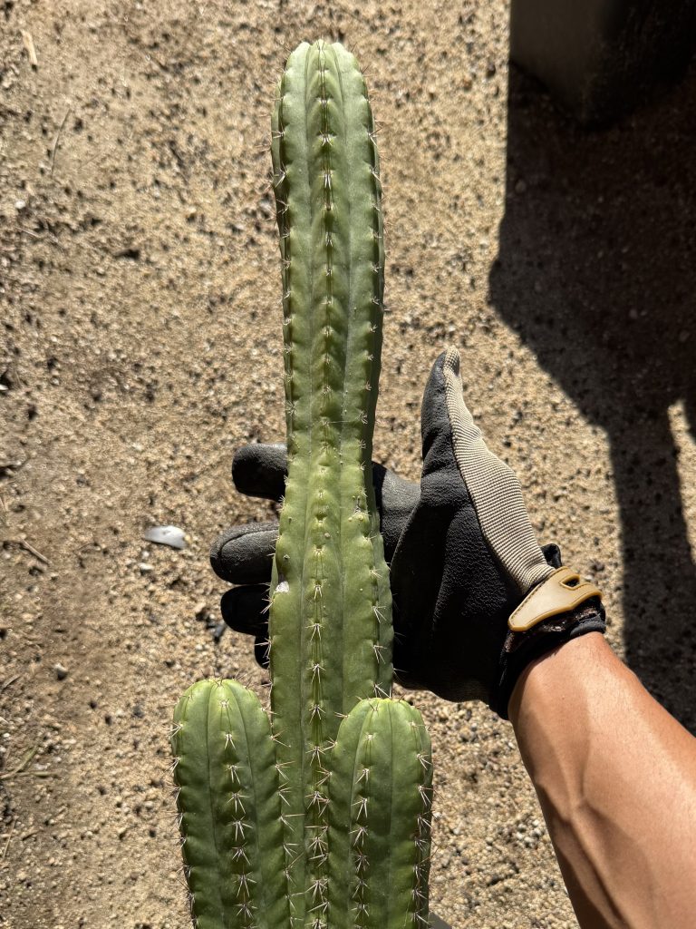 Stenoecereus beneckei inermis.  The plant I started with, the plant I have grown since 2019.  There are two main forms out there, the short spined (not truly inermis) and the longer spined.  The columnar cactus from Central Mexico, the natural growth for this plant is to have a light dusting of farina (or flour) that coats the epidermis for possible UV protection.  How it grows this white as mine is only in cultivation in a very well protected greenhouse.  The white coating grows and develops only on the newer growth.  As things may touch, blow, or wet the plant, the farina can come off. Forever.  It does not grow back the way some people might lead you to believe.  The whiteglove treatment is required to grow it this way.