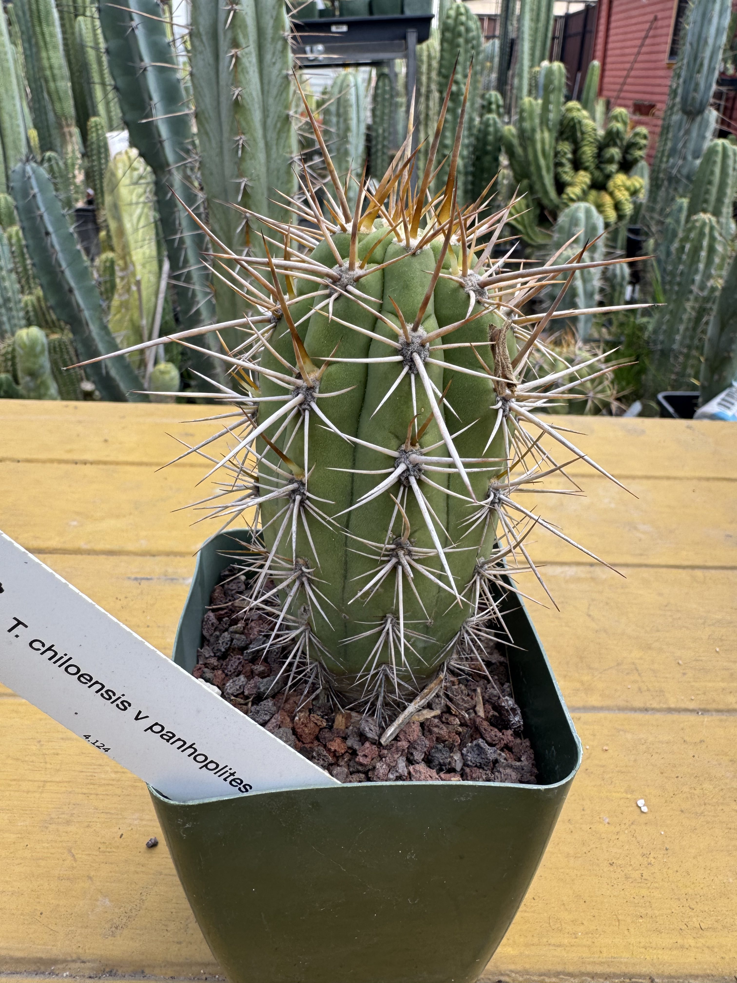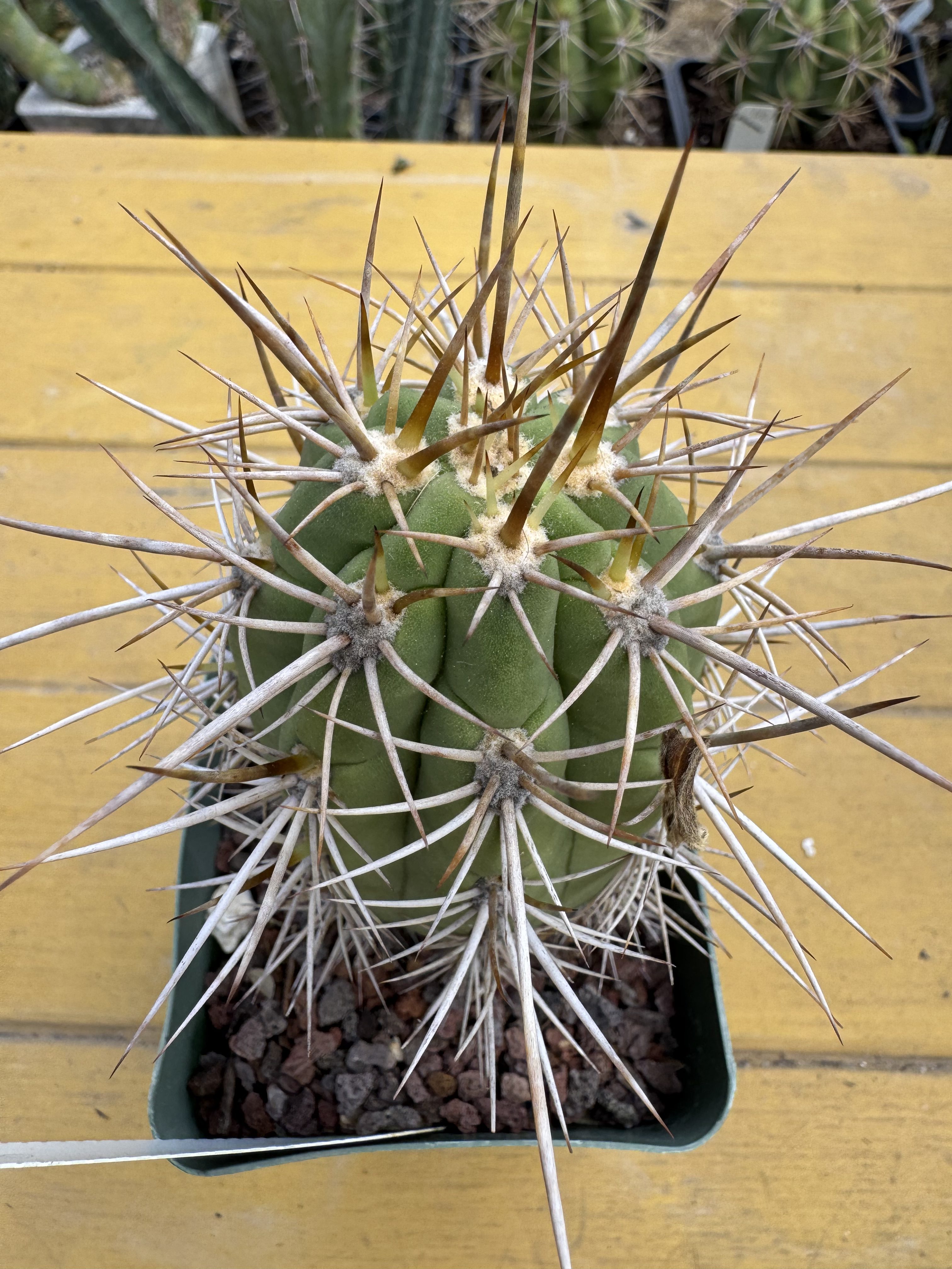 Seed grown T. chiloensis.  Chilean origins, these plants can produce some of the gnarliest, thickest dense spines. Some of my slowest Tricho’s to grow, I still love to grow them out.  There’s a lot of interest in some of those “other” Chilean plants, you know, the poas.  But I love these columnar ones we grow out for obvious gnarly mean spined reasons.