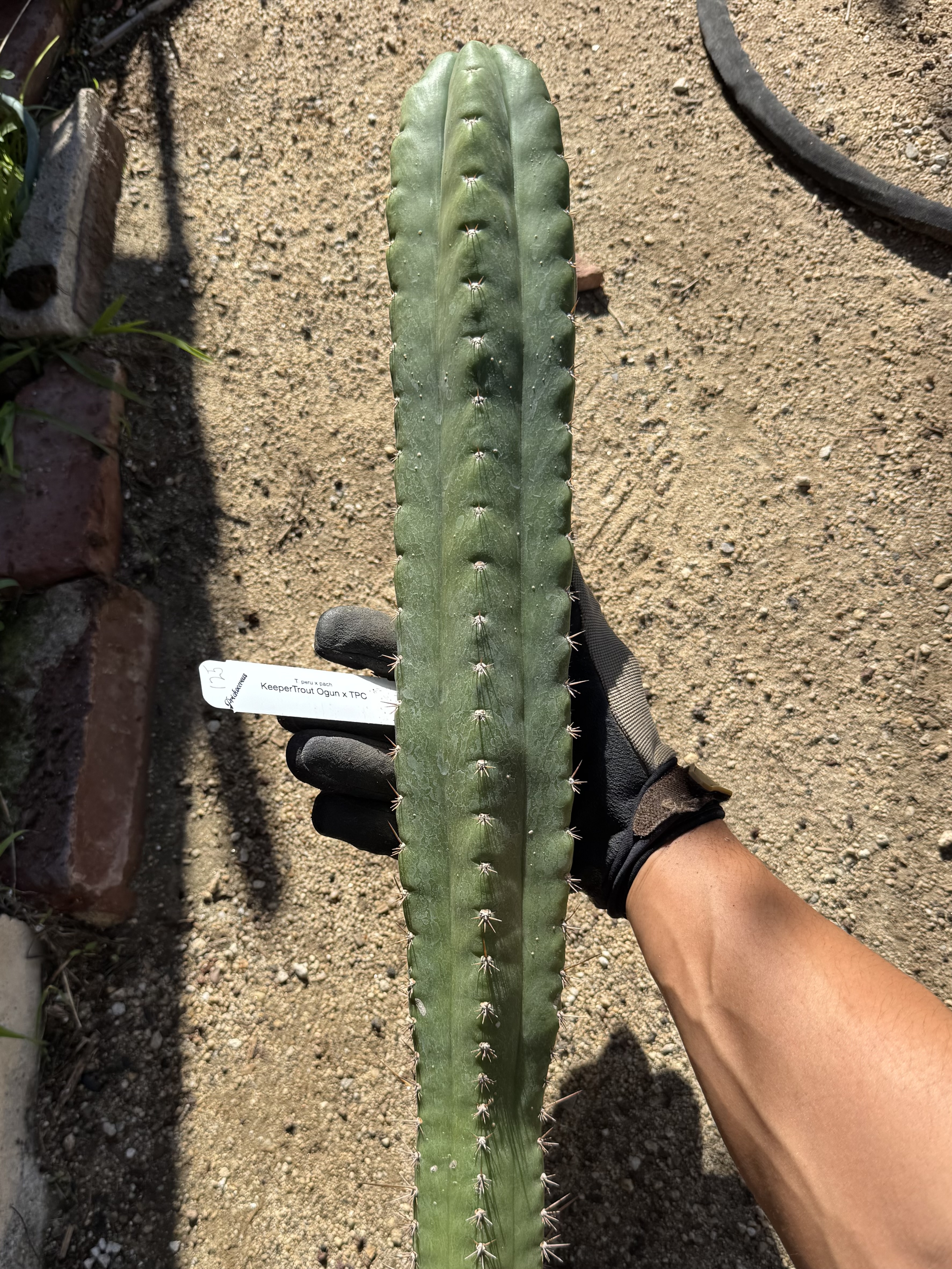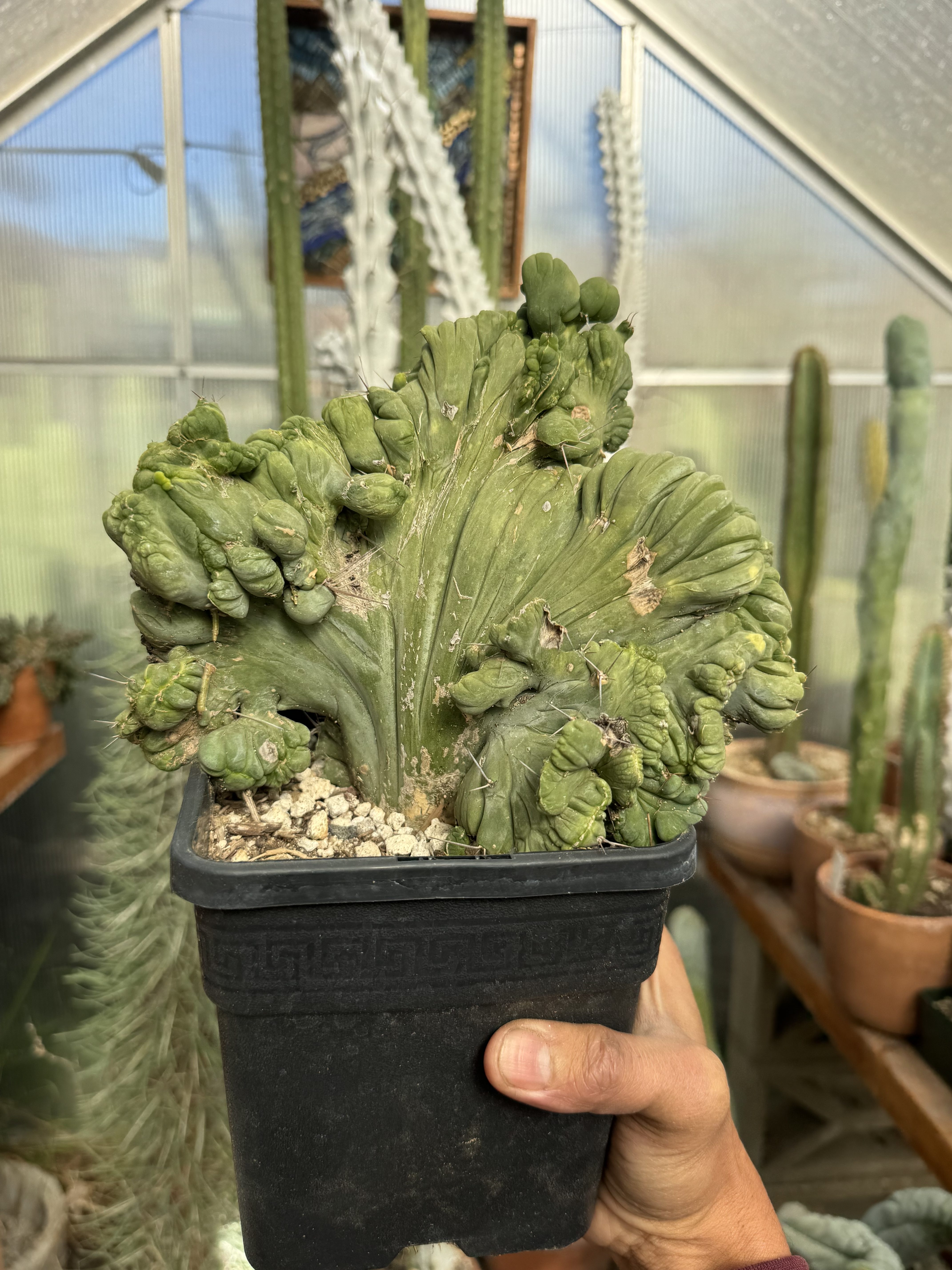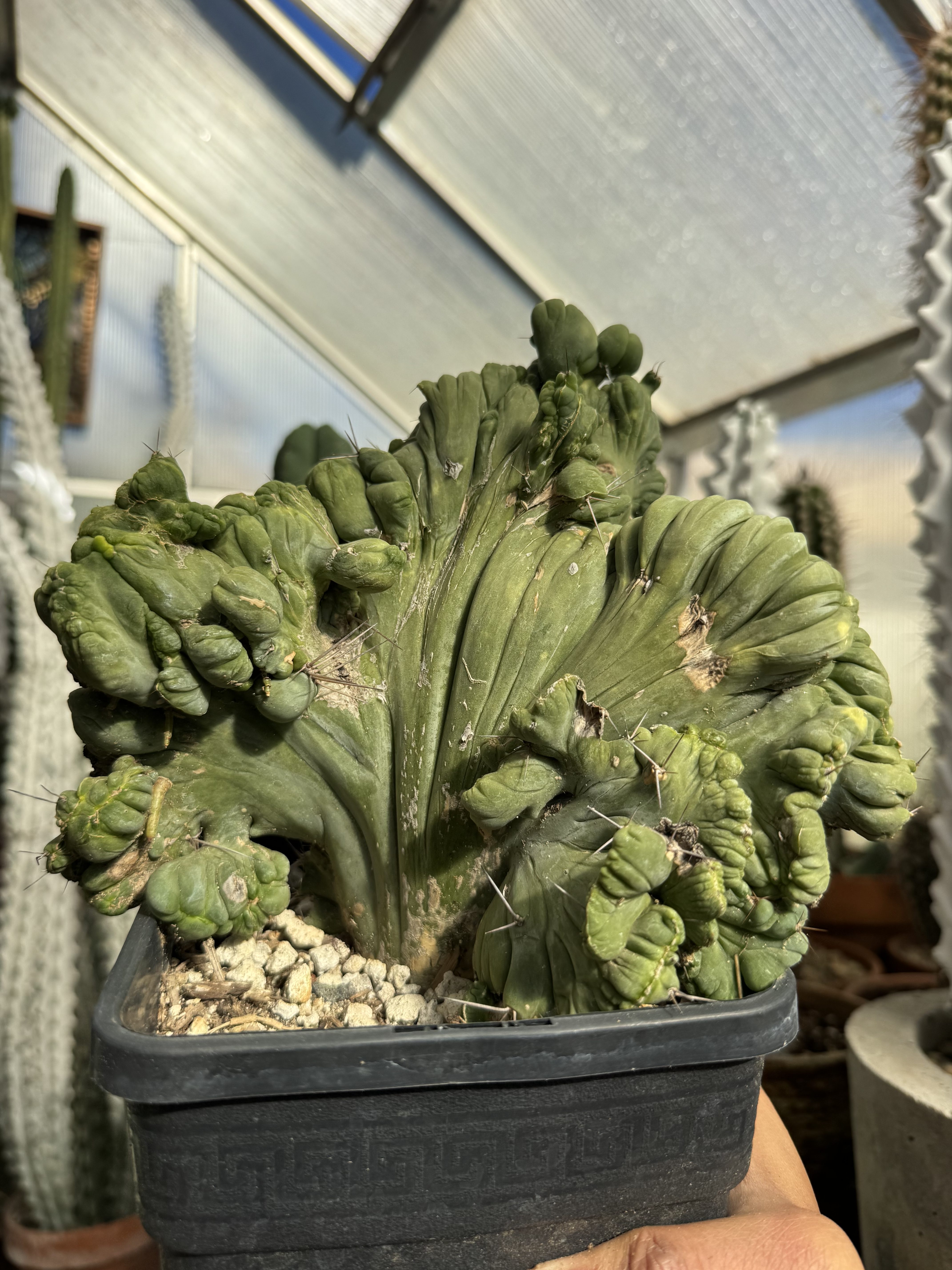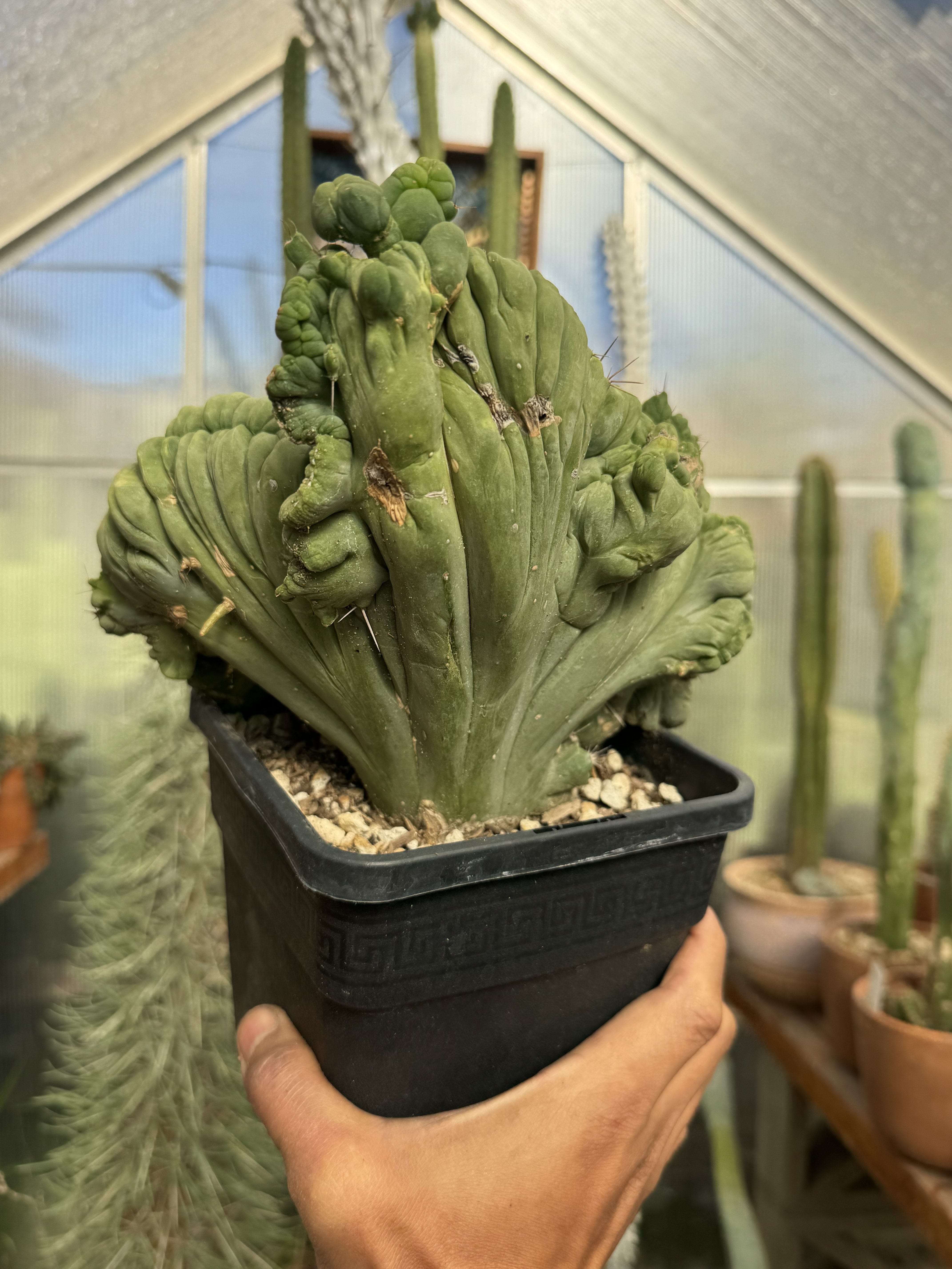 This is TBMC, or Trichocereus bridgesii monstrosa cristata. Many of us believe it’s a form of cresting TBM cl b, as the offsets that can come off of it are short formed. Another very nice thing about this large specimen is that it came from my mother plant that did produce some variegation. That plant wasn’t very consistent with the variegated pattern, but I thought I’d note it in case you see some interesting colors.