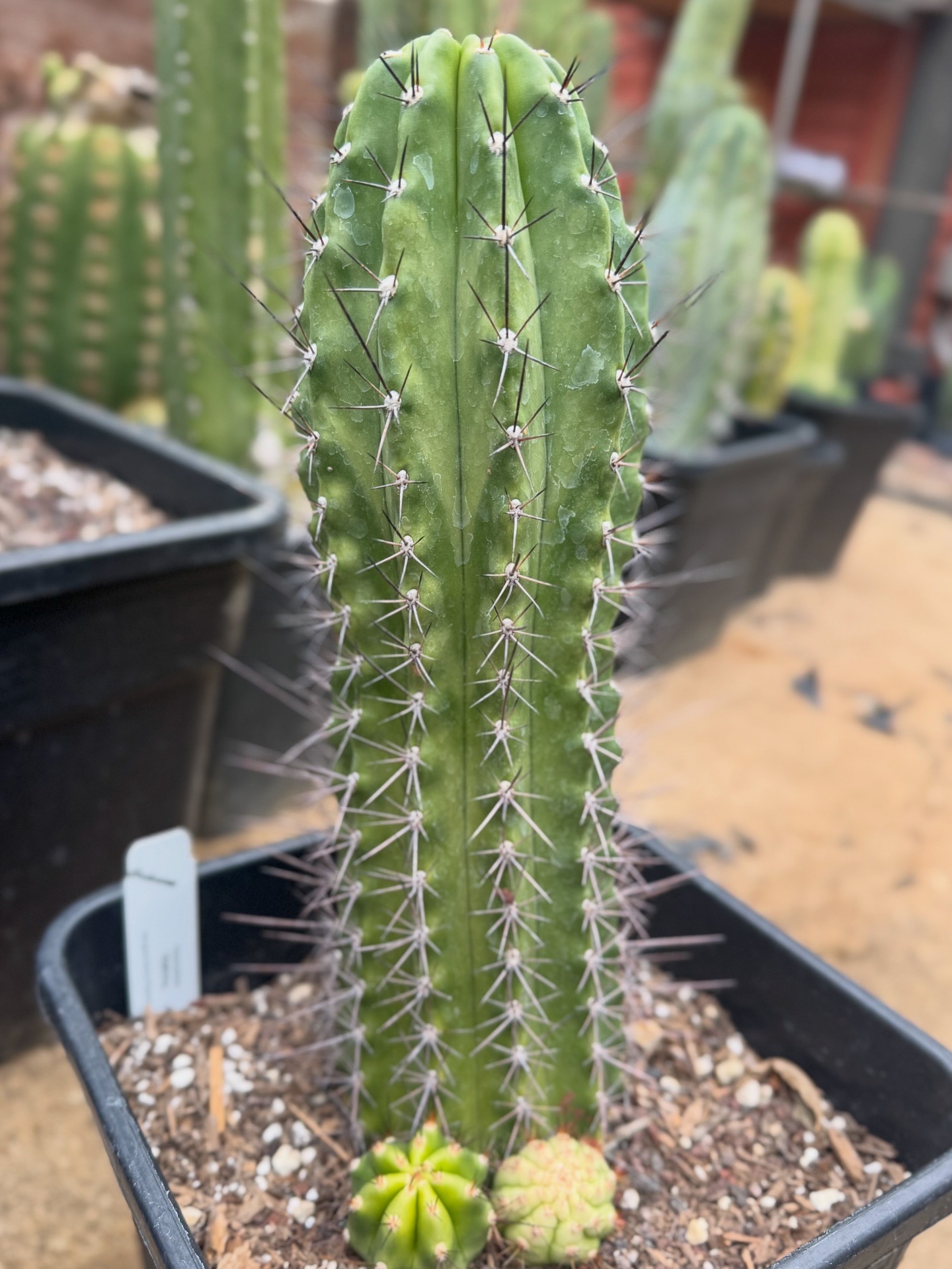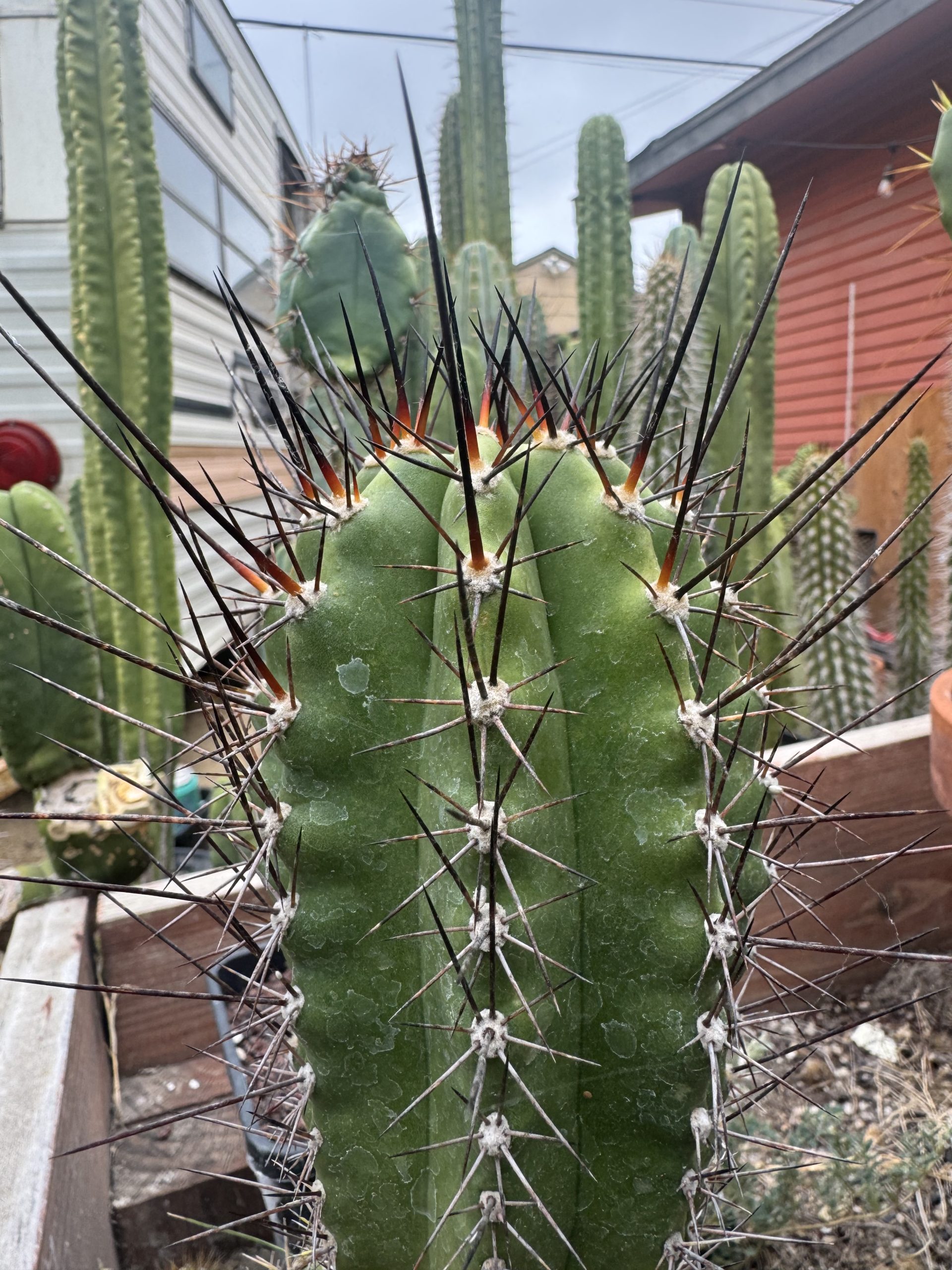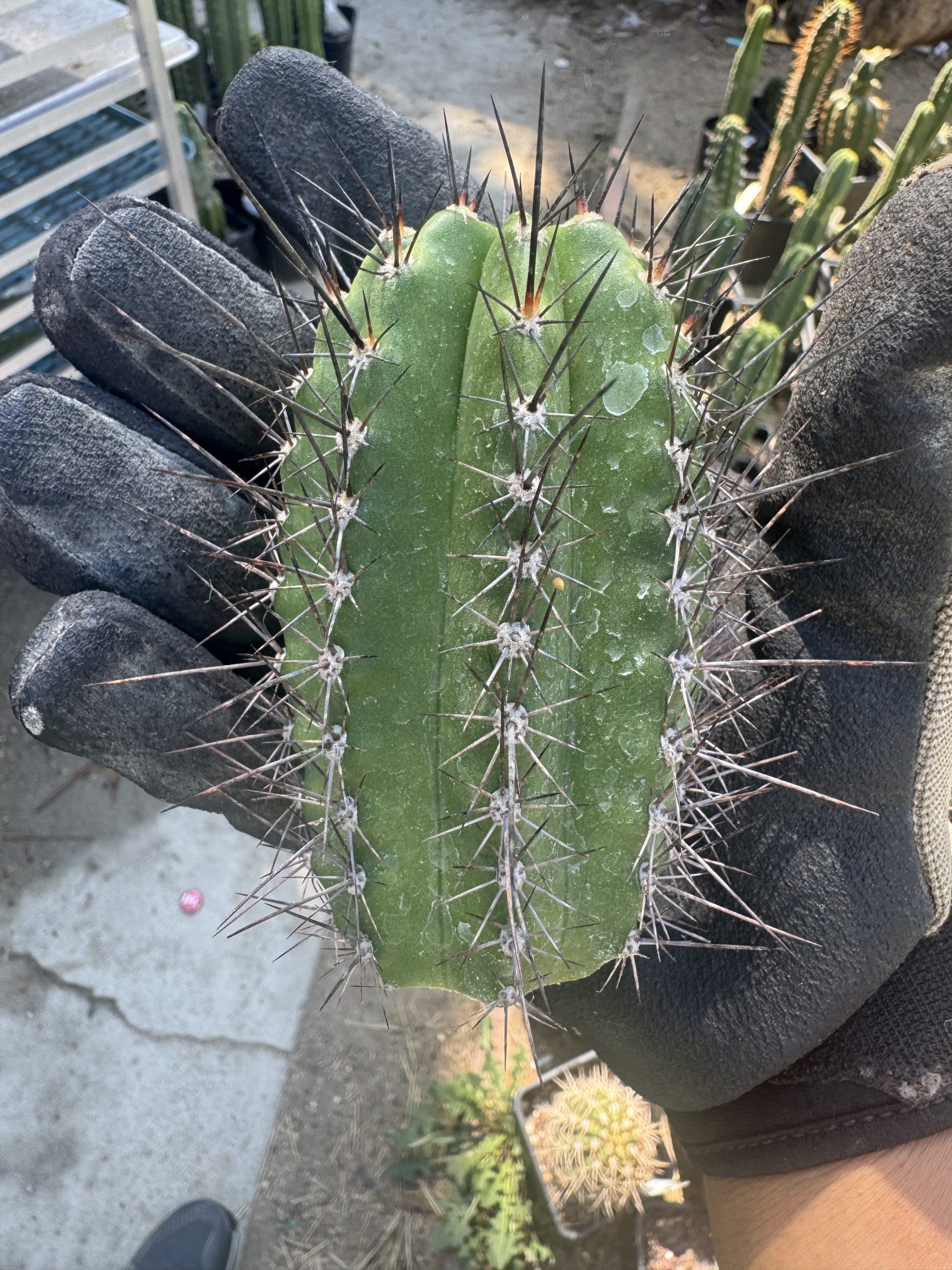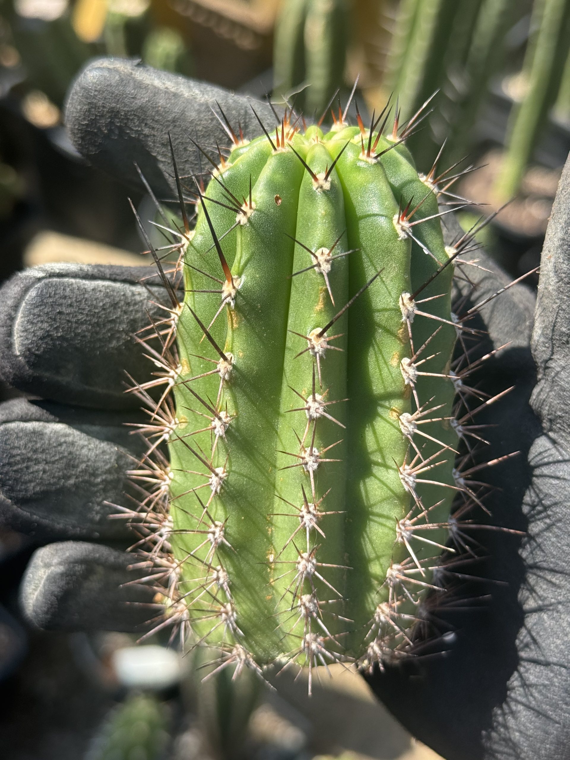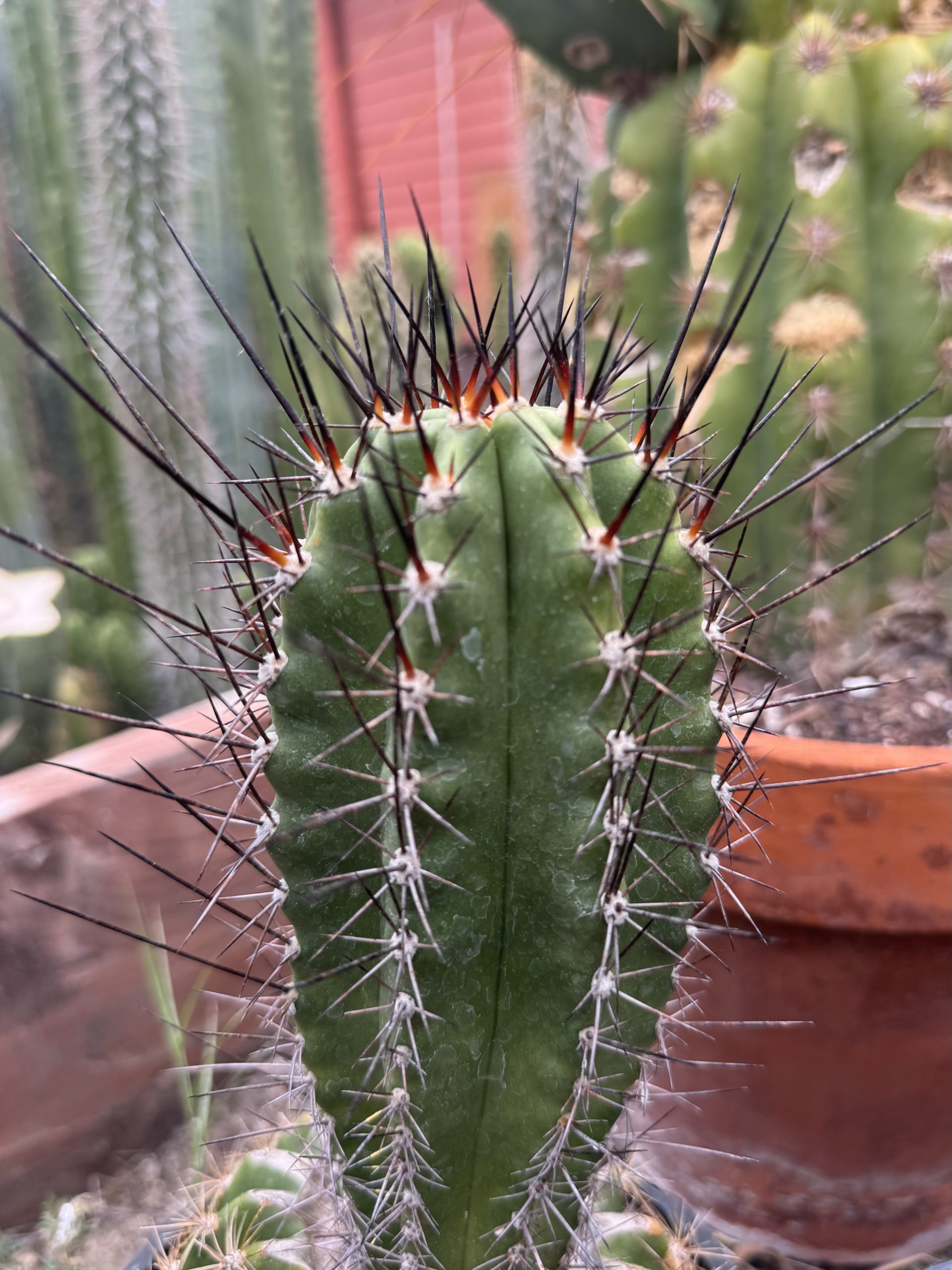 Vishnu is an Australian “intergenetic“ clone. A Psycho0 bridgesii got crossed with a Lobivia sp. and made this wild black and red spined colorful flower hybrid. The flower that comes from this is a nice peachy orange you want to see. But even then, the wildly long black spines are killer