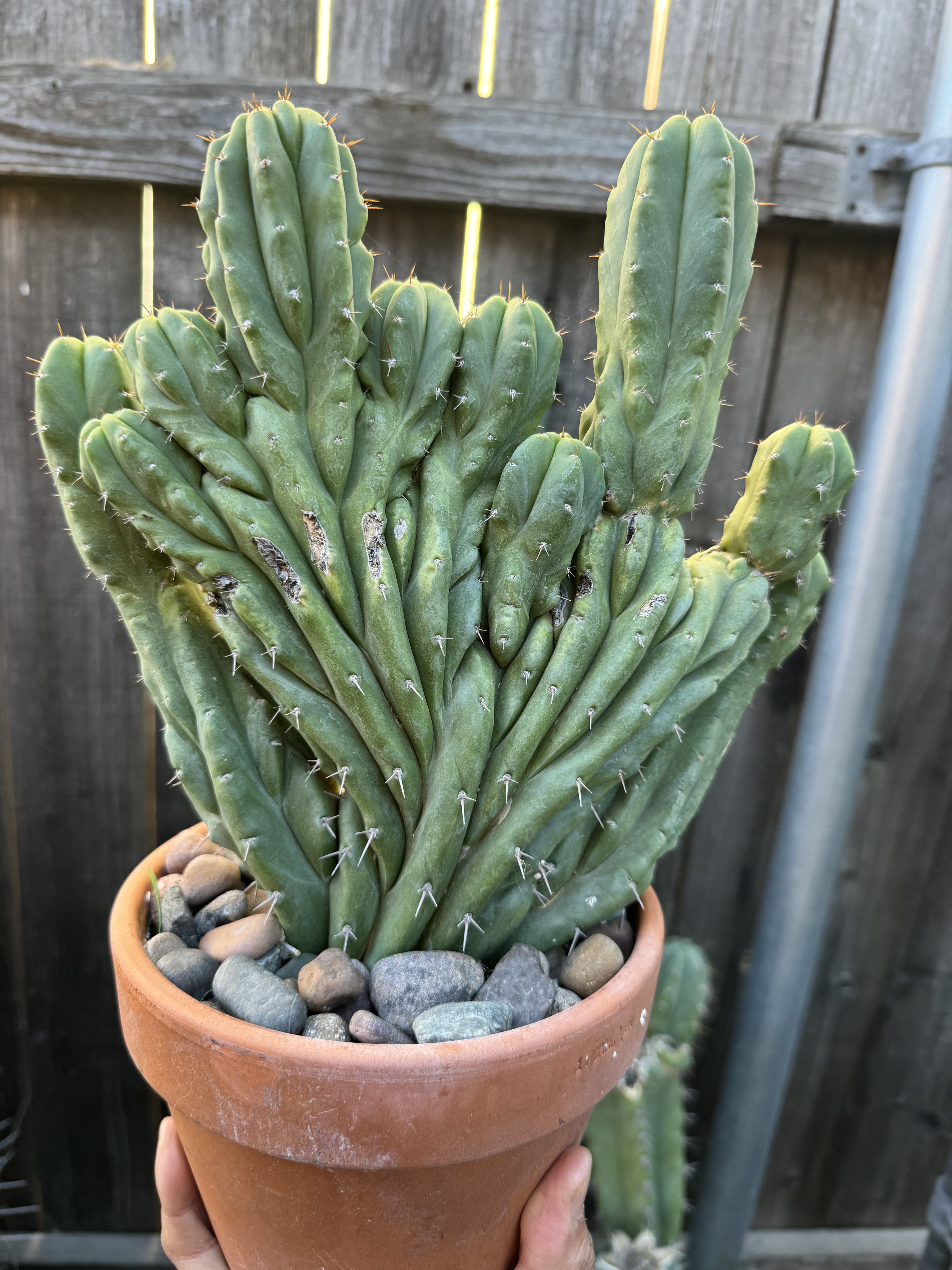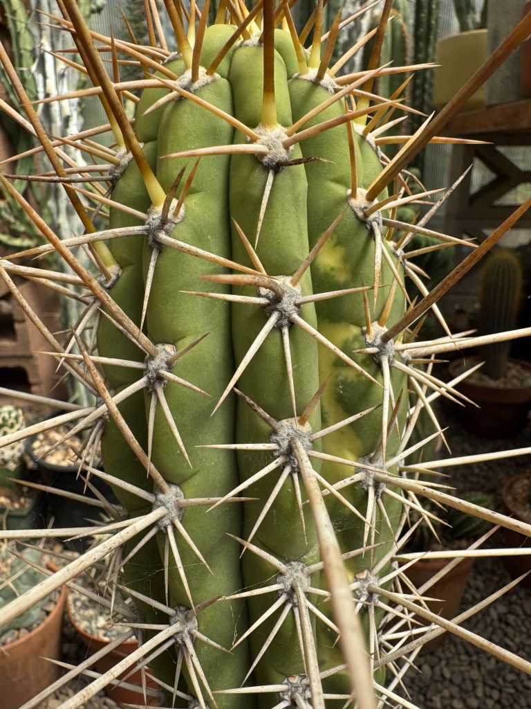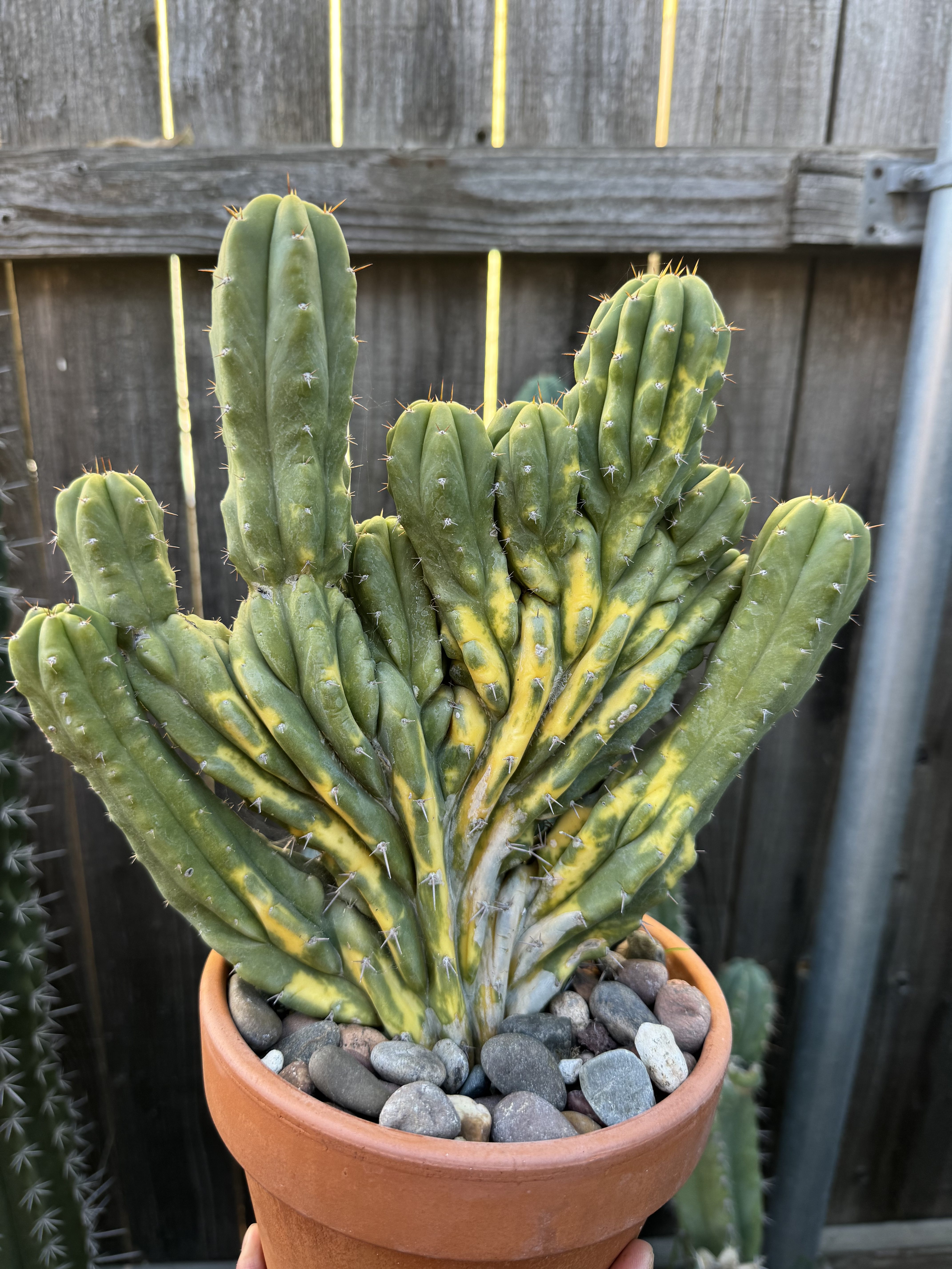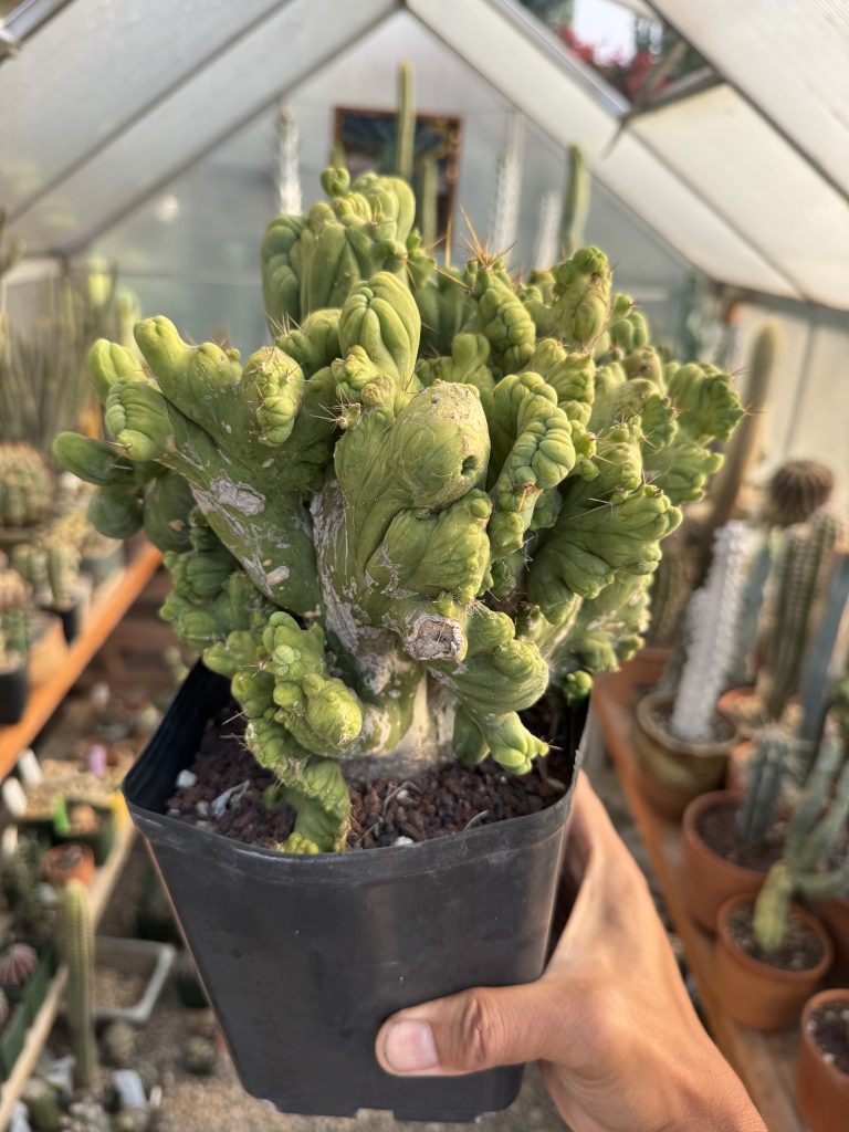Dr. Funkenstein was once a seed grown variegated plant originating from Australia. The genetics would show variegation, and then rarely you’d see some monstrose cristata shape. This one here came from my own propagation that variegated, then the crest ended up looking like this candelabra. Variegation on one side as you can see. This has been on its own roots for a few years now, and you will rarely ever see anyone offering more than a cutting.