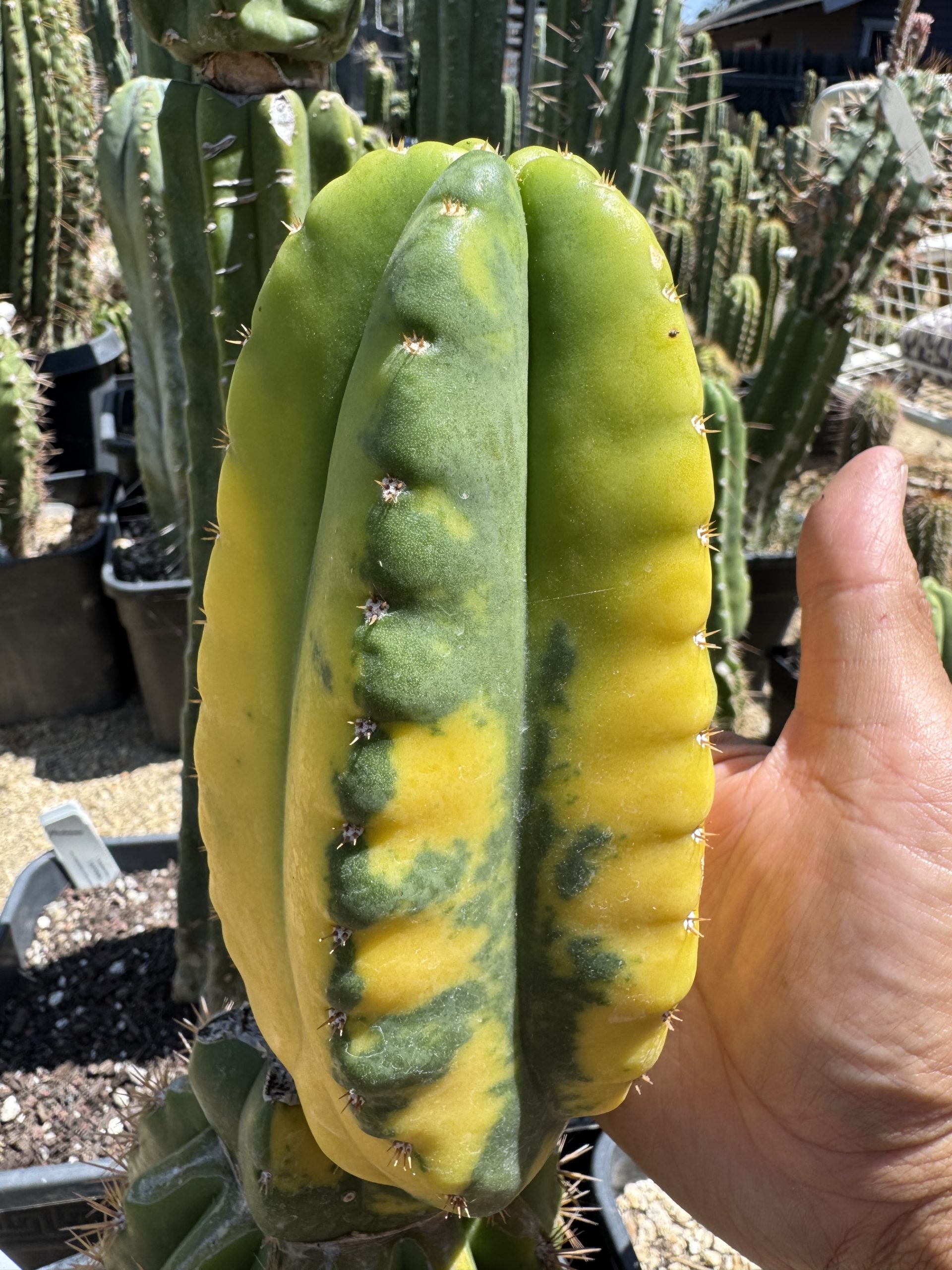 A seed grown scopulicola hybrid discovered here in the Prickocereus garden. MasterB x TPM genetics sown by us. The smooth ribs short spines and almost gleaming epidermis make this a very unique variegated plant. Develops a very nice notch above the areoles. The pattern is gorgeous and will root well like the others. Still very few in cultivation as I’ve only released a few and I can barely keep it in stock.