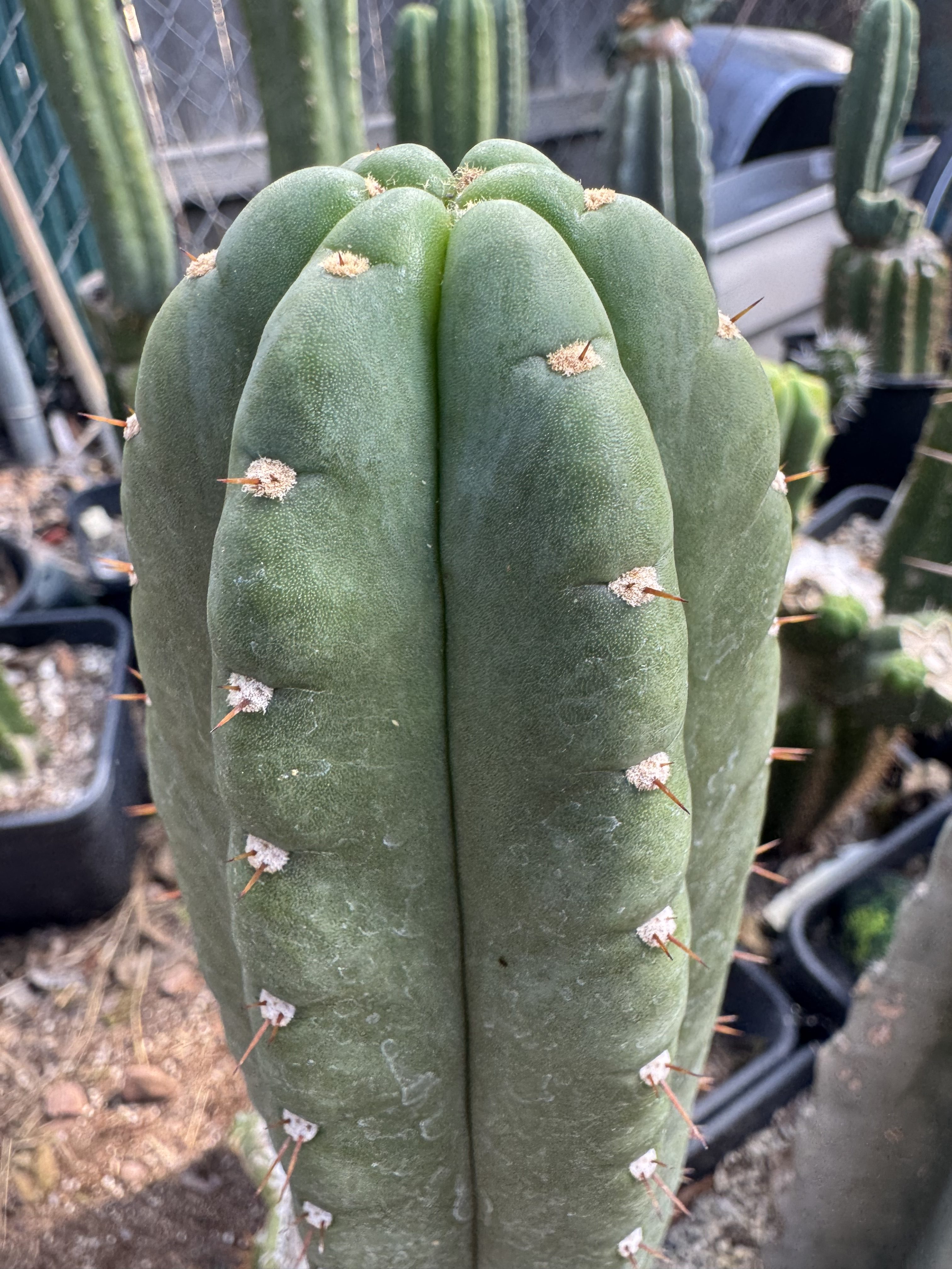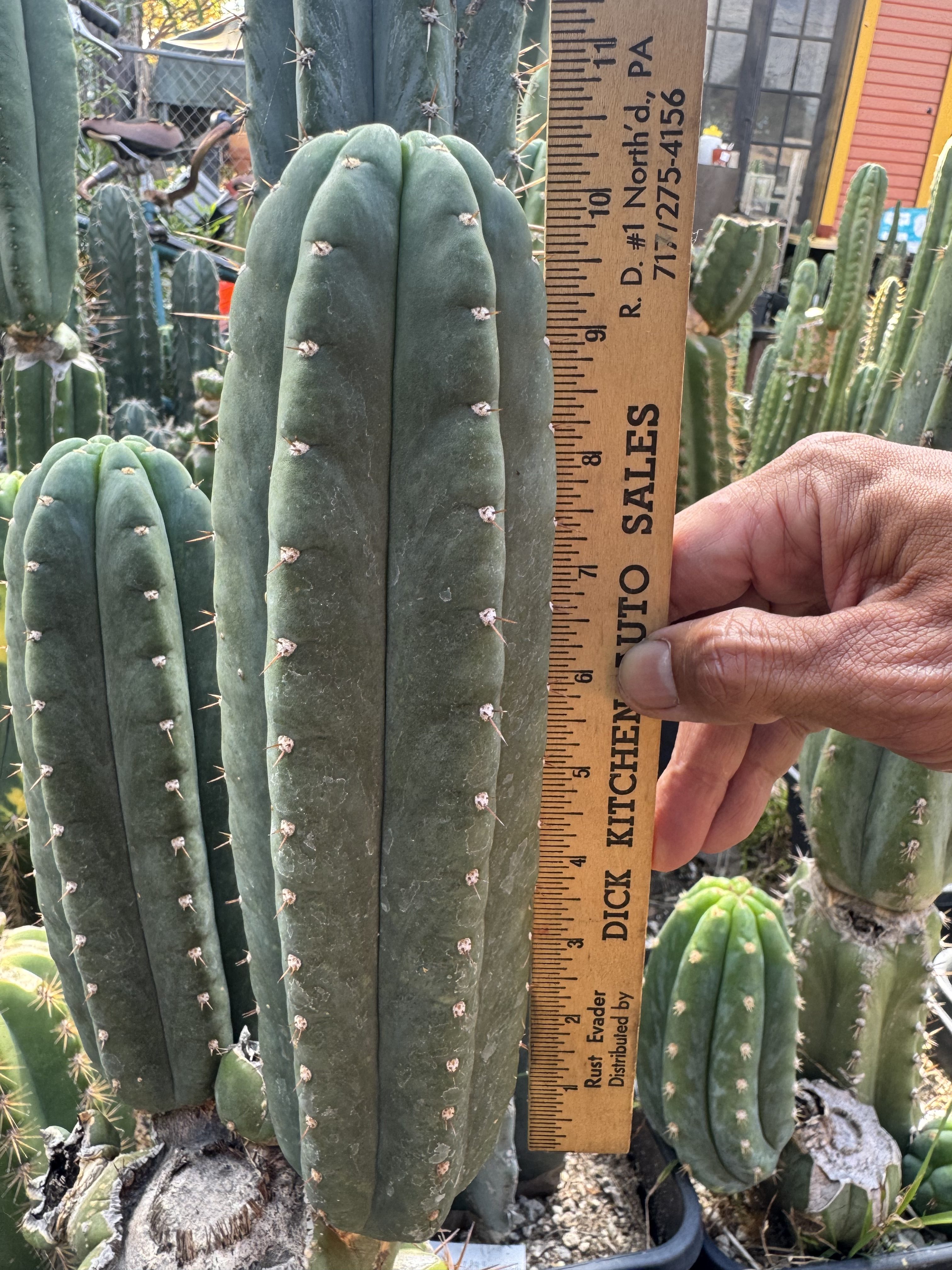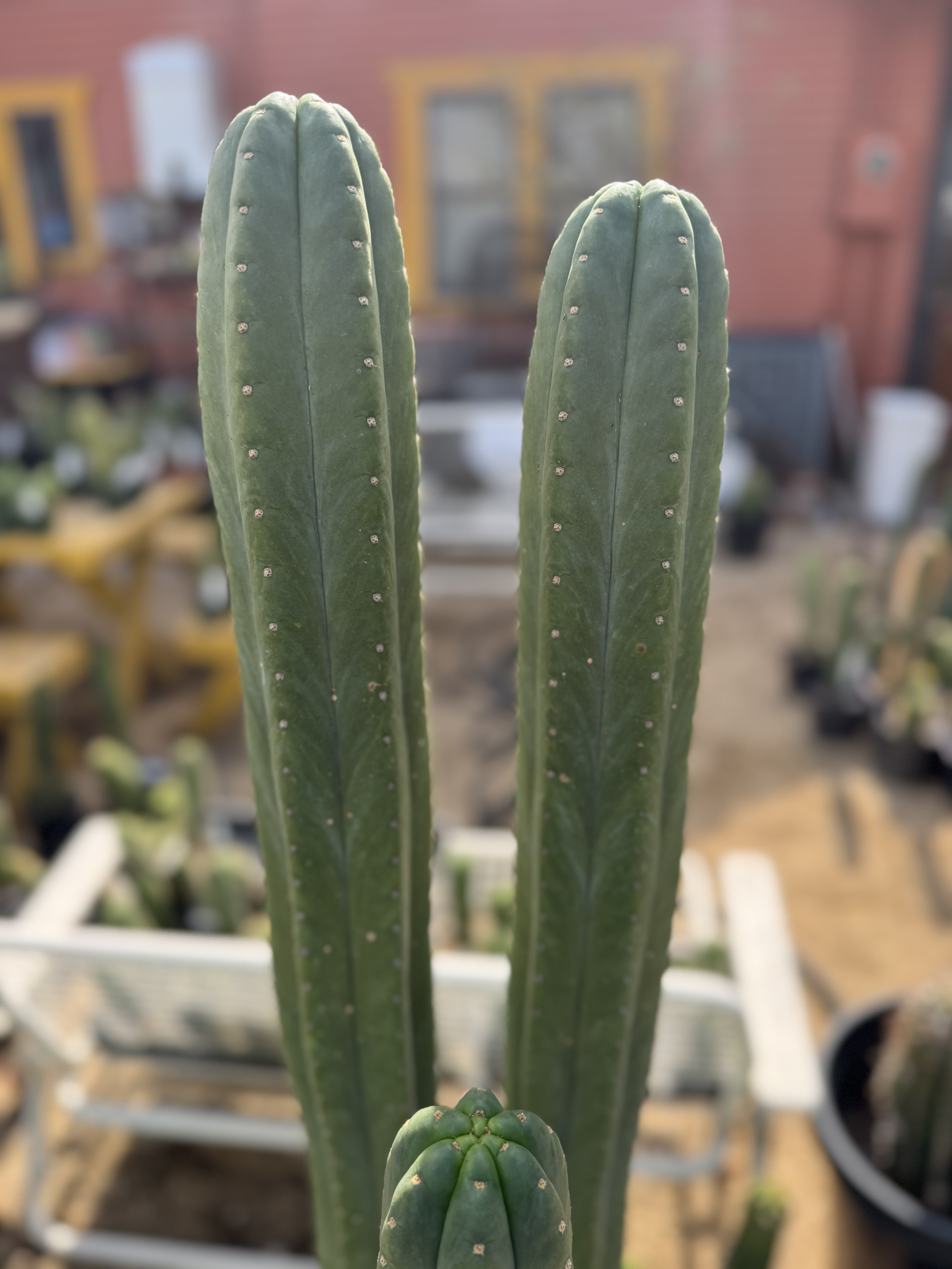 Vilcabamba b or Vilcabamba 1 is a pachanoi from Ecuador. A very specific clone that came from Pedro Park’s garden in Spain that has a lovely provenance story to it that is shared with anyone who obtains it. Ecuadorian pachanoi’s have a unique form to them that distinguishes them from the Peruvian pachanoi smooth straight profile and short spined phenotypes. Nice white areoles, notching, and a seemingly darker skin tone.