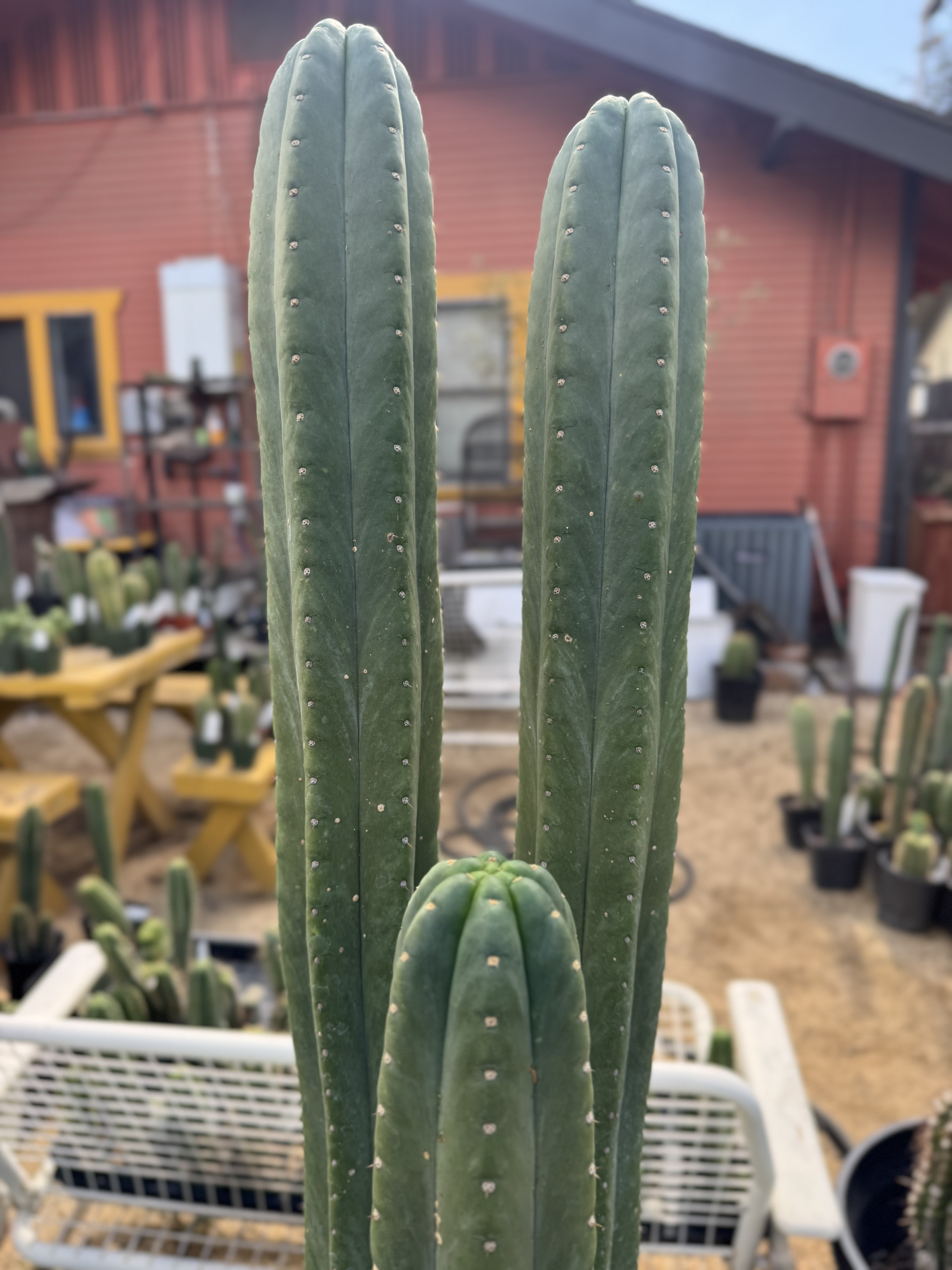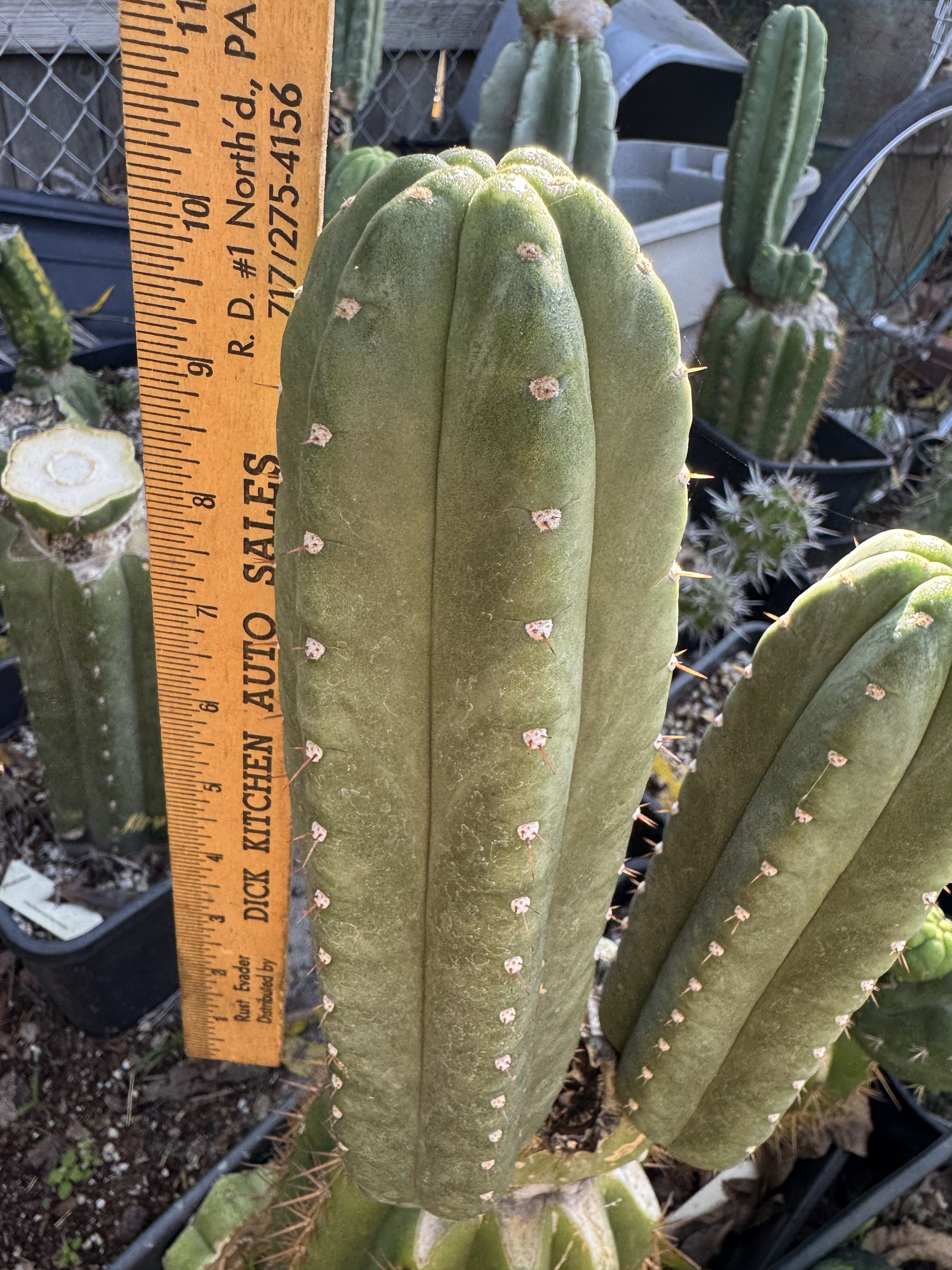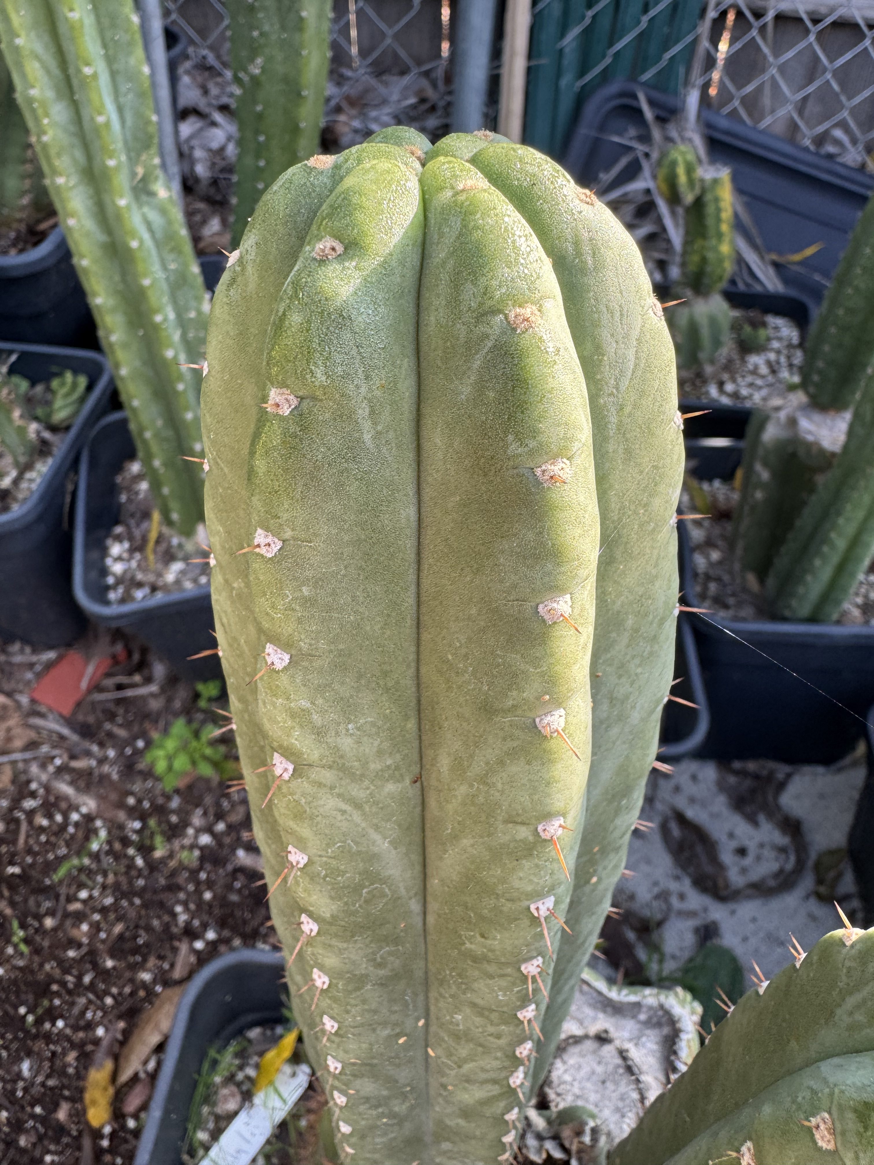 Vilcabamba b or Vilcabamba 1 is a pachanoi from Ecuador. A very specific clone that came from Pedro Park’s garden in Spain that has a lovely provenance story to it that is shared with anyone who obtains it. Ecuadorian pachanoi’s have a unique form to them that distinguishes them from the Peruvian pachanoi smooth straight profile and short spined phenotypes. Nice white areoles, notching, and a seemingly darker skin tone.