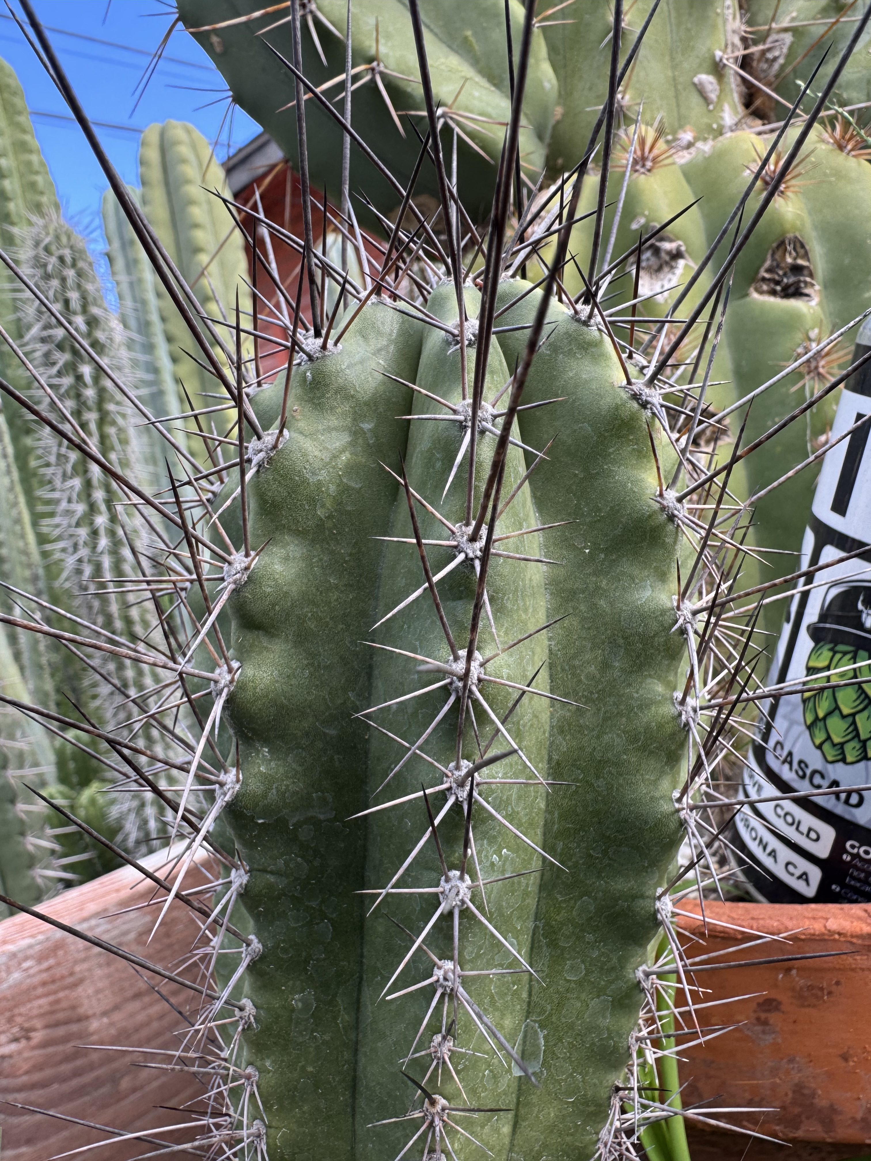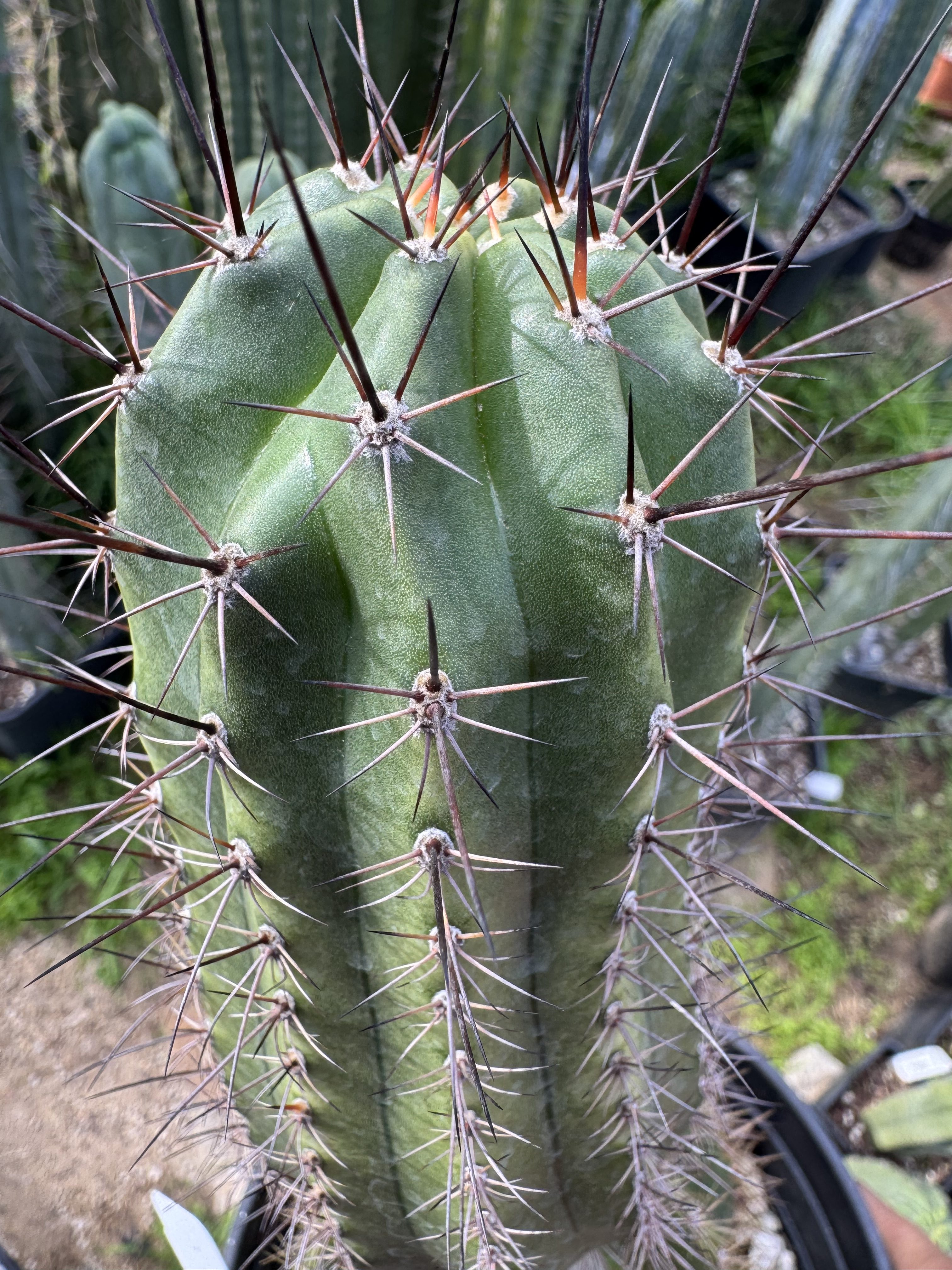 Vishnu is an Australian “intergeneric“ clone. A Psycho0 bridgesii got crossed with a Lobivia sp. and made this wild black and red spined colorful flower hybrid.   The flower that comes from this is a nice peachy orange you want to see.  But even then, the wildly long black spines are killer
