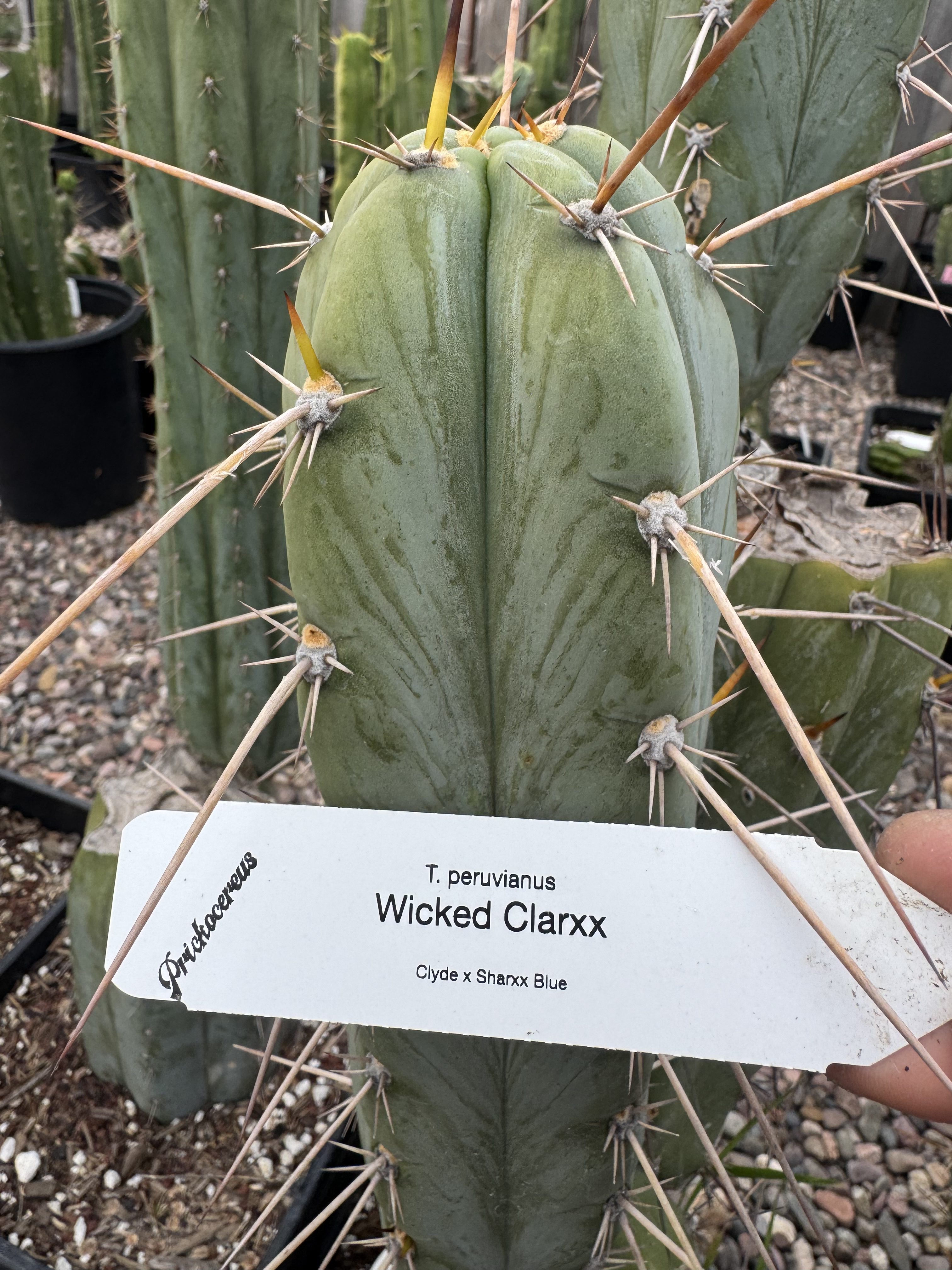 Wicked Clarxx is a specific clone of Clyde x Sharxx Blue that was propagated by AD.  This one when it was growing in 10 hours of sun, was making some obscenely long spines.  The pure peruvianus genetics from this cross has made some very nice blue and spiny phenotypes.  This one was a stand out that got cut and rooted.  Much bluer than some other Clyde x Sharxx Blue I’ve seen in full sun.