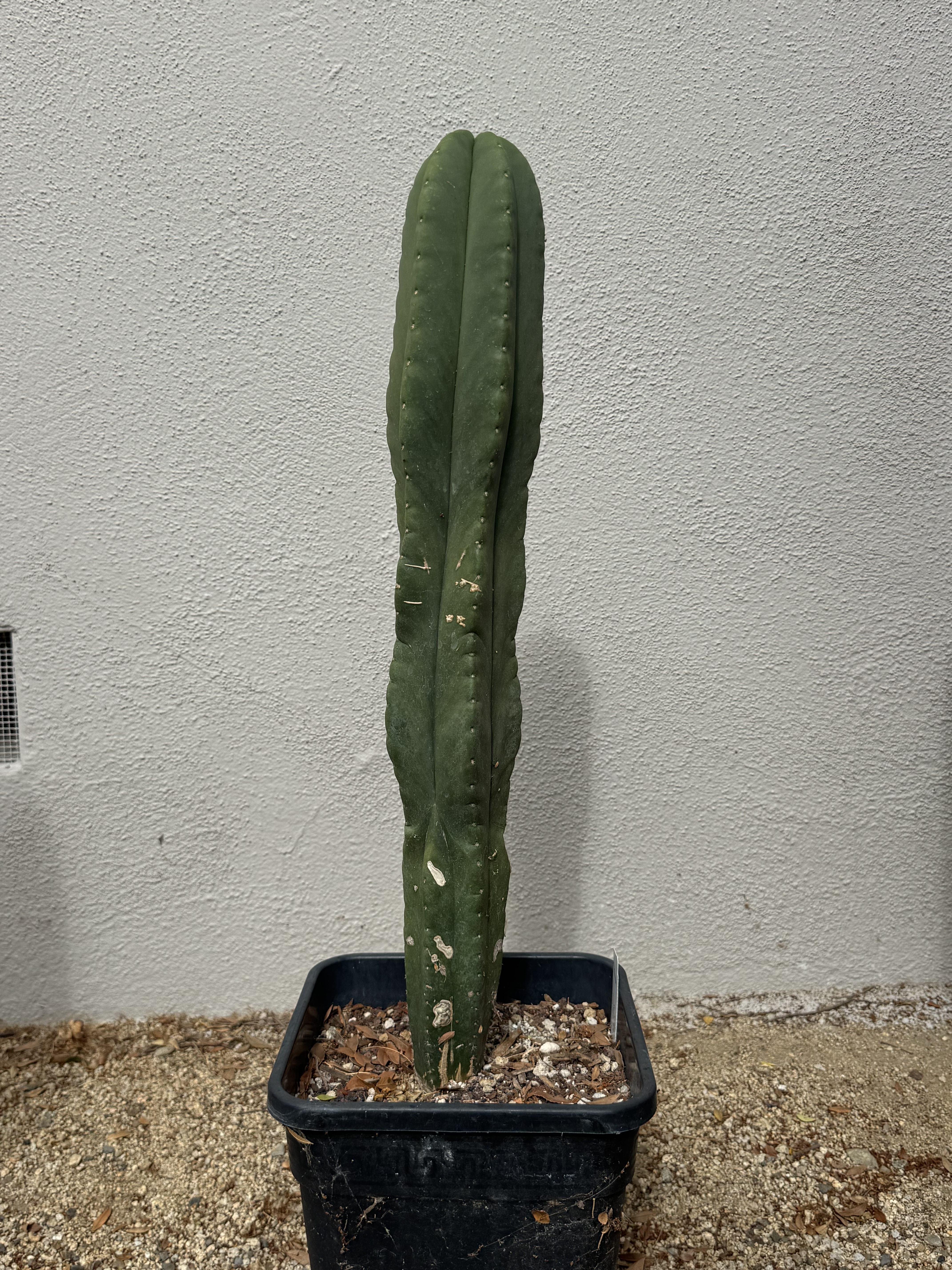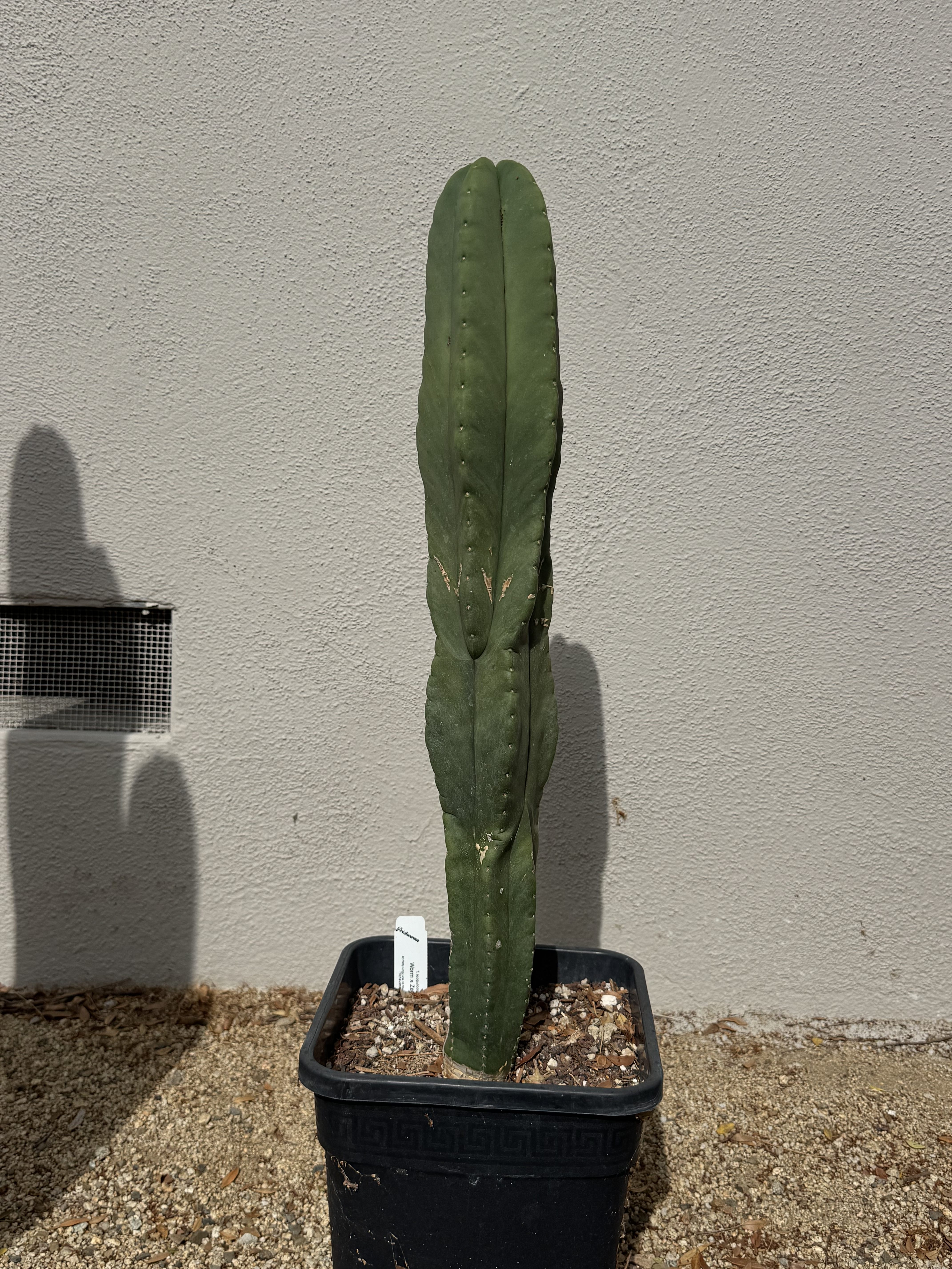 Worm x Zed’s T. scopulicola .  A seed grown scopulicola from Australian seed that Gus Freeman had created.  It’s got an amazing shape to it with it’s leathery green skin.  Everyone wants a good whole plant roots and all.  Great form on this one, check out the profile of that tip.      20 inches tall in an 2.5 gallon 9 inch pot.