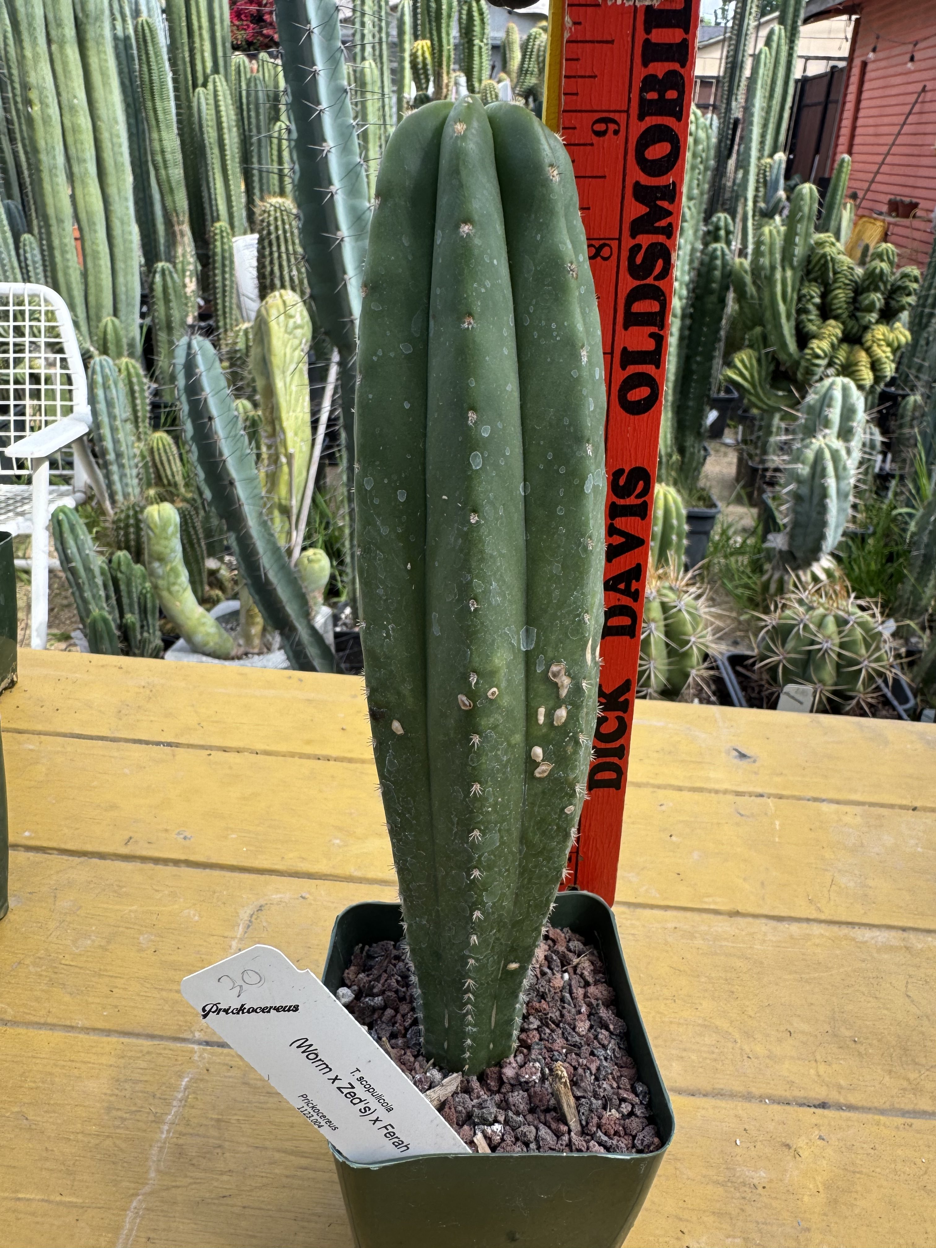 Seed grown Trichocereus scopulicola made in our garden. (Worm x Zed’s) x Ferah has made some very nice short spine phenotypes. Three way full scop genetics made here in Southern California, Glad to grow out these genetics. The very smooth sometimes leathery skin, and very short spination is a fan favorite of Echinopsis collectors. Sown here in our garden.